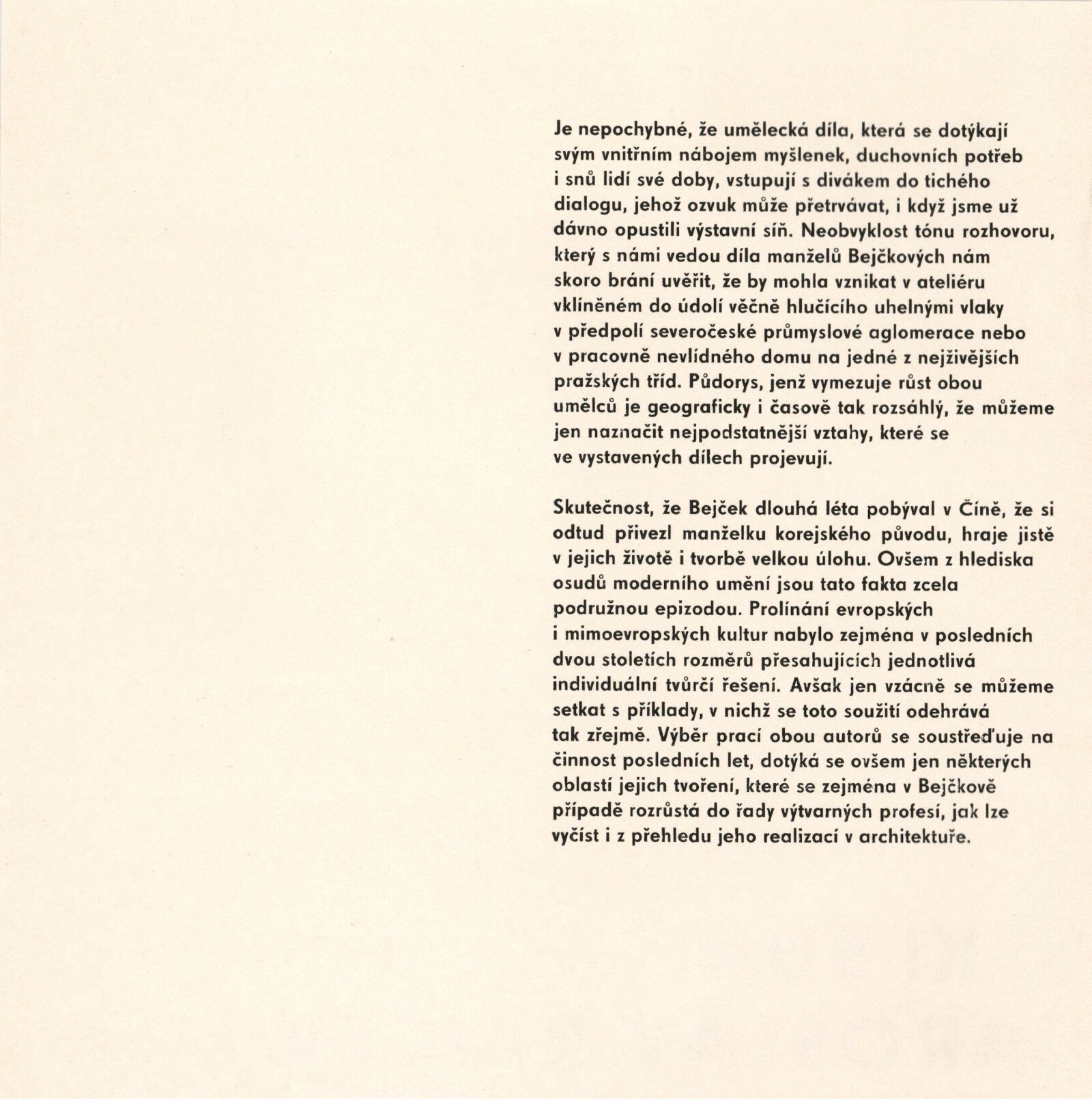 pozvánky, katalog, katalogy výstav (Jaroslav Bejček, květen–červen 1796, Oblastní galerie v Liberci; Jaroslav Bejček, Galerie Václava Špály, Praha srpen–září 1976, Li Ki Sun Bejčková, Galerie Díla, Ústí nad Labem, 1967), seznam vystavených děl, fotografie vernisáže, fotoreprodukce děl, korespondence, provozní korespondence, žádost o povolení výstavy, smlouvy, reverzy, recenze v tisku
