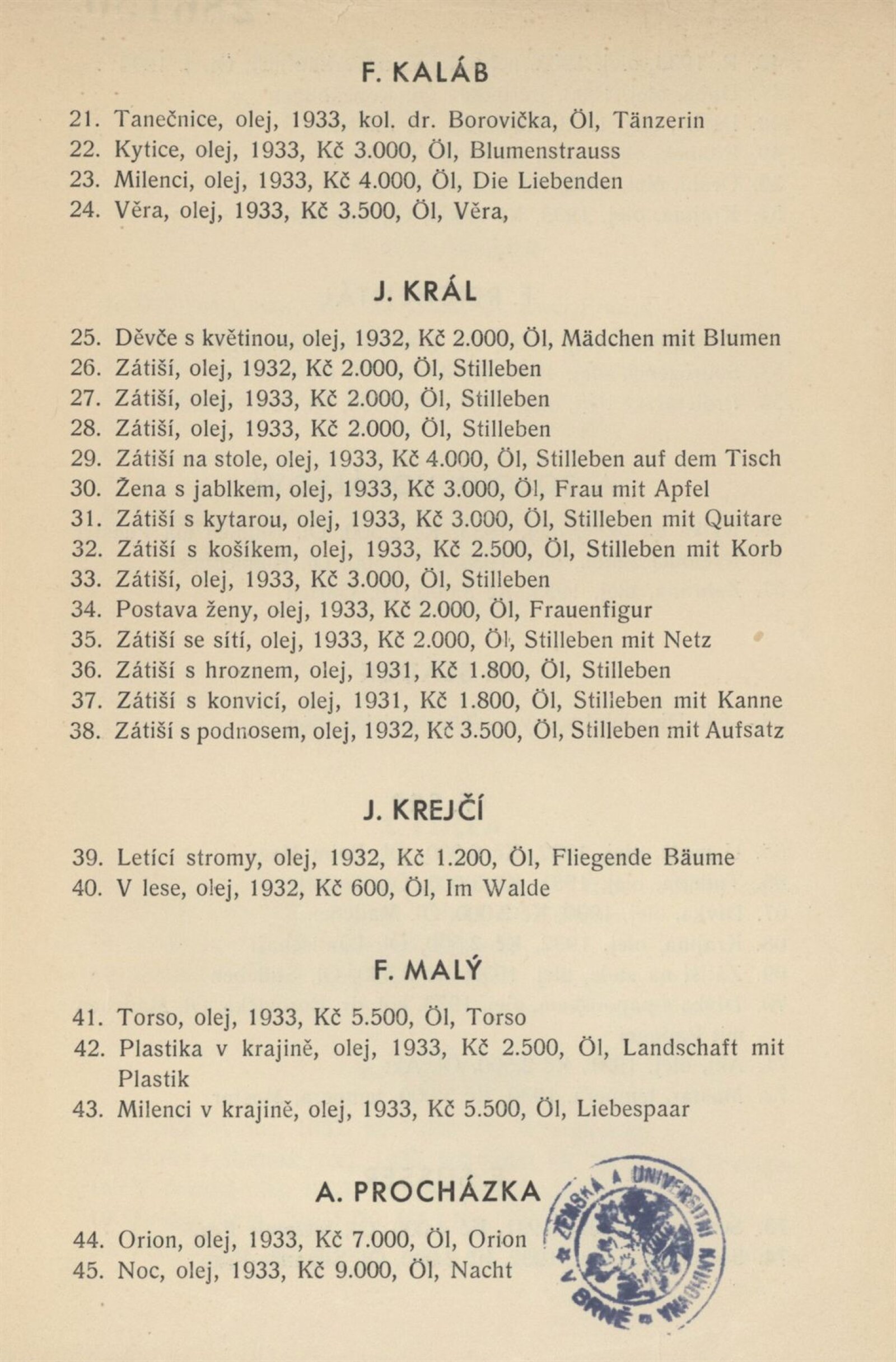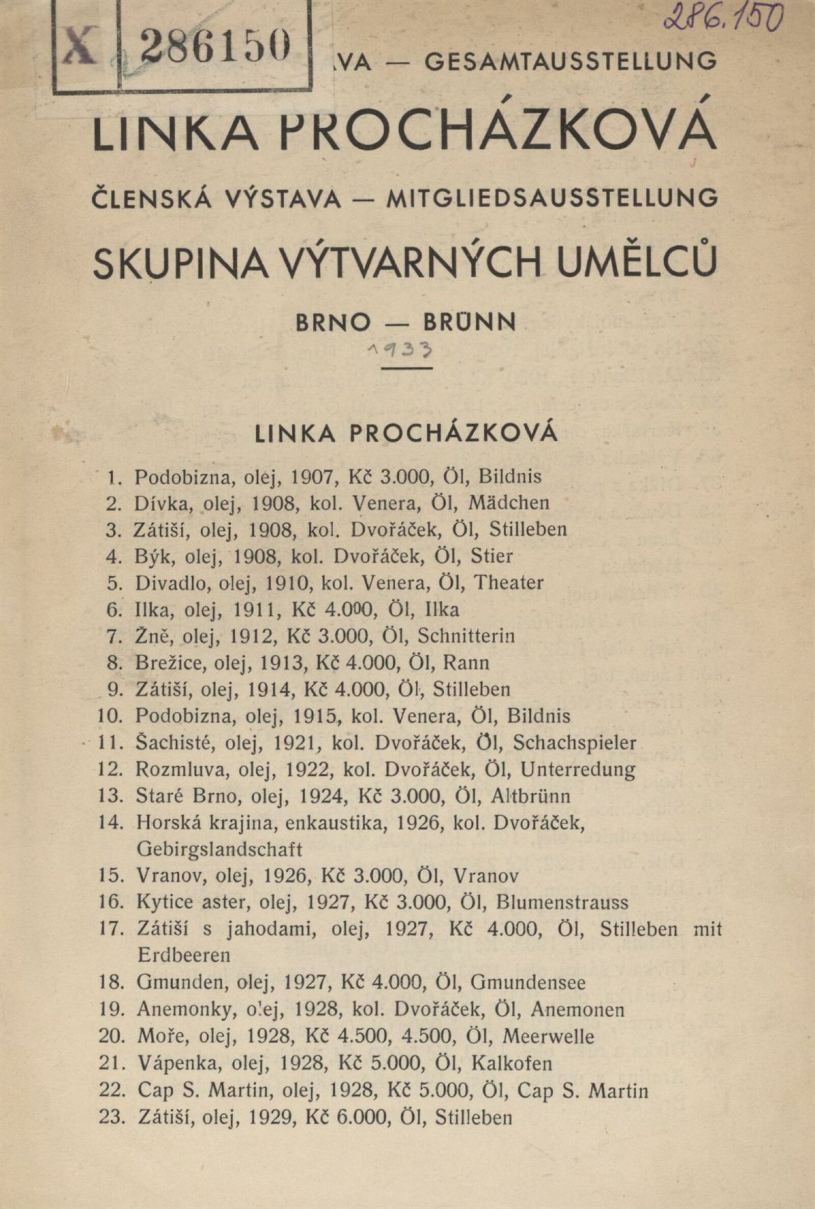 Souborná výstava Linka Procházková, členská výstava Skupina výtvarných umělců Brno: Künstlerhaus, 3. 9. – 16. 9. 1933 / skládačka, 6 s. Souběžný text německy. – MZK; MG; MMB, AMB