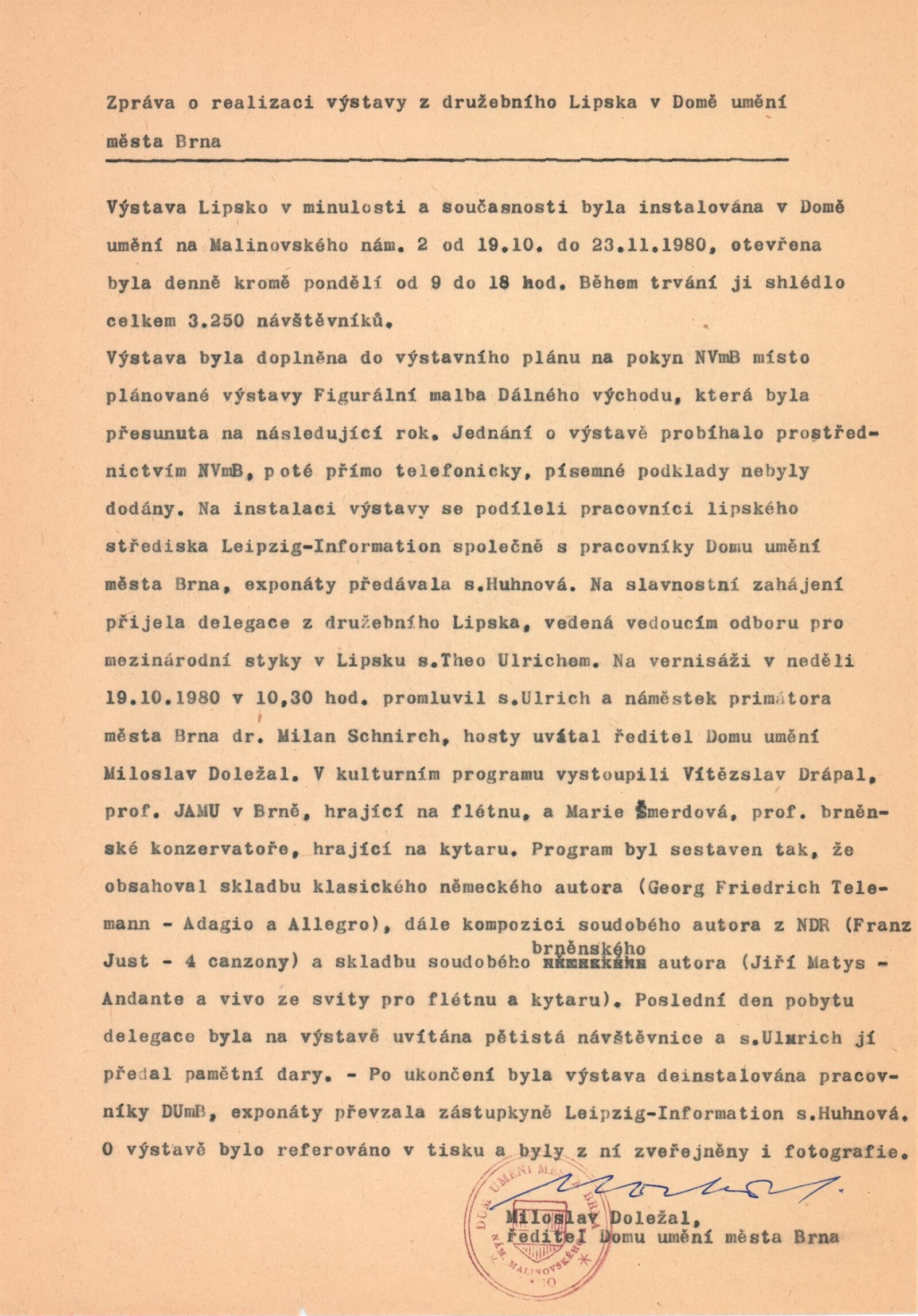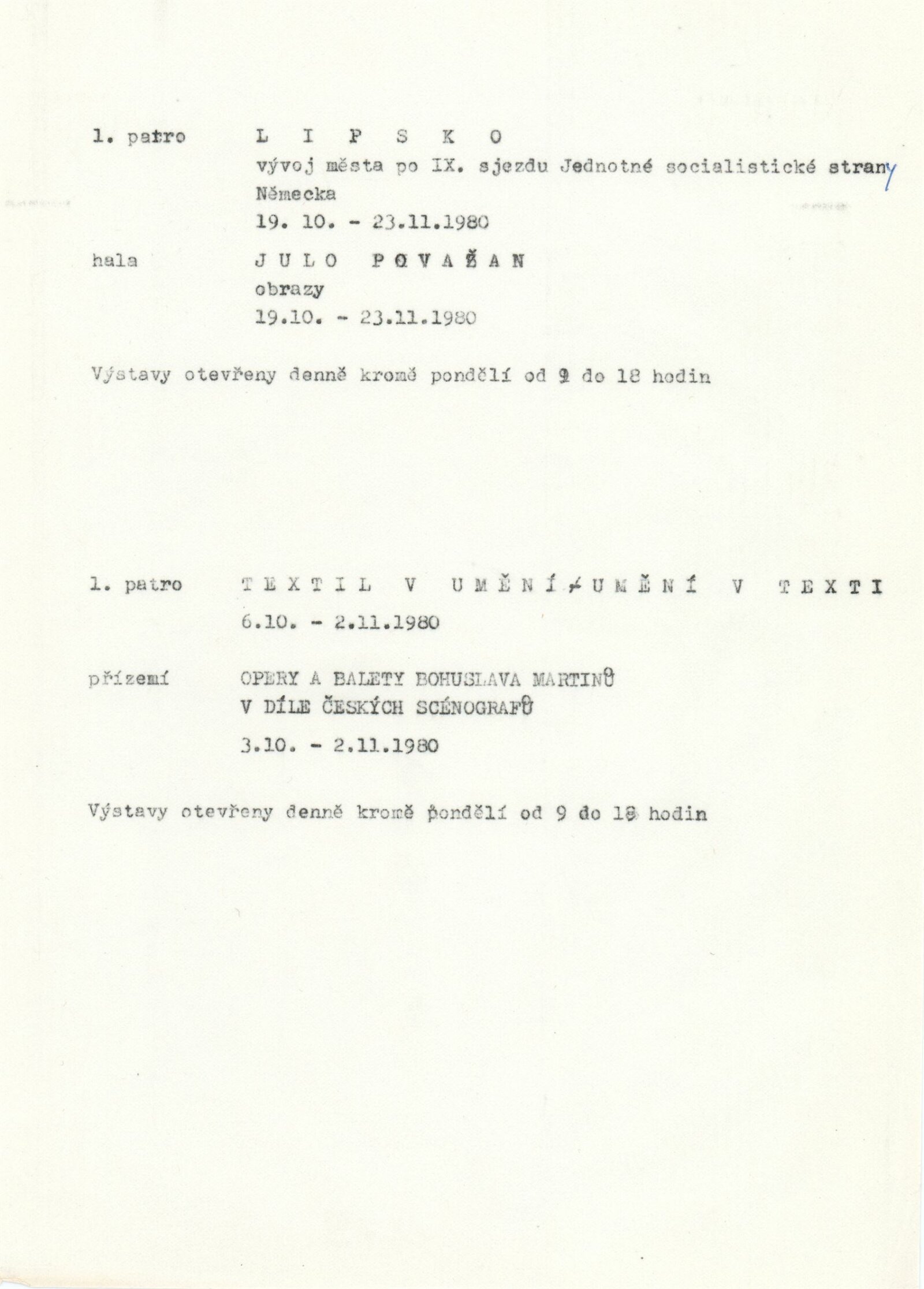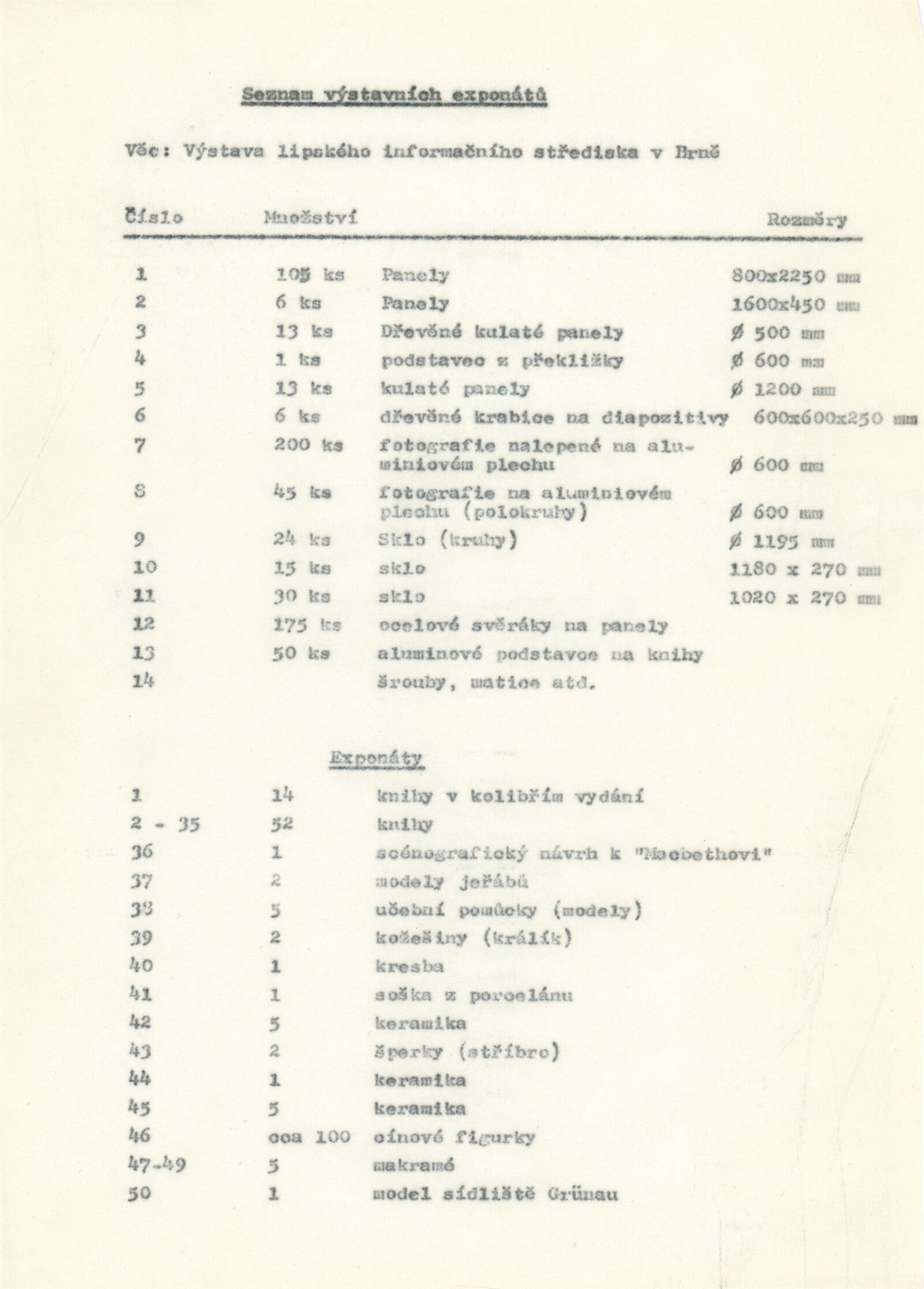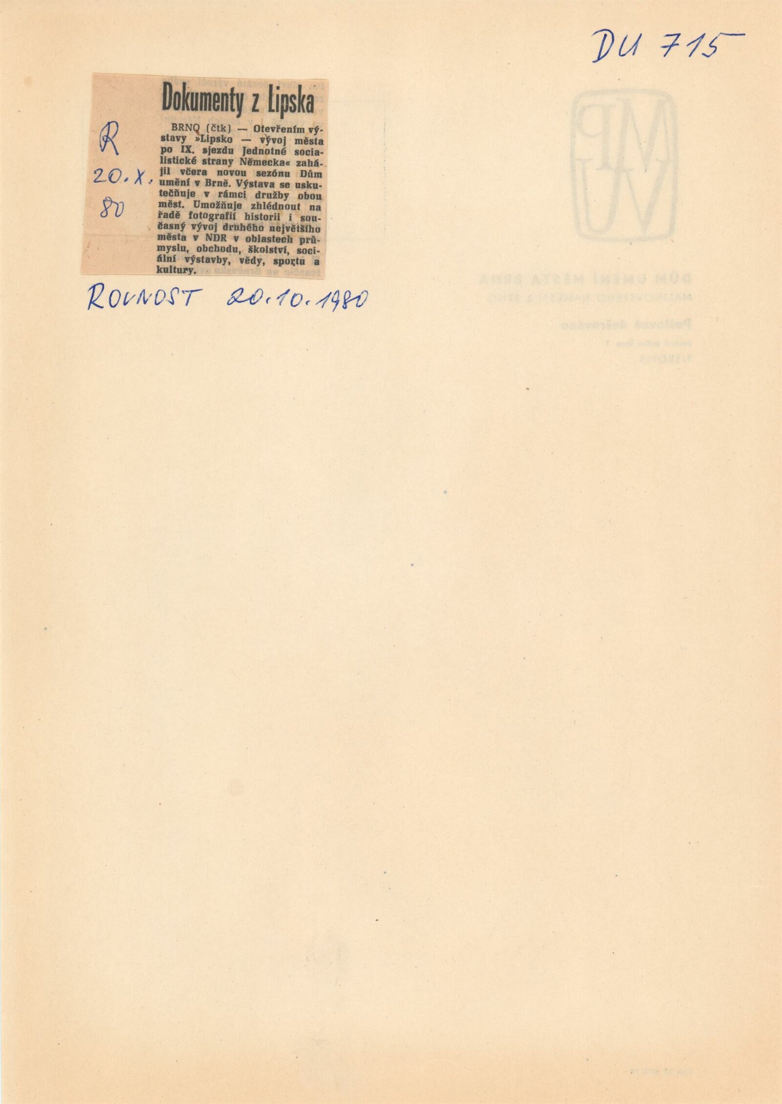 plakát (společný pro DU 715, 716, DPK 741, 742), strojopis pozvánky, seznam exponátů, zpráva o realizaci výstavy, prohlášení o schválení výstavy odborem kultury, provozní korespondence (výjezd zástupců DU do NDR), žádost o povolení výstavy, záznamy telefonické komunikace, recenze v tisku