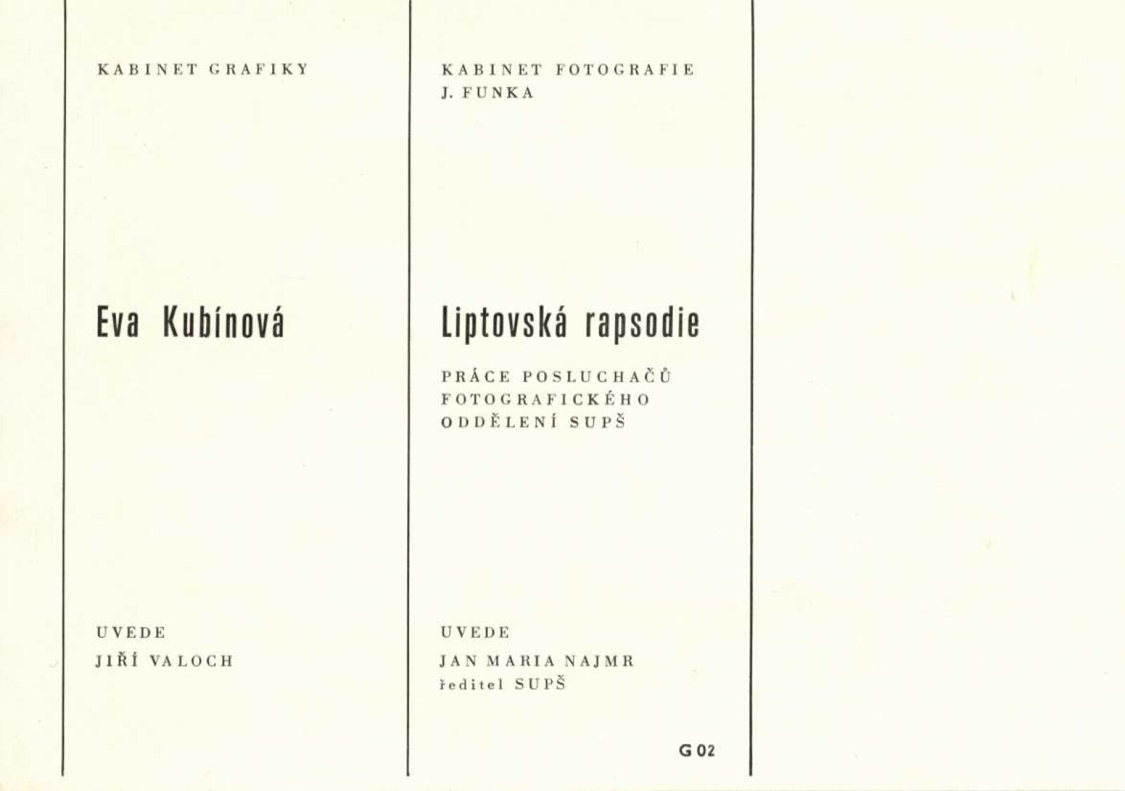 Liptovská rapsodie. Výstava fotografií. Střední uměleckoprůmyslová škola v Brně, oddělení fotografie: Dům umění města Brna / Dům pánů z Kunštátu, 119. výstava Kabinetu fotografie Jaromíra Funka, 4. 2. – 27. 2. 1972 / Text: Karel Otto Hrubý. – Brno: Střední uměleckoprůmyslová škola, 1972. – 12 s., obr., DPK 497