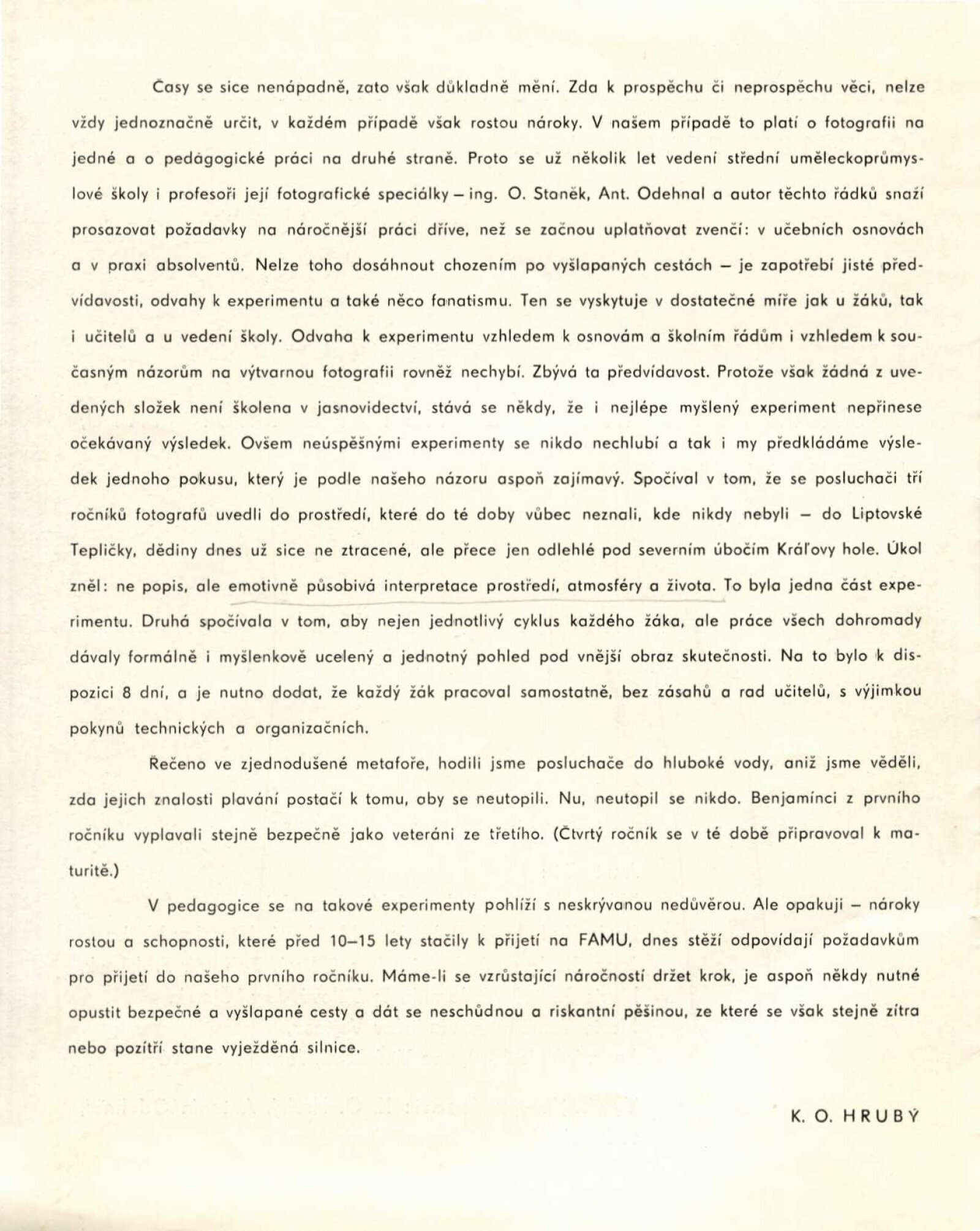 V textu katalogu k výstavě, která prezentovala výsledky významného projektu oddělení fotografie, zmiňuje Karel Otto Hrubý motivace i výsledek tohoto v kontextu dosavadní praxe mimořádného počinu. Zdůrazňuje záměr pedagogů oddělení nepracovat se studenty jen v rámci stávajících učebních osnov, ale důležitost experimentovat, odvahu nacházet nové směřování výuky, což v rámci tehdejšího středoškolského prostředí nebylo obvyklé. Studenti prvního až třetího ročníku vytvořili během pobytu v prostředí do té doby jim zcela neznámém rozsáhlý soubor prací, kterými reagovali na život a krajinu Liptovské Tepličky. Jejich úkolem nebylo vytvářet popis, ale emotivní interpretaci prostředí, života obyvatel tohoto kraje, s přihlédnutím ke specifickým rysům tohoto regionu. Dalším požadavkem byl vznik souboru, obsahující práce, které by formálně i myšlenkově dávaly ucelený, jednotný pohled, jdoucí pod povrch skutečnosti. Toto zadání bylo úspěšně realizováno jak začínajícími, tak pokročilejšími studenty, kteří se do oblasti Liptova pak sami vraceli i mnohem později, pro mnohé z nich to byl důležitý mezník v počátečním období jejich tvorby. (jv)