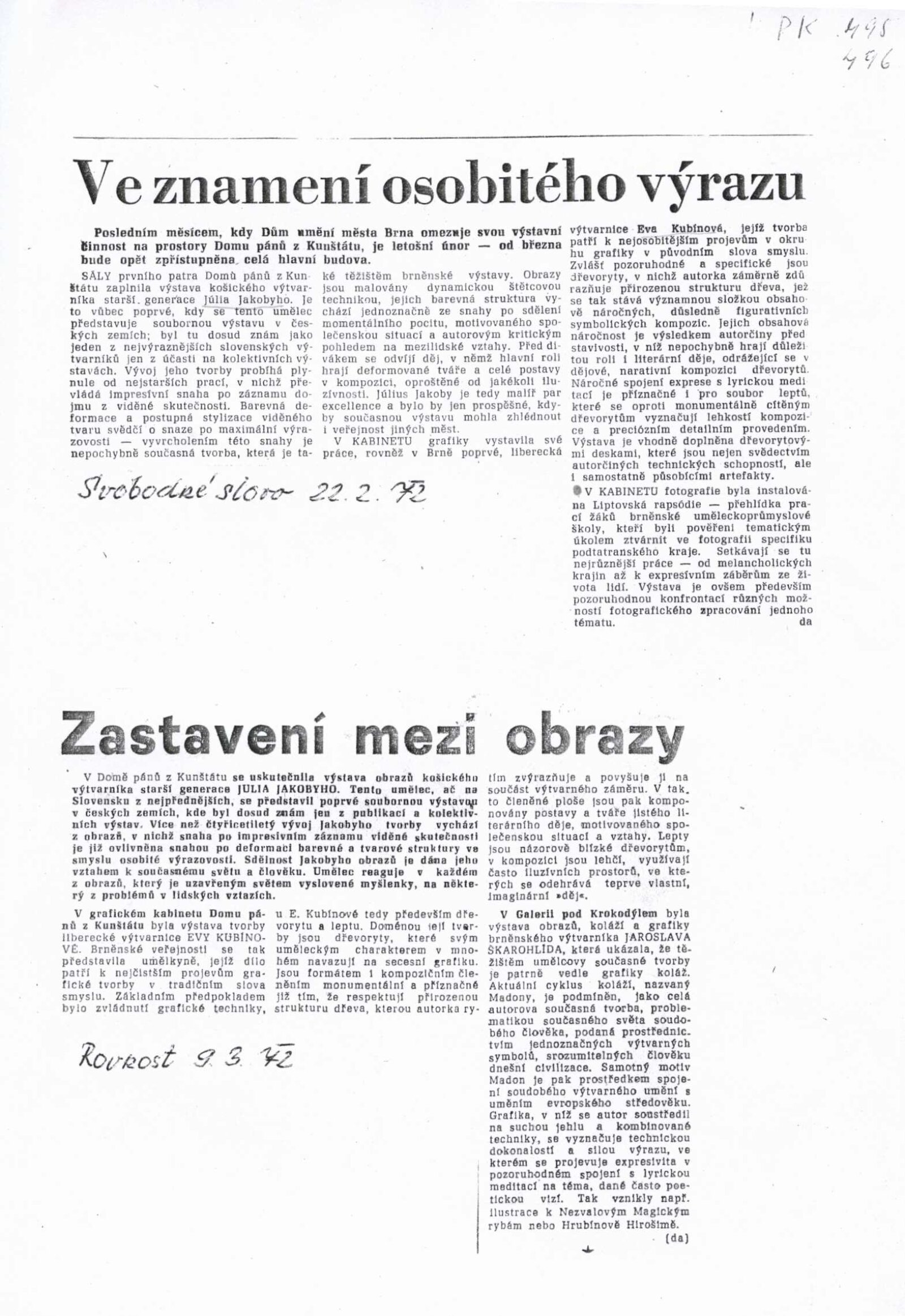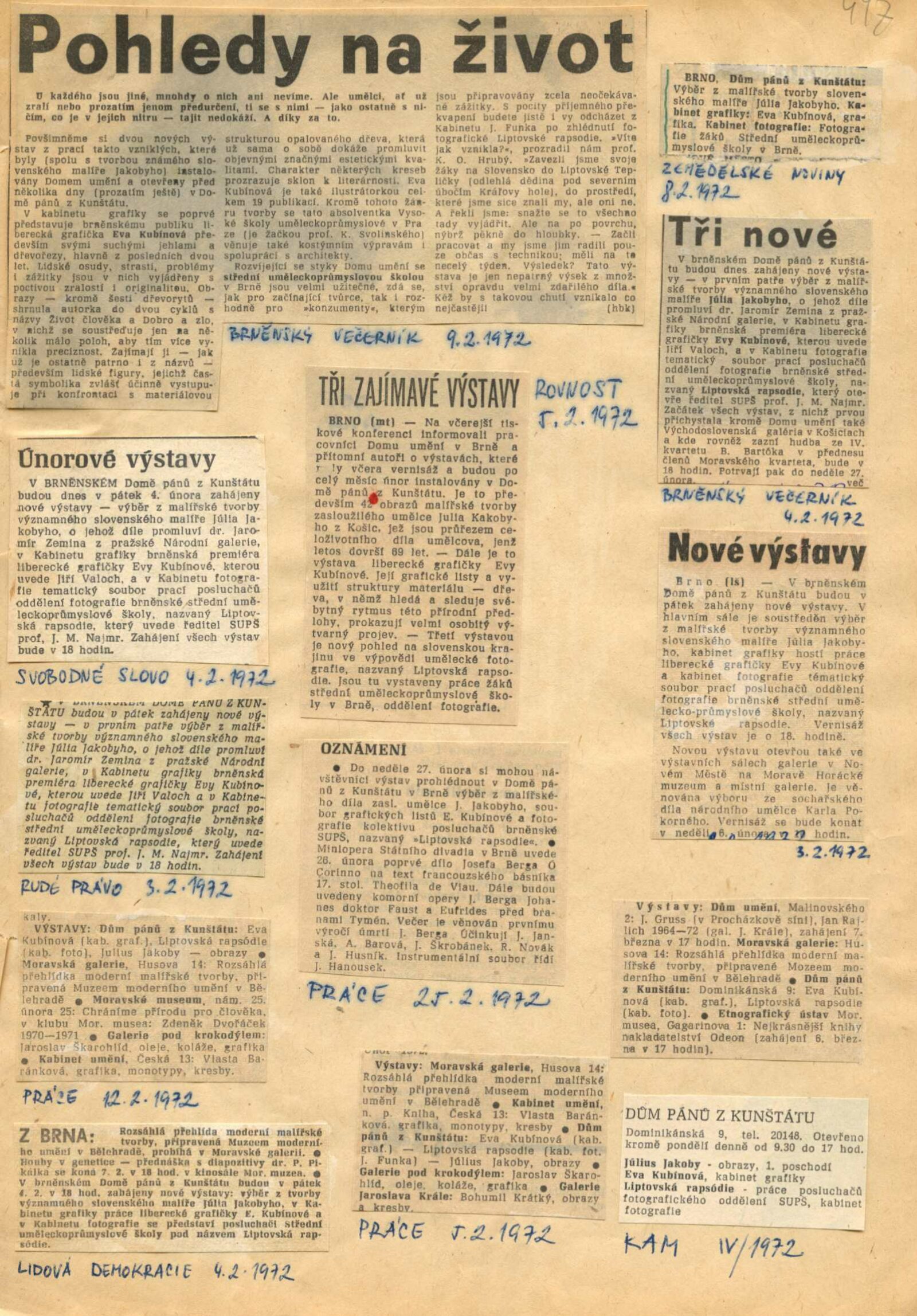pozvánky, katalog, fotografie instalace, návrh výstavy a dohoda o pořádání výstavy v Kabinetu fotografie, žádost o povolení výstavy, recenze v tisku