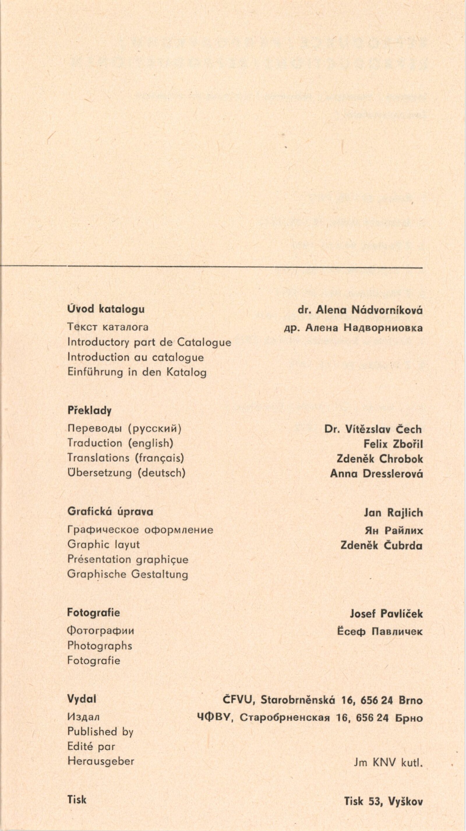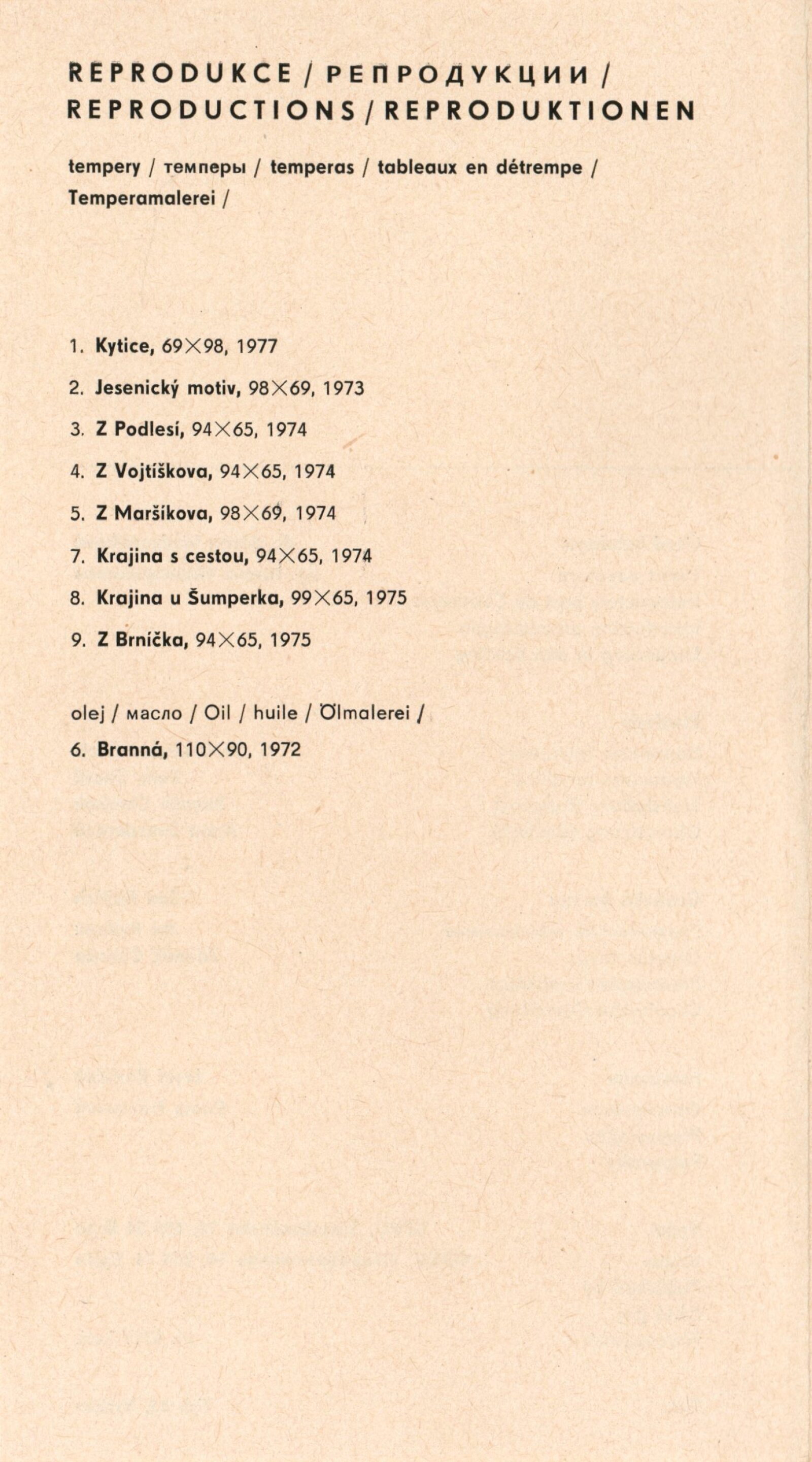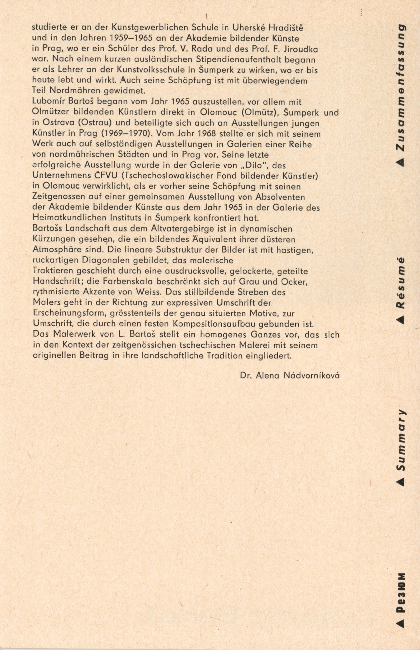 Lubomír Bartoš. Jesenická krajina: Dům umění, 82. výstava v Galerii Jaroslava Krále, 18. 10. – 20. 11. 1977 / Text: Alena Nádvorníková. – Brno: ČFVU, 1977. – 12 s., obr., seznam vystavených prací 2 s., portrét, životopis, seznam výstav, DU 663