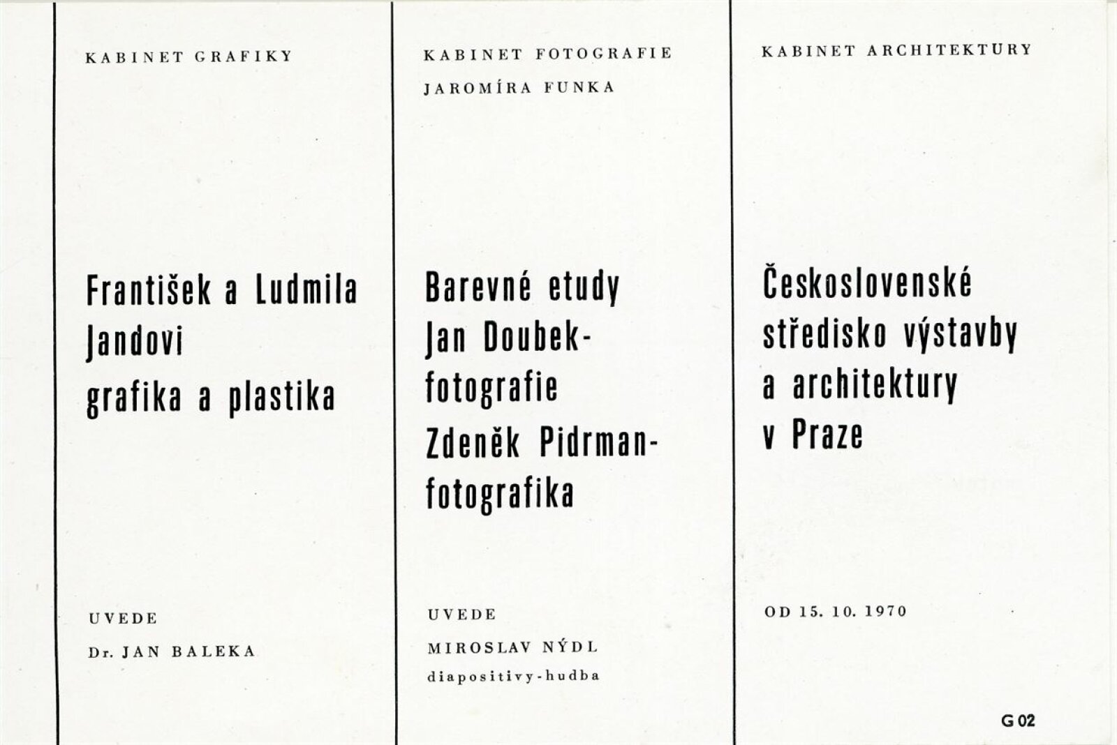 Ludmila Jandová, grafika. František Janda, sochy: Dům umění města Brna / Dům pánů z Kunštátu, Kabinet grafiky, 2. 10. – 1. 11. 1970 / Text: Jan Baleka. – Brno: DUmB, 1970. – 16 s., obr., životní data, výstavy, ilustrace, realizace, DPK 448. – MZK; MG; MMB