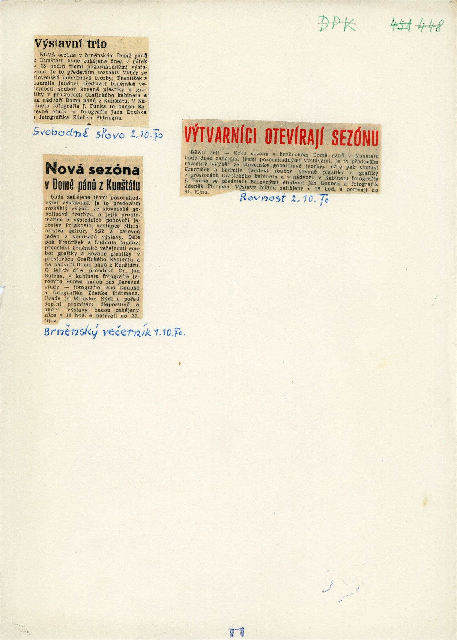 pozvánka (spol. pro DPK 448–450), fotografie z vernisáže, fotografie instalace (také z nádvoří DPK), recenze v tisku