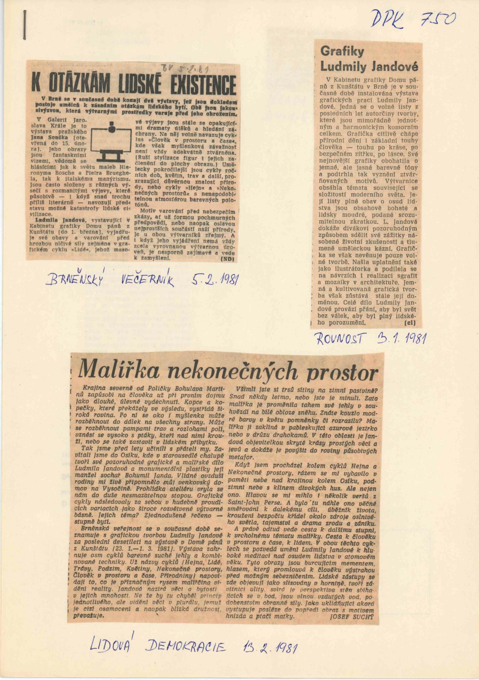 Ludmila Jandová. Grafika: Dům umění / Dům pánů z Kunštátu, Kabinet grafiky, 23. 1. – 1. 3. 1981 / Text: Nina Dvořáková. – Brno: DUmB, 1981. – 12 s., obr., životní data, výstavy, DPK 750. – MZK; MG; MMB