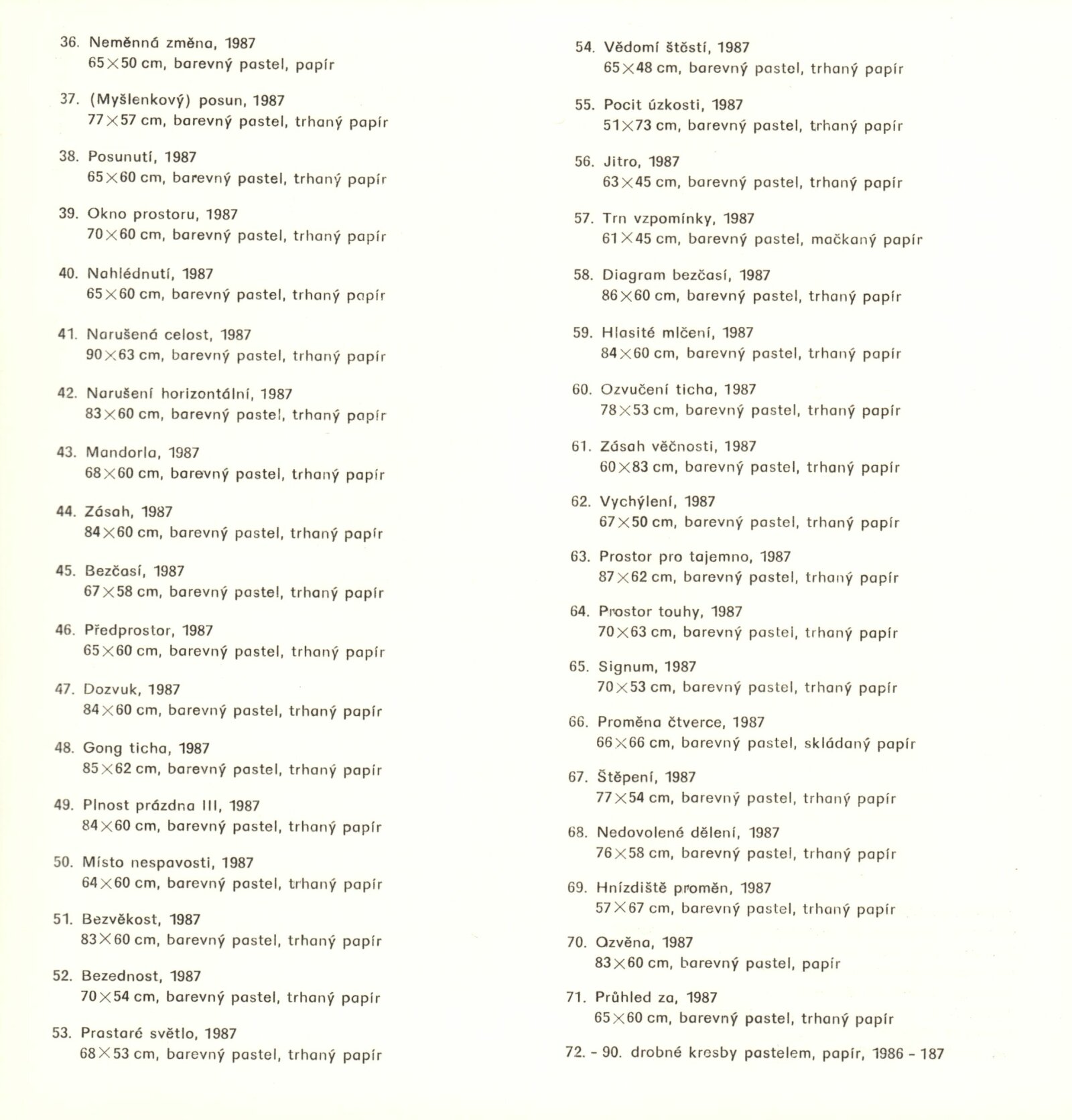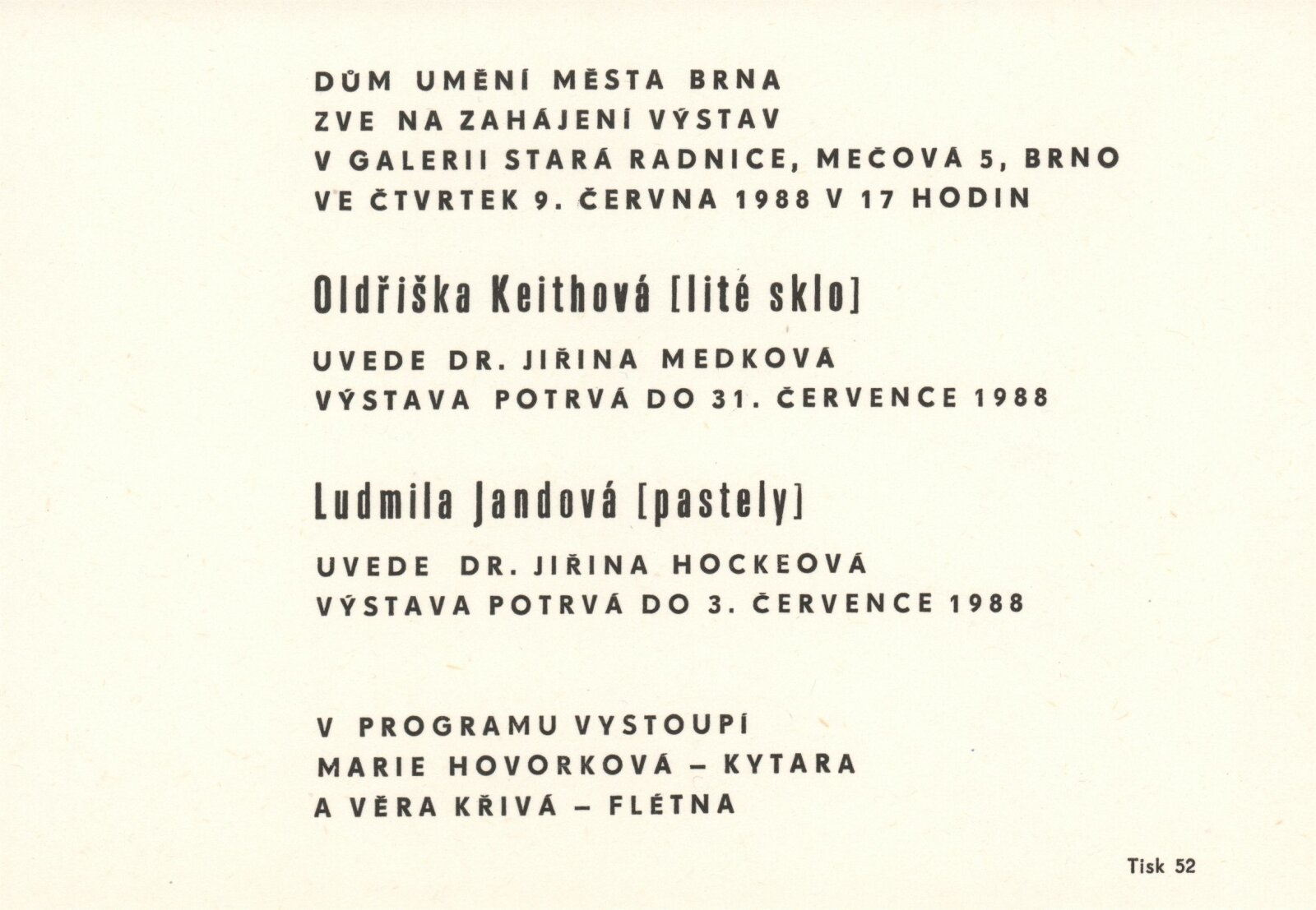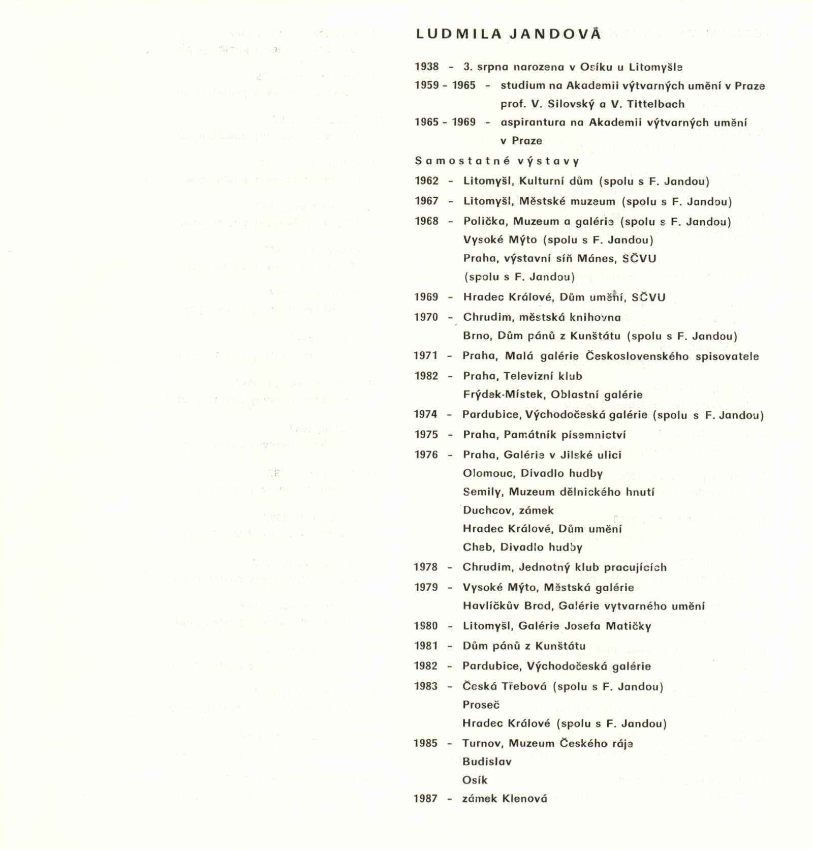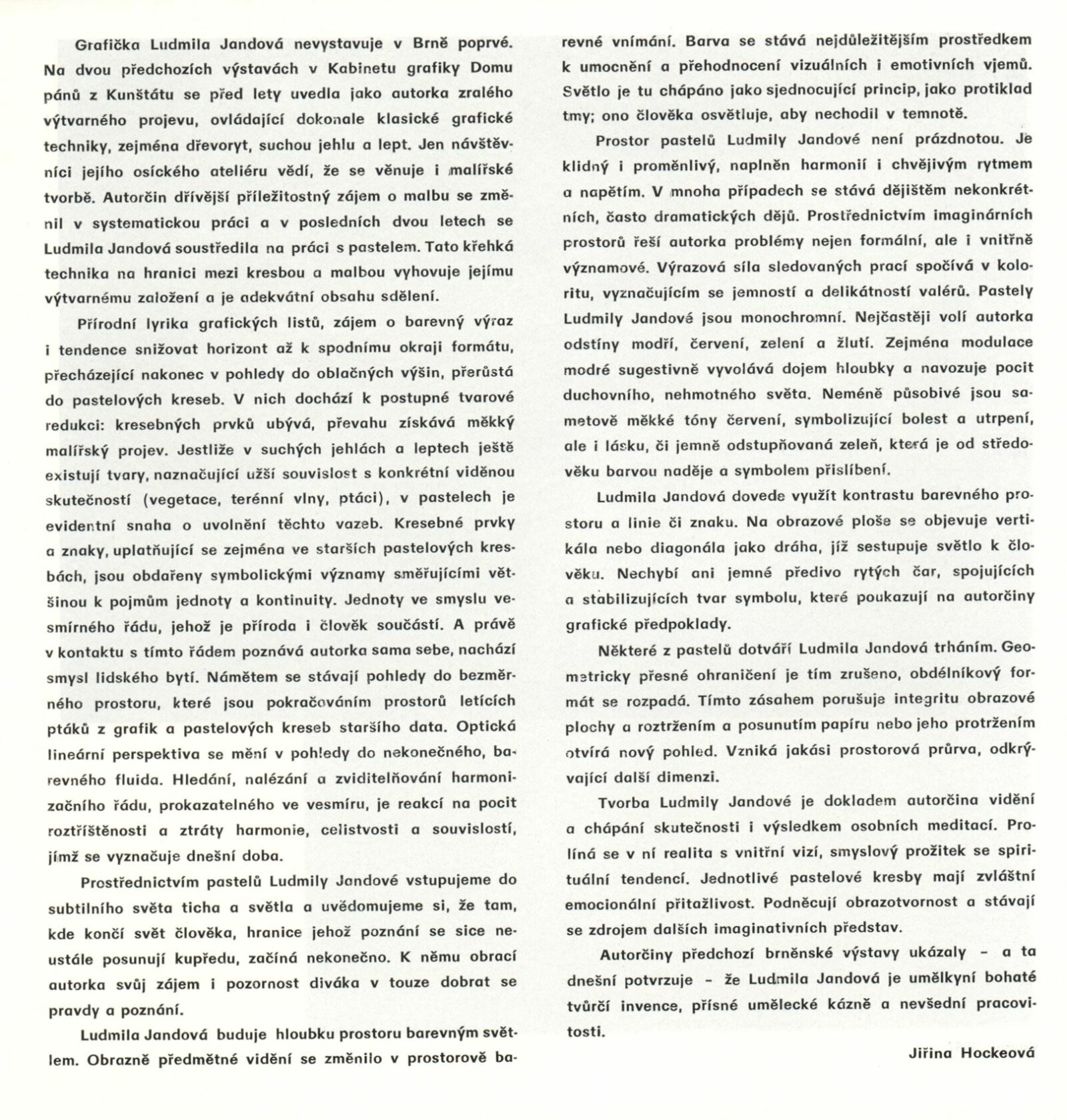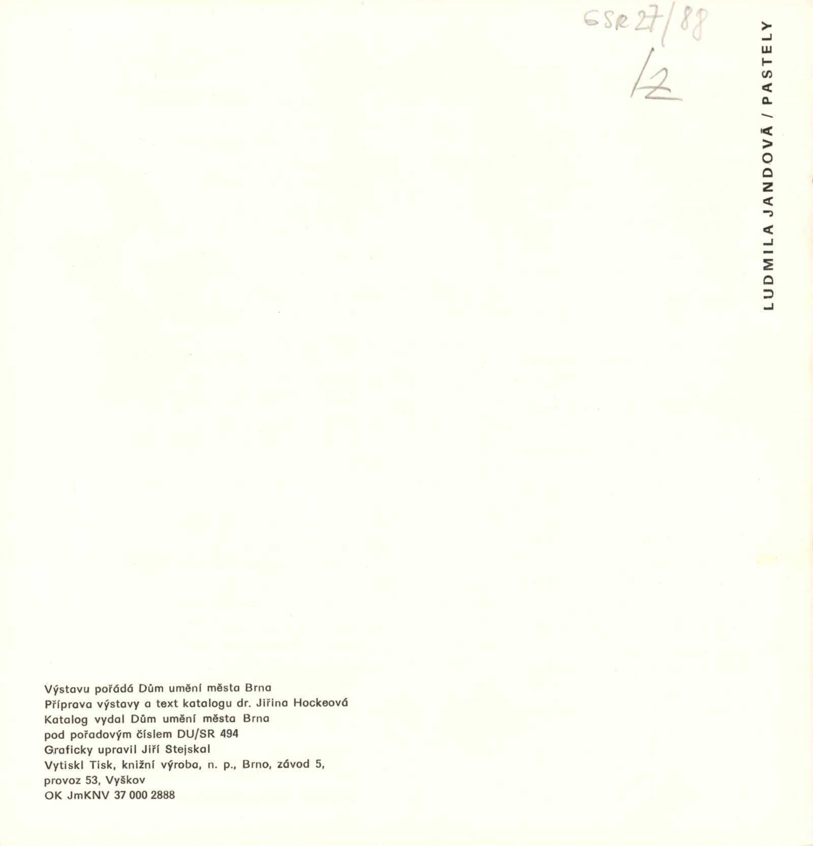 Ludmila Jandová. Pastely: Galerie Stará radnice, 9. 6. – 3. 7. 1988 / Text: Jiřina Hockeová. – Brno: DUmB, 1988. – [17] s., obr., životní data, výstavy, GSR 27. – MZK; MG; MMB