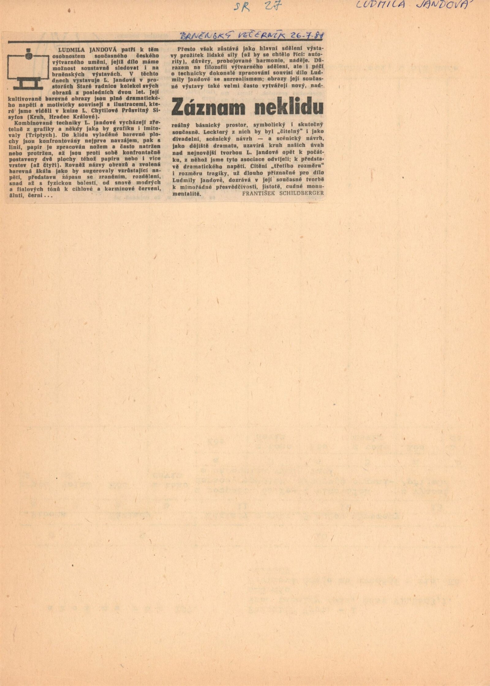 pozvánka, katalog, strojopis, seznam vystavených děl, pojistný seznam, korespondence (1988-1986), žádost a potvrzení o konání výstavy, recenze v tisku, katalog z výstavy Ludmily Jandové v GVU v Havlíčkově Brodu (1980), katalog z výstavy Ludmily Jandové v UKDŽ v Praze (1985)