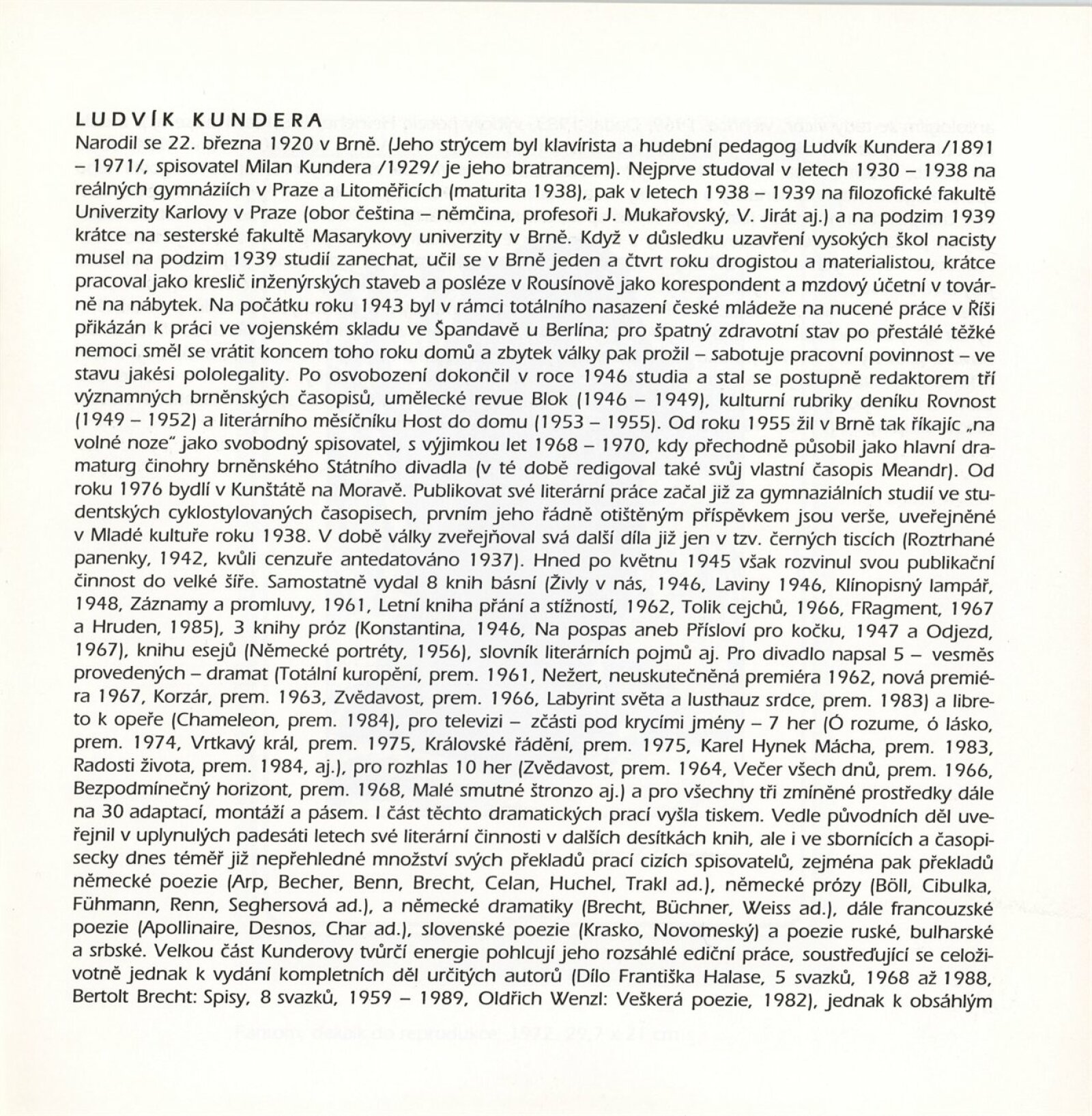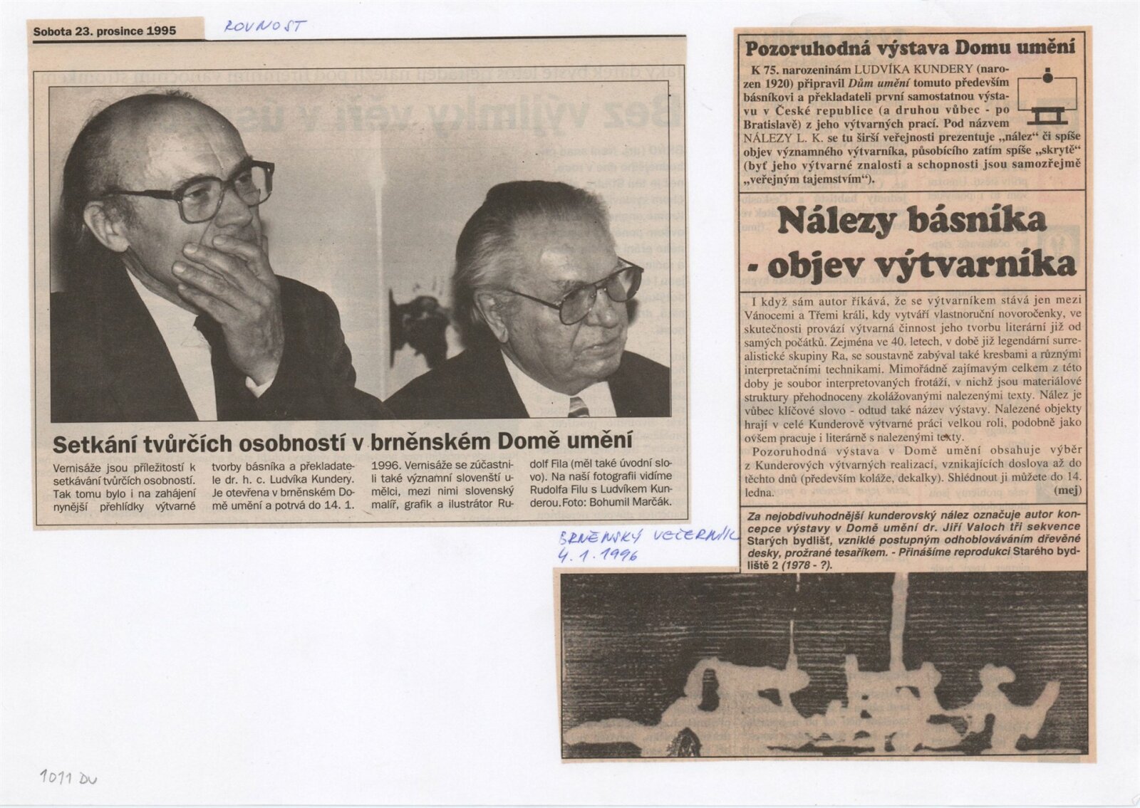 Ludvík Kundera. Nálezy: Procházkova síň Domu umění 7. 12. 1995 – 14. 1. 1996 / Text Jiří Valoch. - Brno: DUmB, - [28] s., obr. Životopis DU 1011