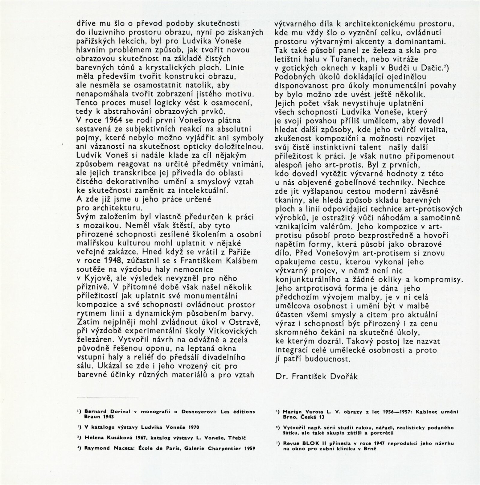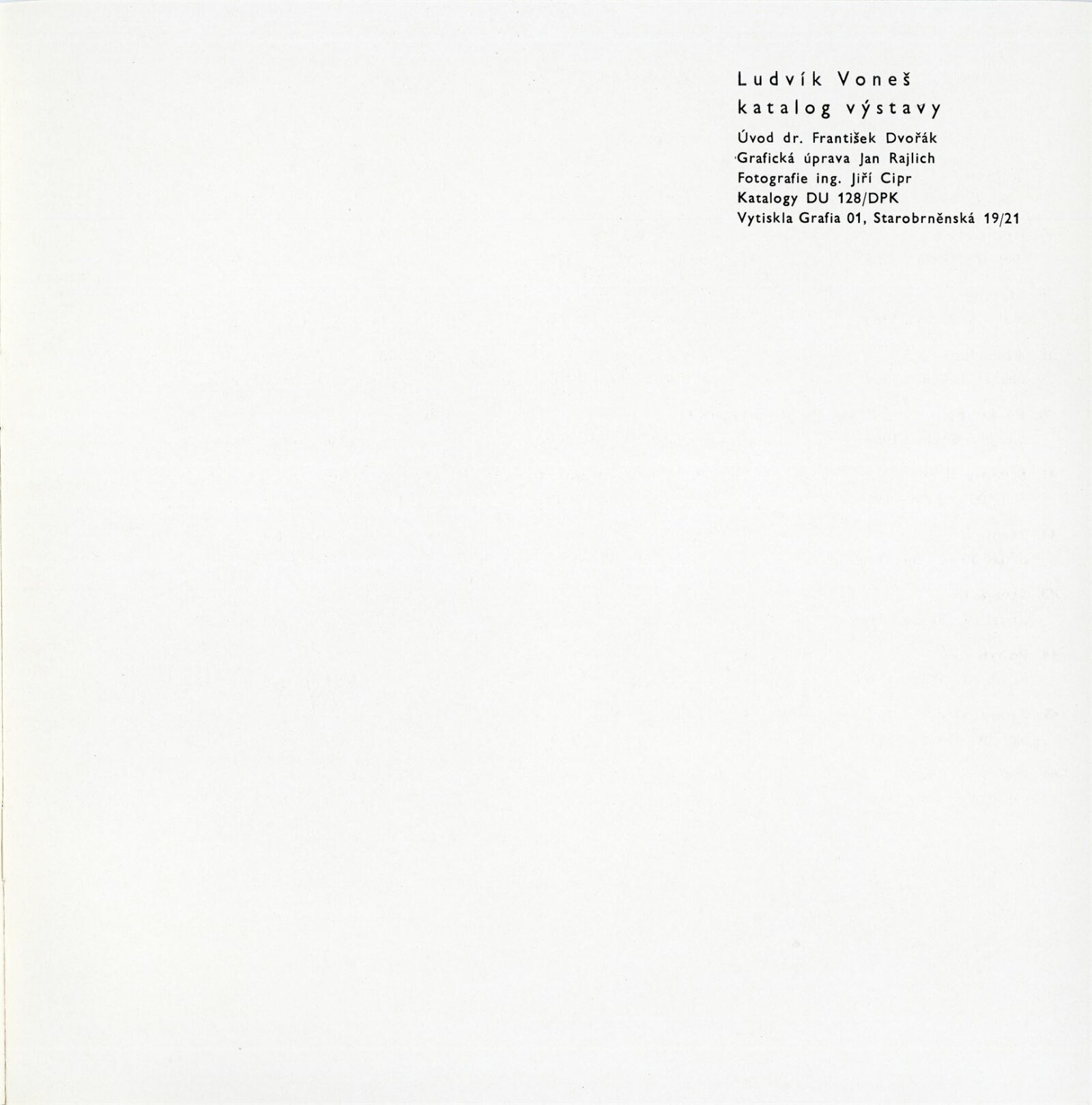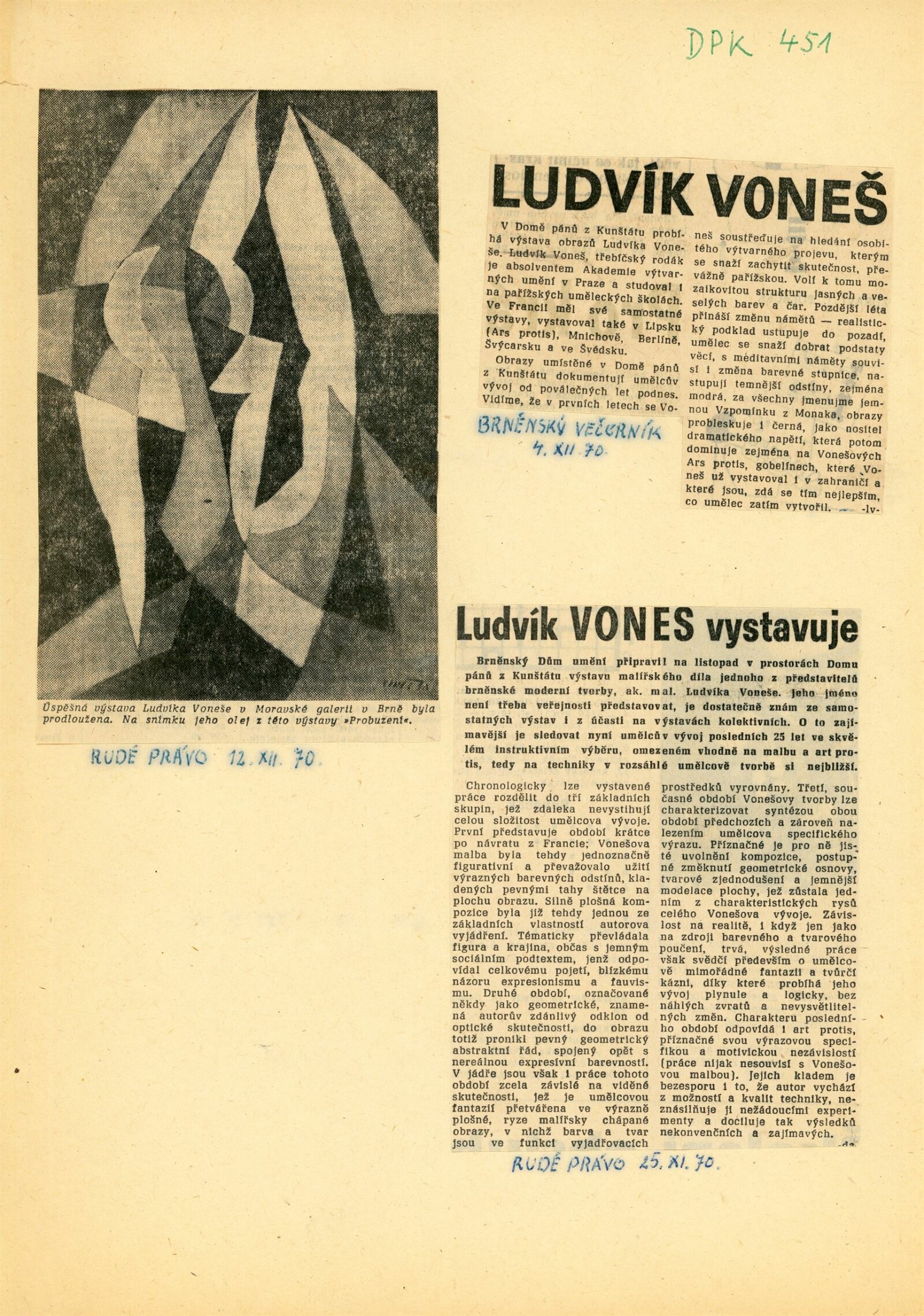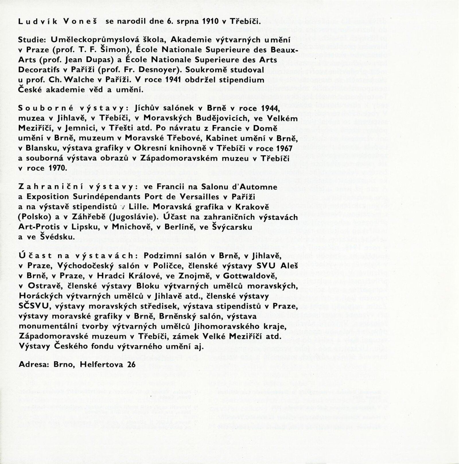Ludvík Voneš: Dům umění města Brna / Dům pánů z Kunštátu, 5. 11. – 6. 12. 1970 / Text: František Dvořák. – Brno: DUmB, 1970. – 16 s., obr., resumé 2 s., životní data, výstavy, DPK 451. – MZK; MG; MMB