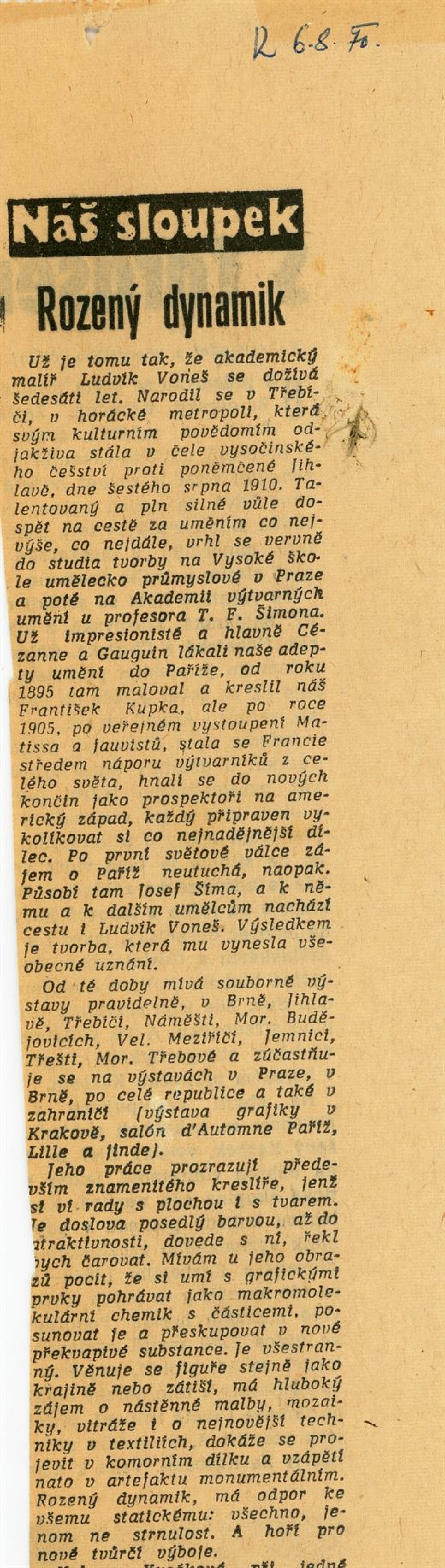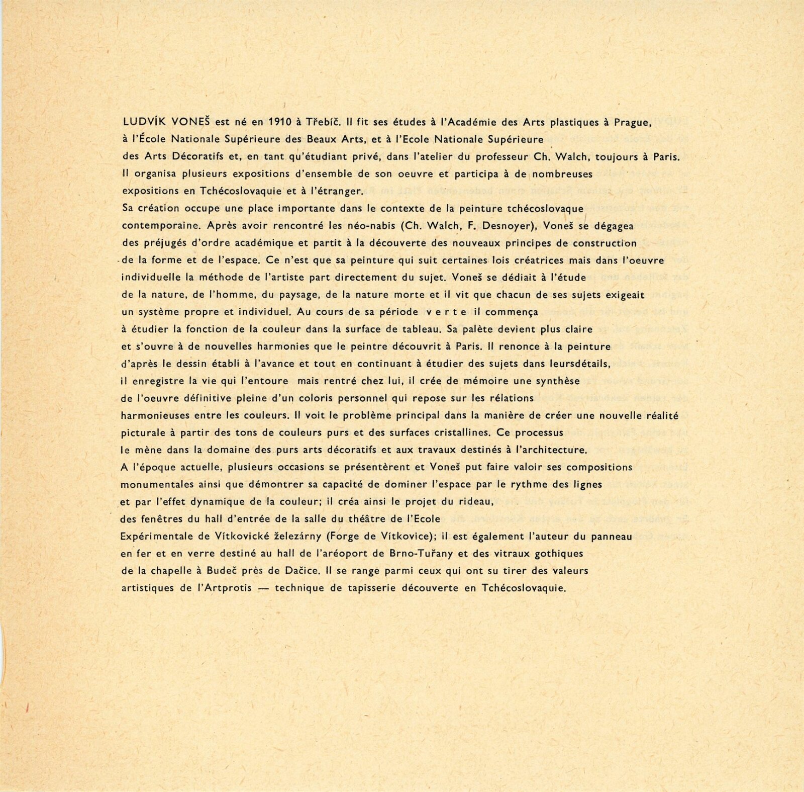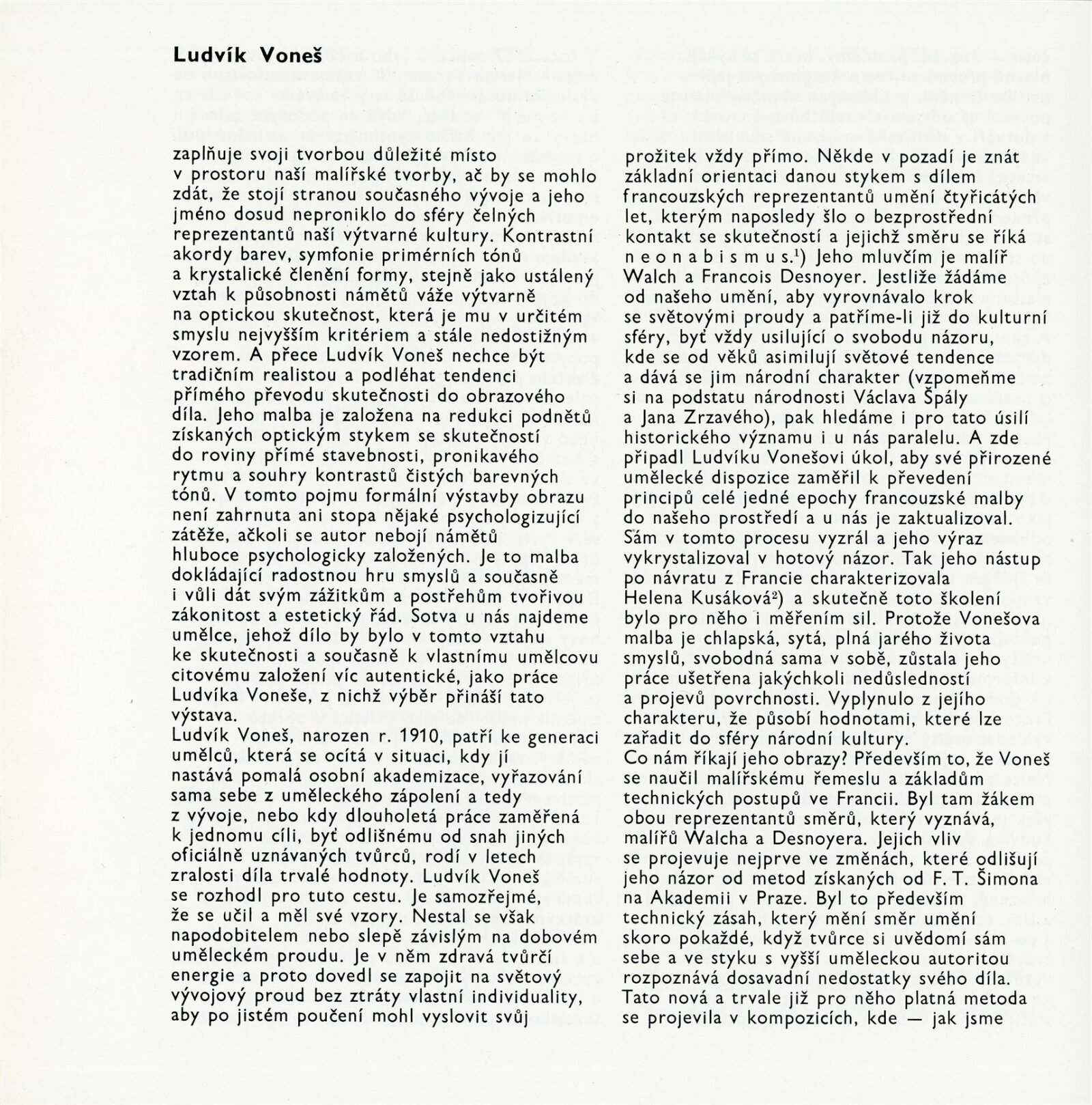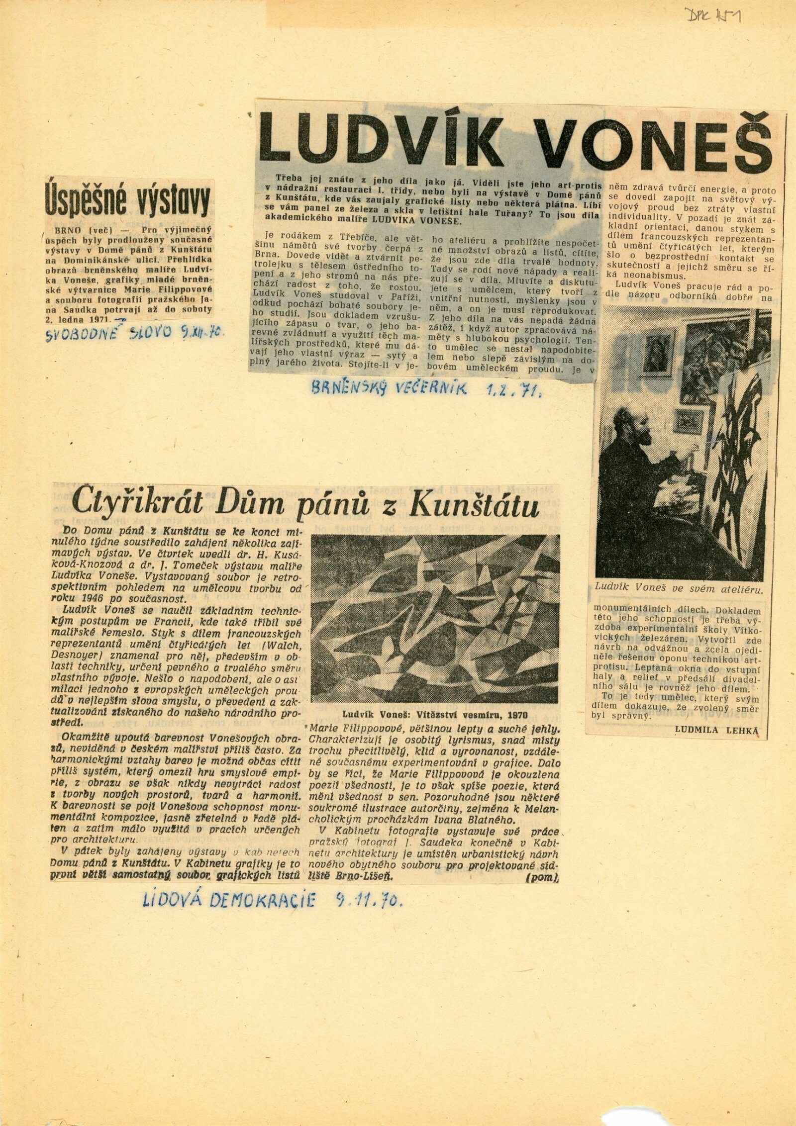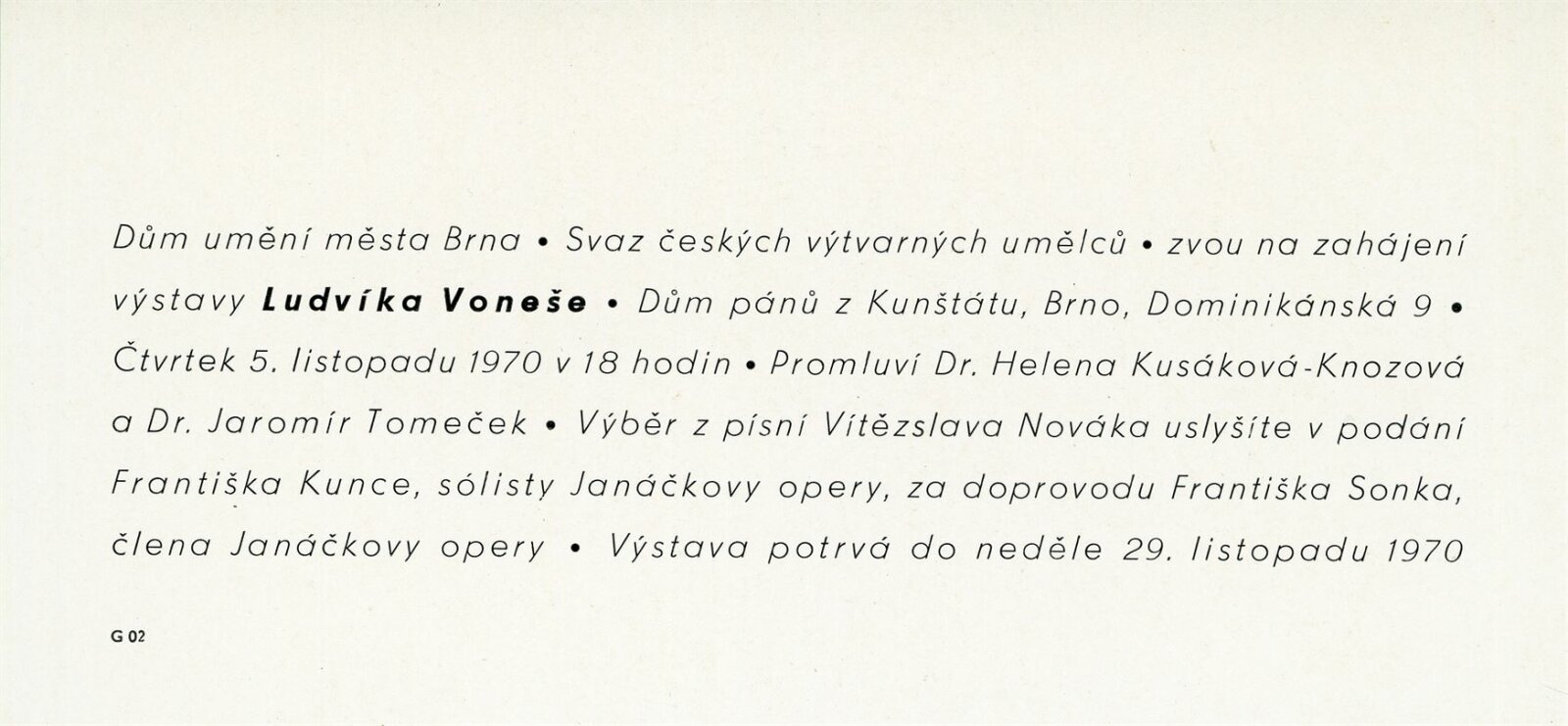 Ludvík Voneš: Dům umění města Brna / Dům pánů z Kunštátu, 5. 11. – 6. 12. 1970 / Text: František Dvořák. – Brno: DUmB, 1970. – 16 s., obr., resumé 2 s., životní data, výstavy, DPK 451. – MZK; MG; MMB