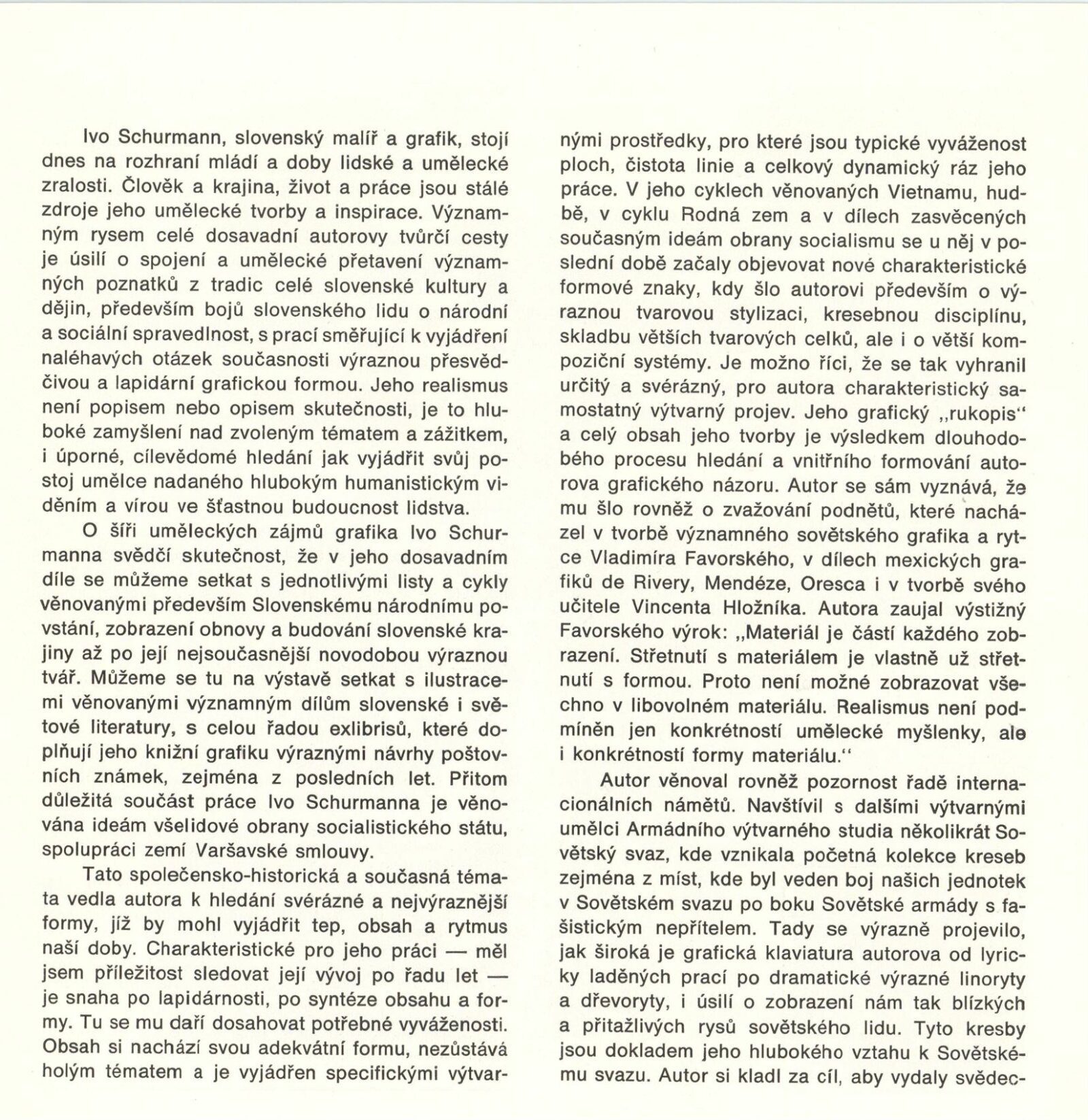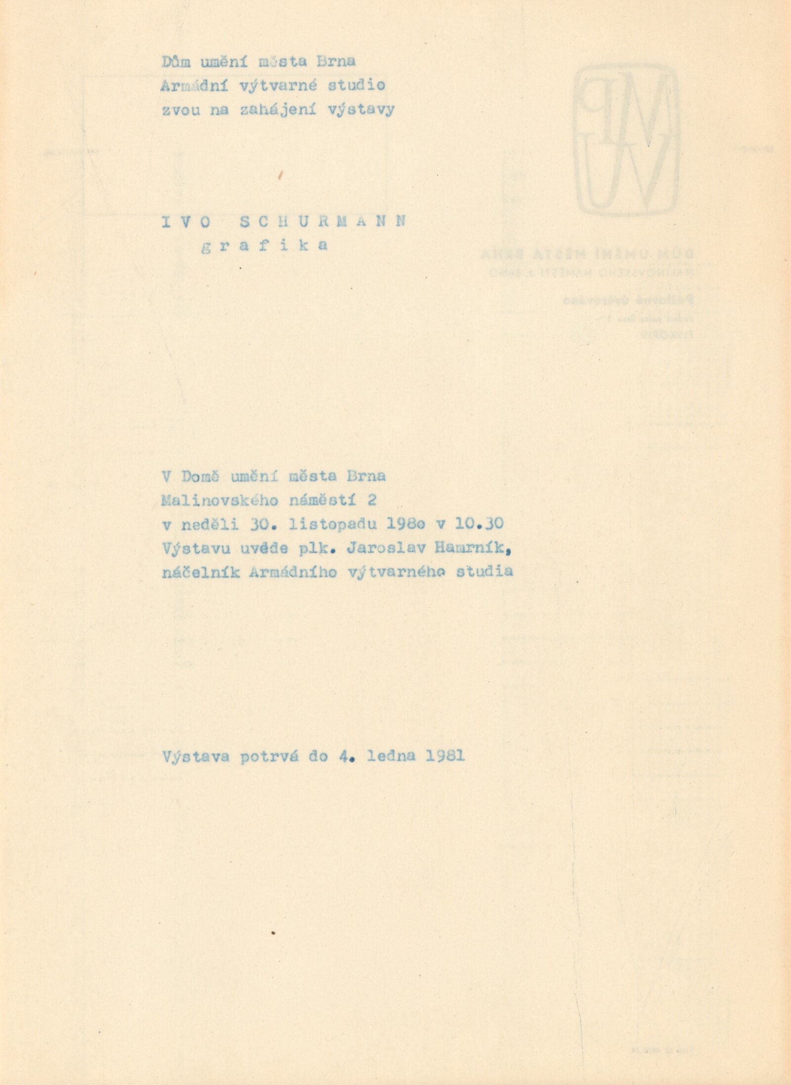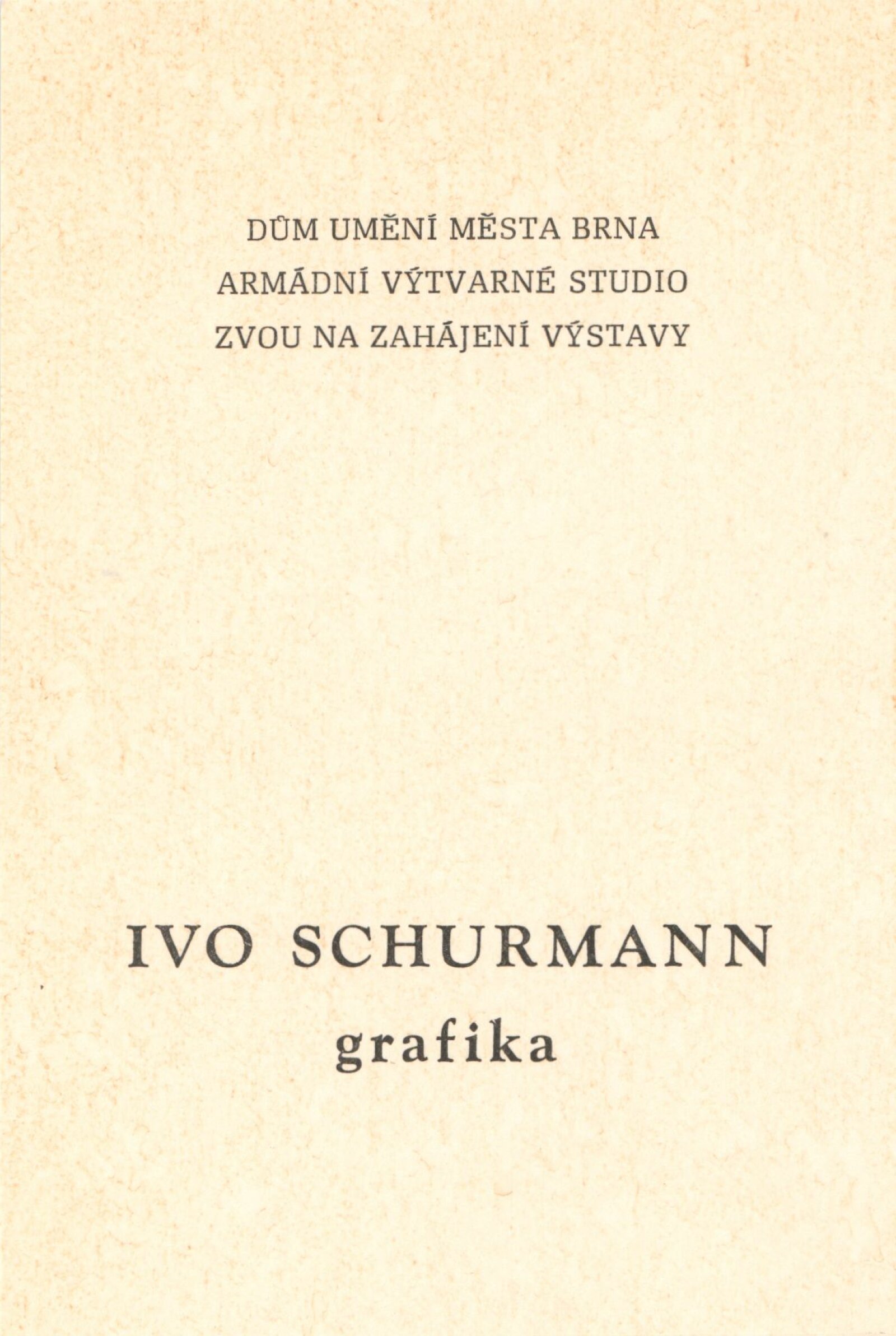 Ivo Schurmann. Grafika: Dům umění, hala, 30. 11. 1980 – 4. 1. 1981 / Převzatý katalog Ivo Schurmann. Text: Vladimír Štolfa. – Praha: Armádní výtvarné studio, 1977. – 12 s., obr., neobsahuje seznam vystavených prací, DU 719. – MZK; MG
