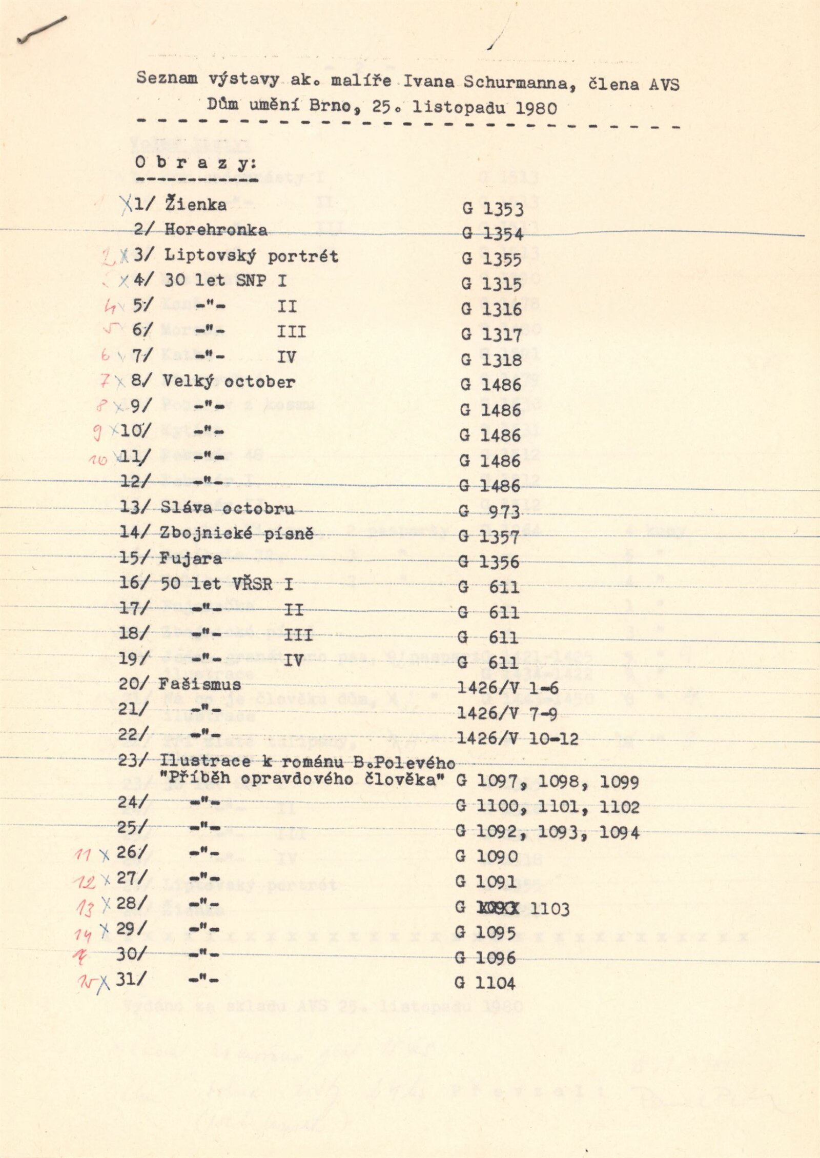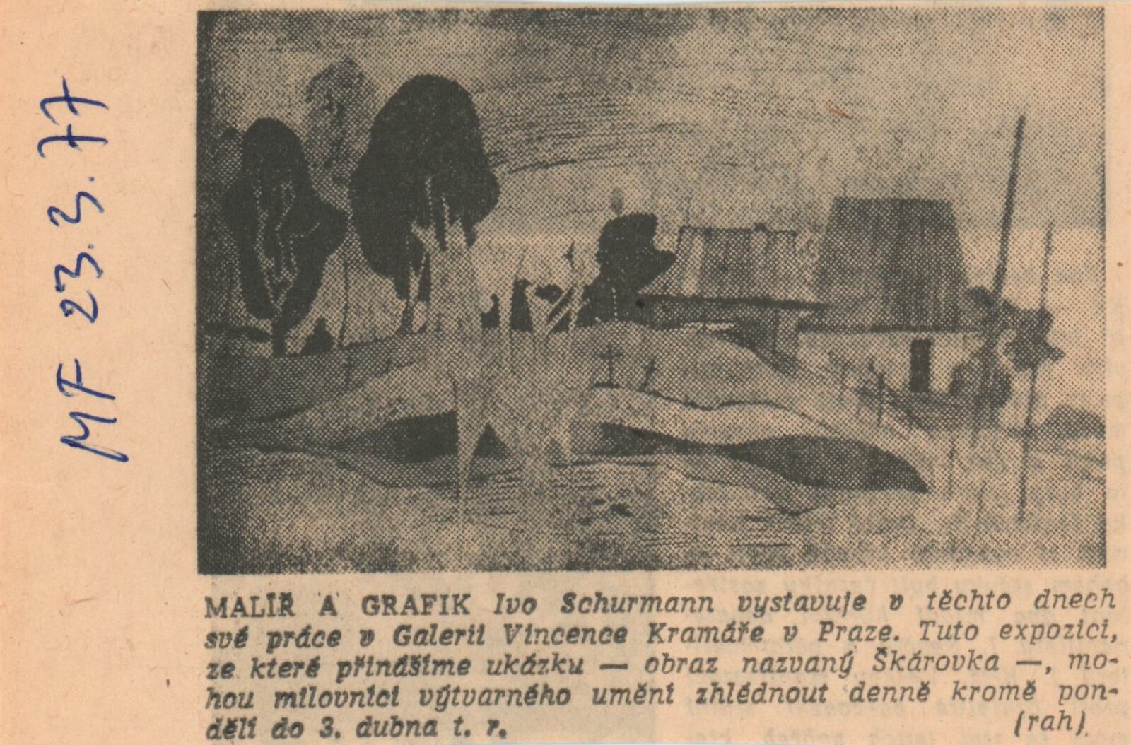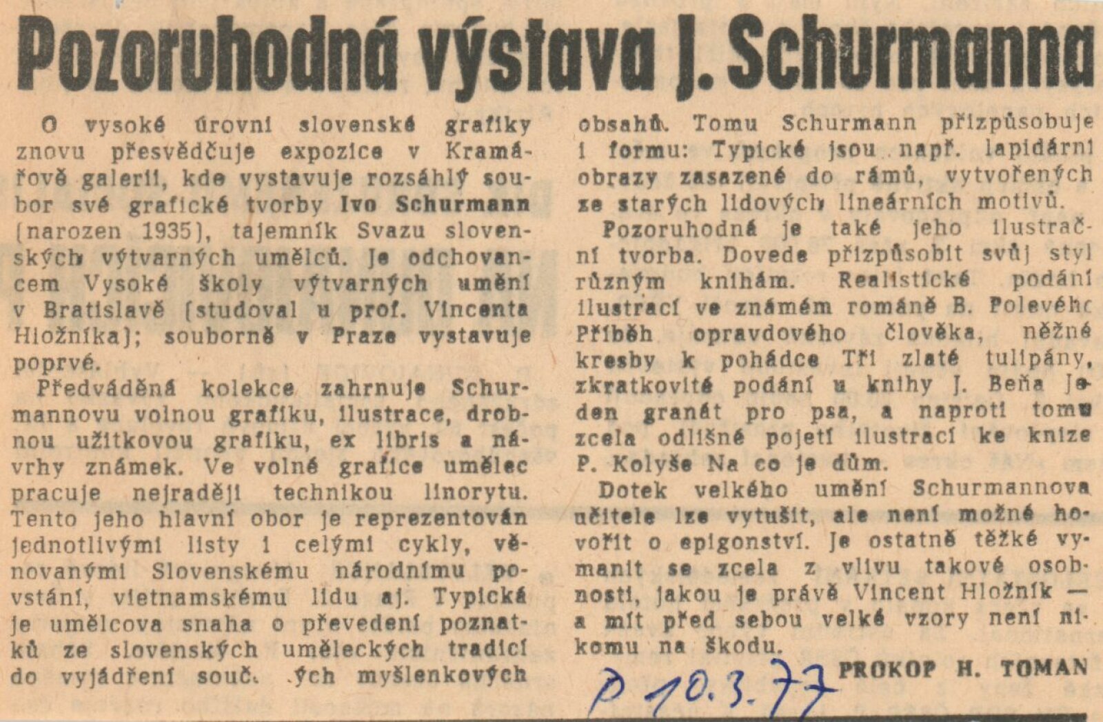Ivo Schurmann. Grafika: Dům umění, hala, 30. 11. 1980 – 4. 1. 1981 / Převzatý katalog Ivo Schurmann. Text: Vladimír Štolfa. – Praha: Armádní výtvarné studio, 1977. – 12 s., obr., neobsahuje seznam vystavených prací, DU 719. – MZK; MG