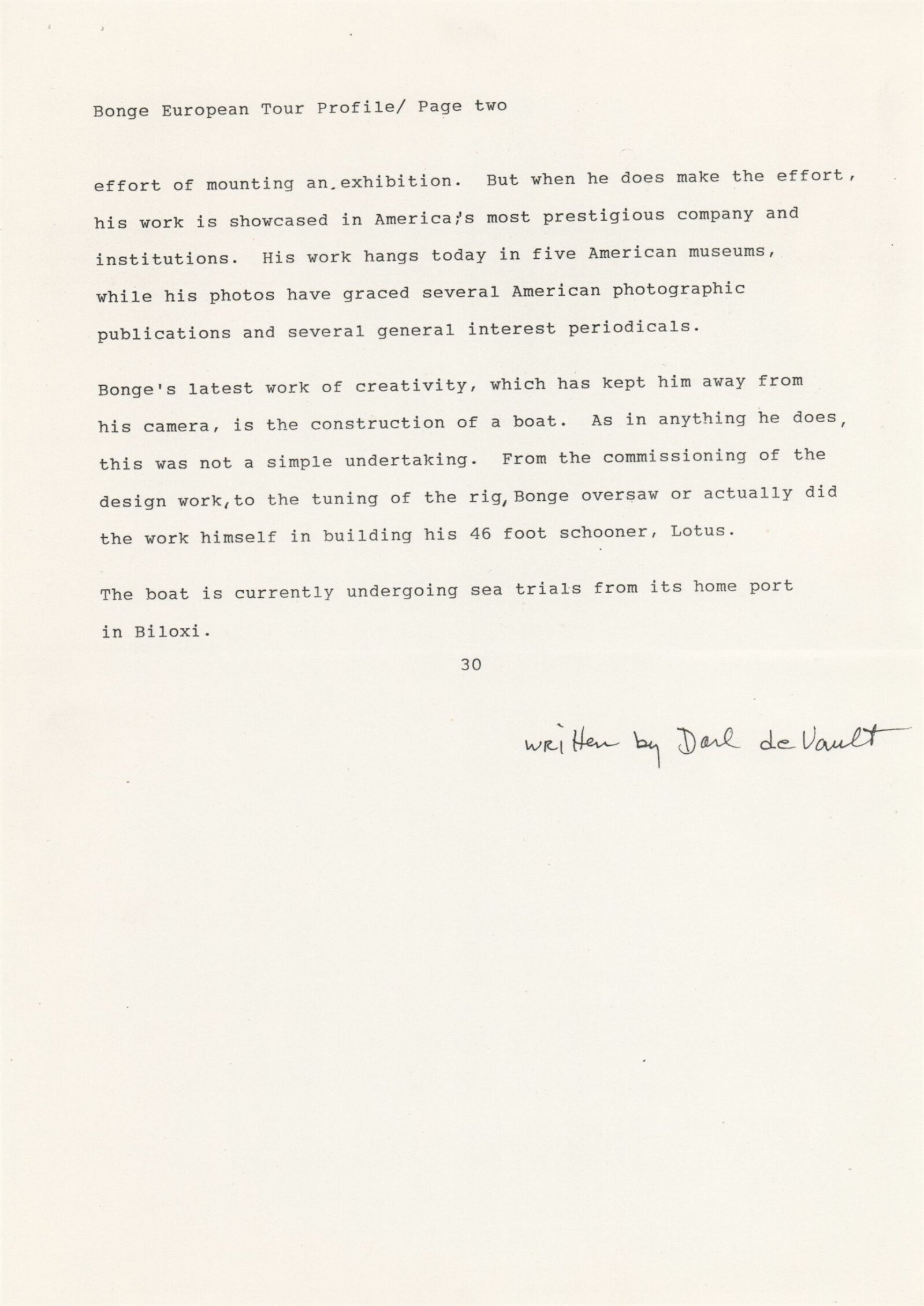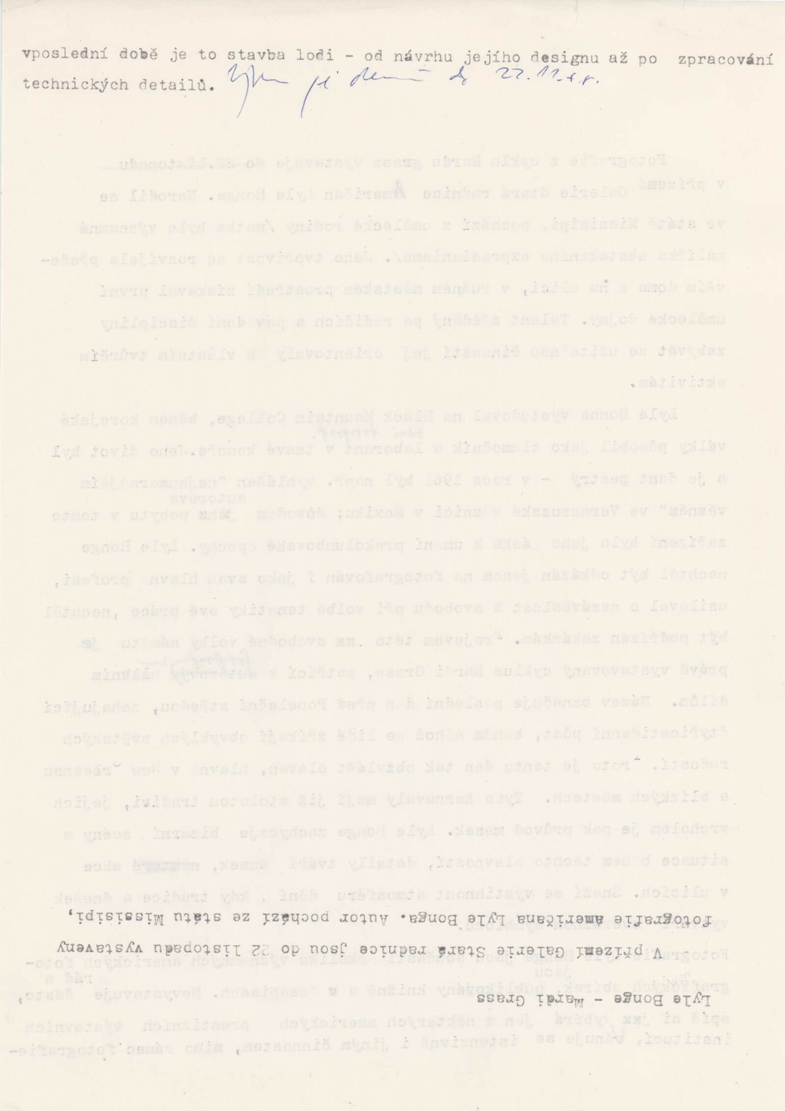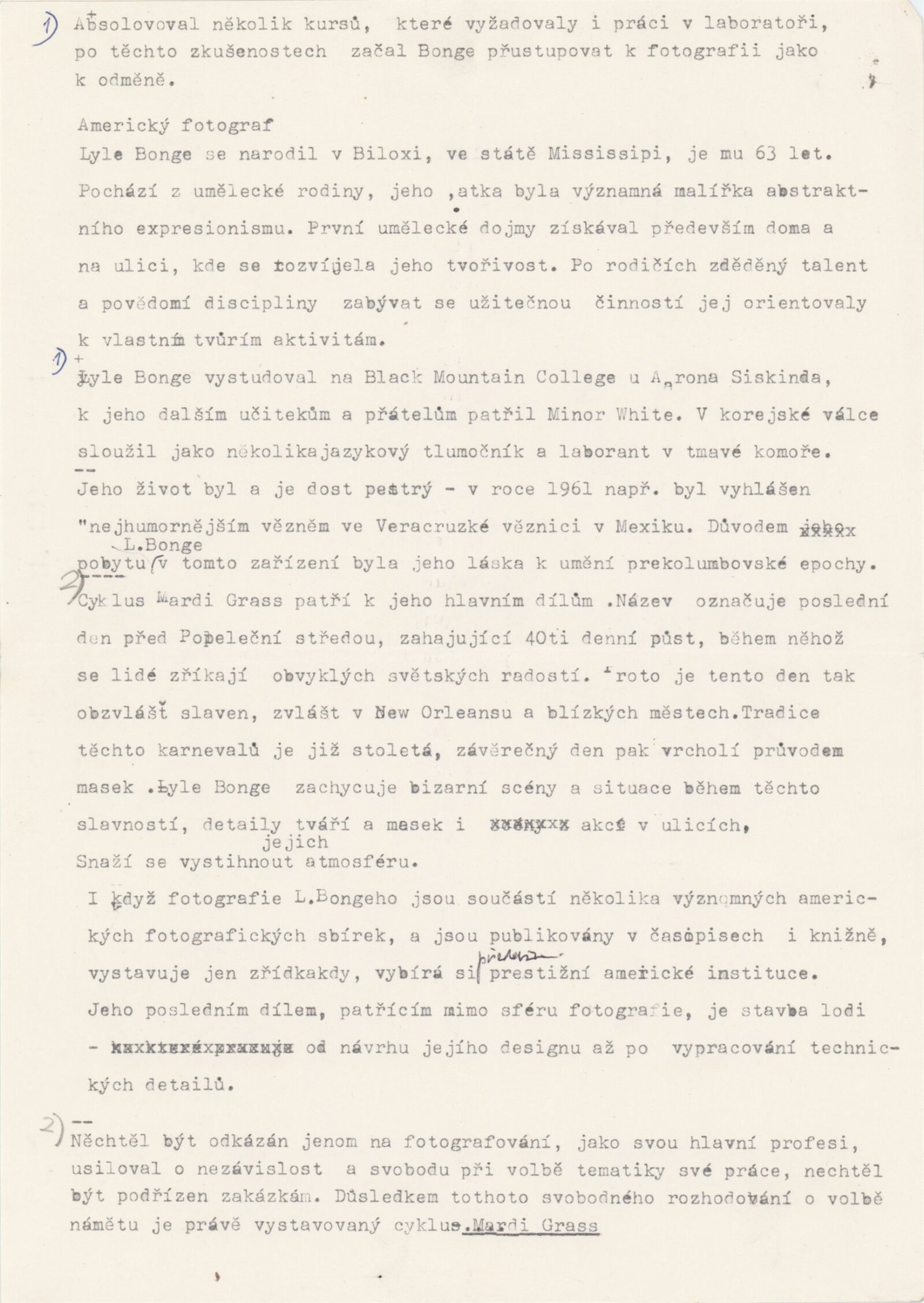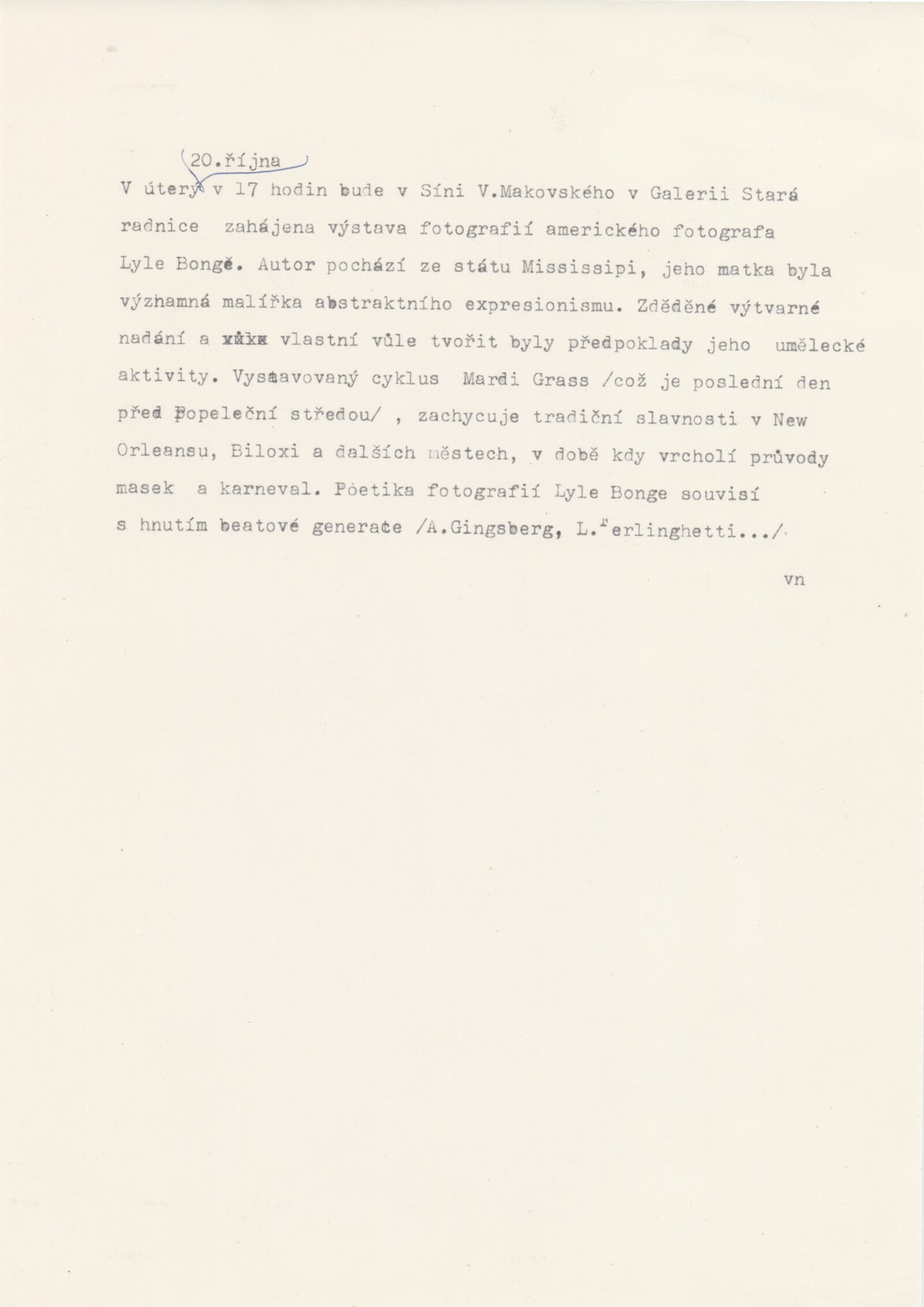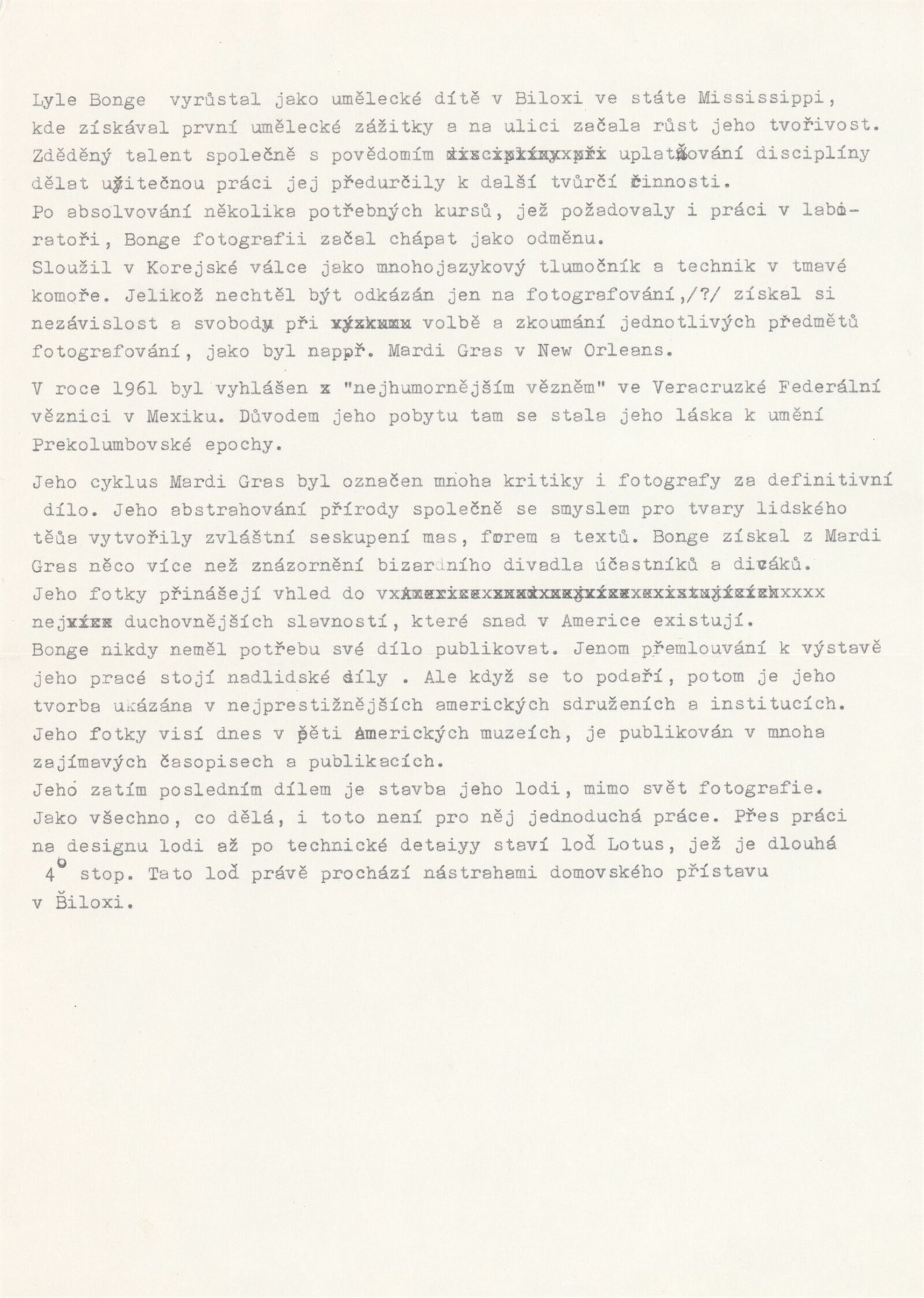 pozvánka, katalog, zpráva do médií, texty (ČJ, AJ), korespondence, recenze v tisku, katalog výstavy L. Bonge v Kladně