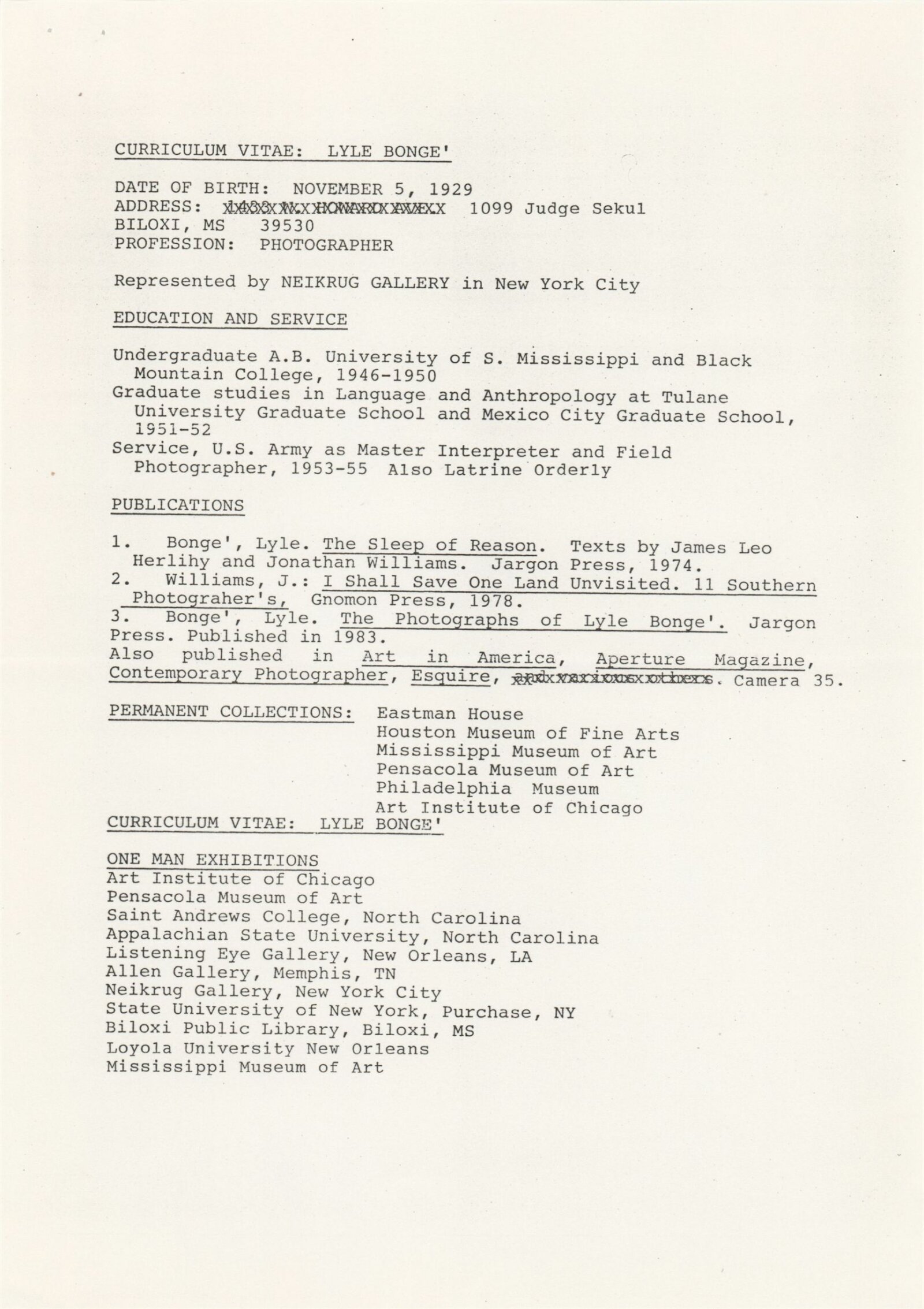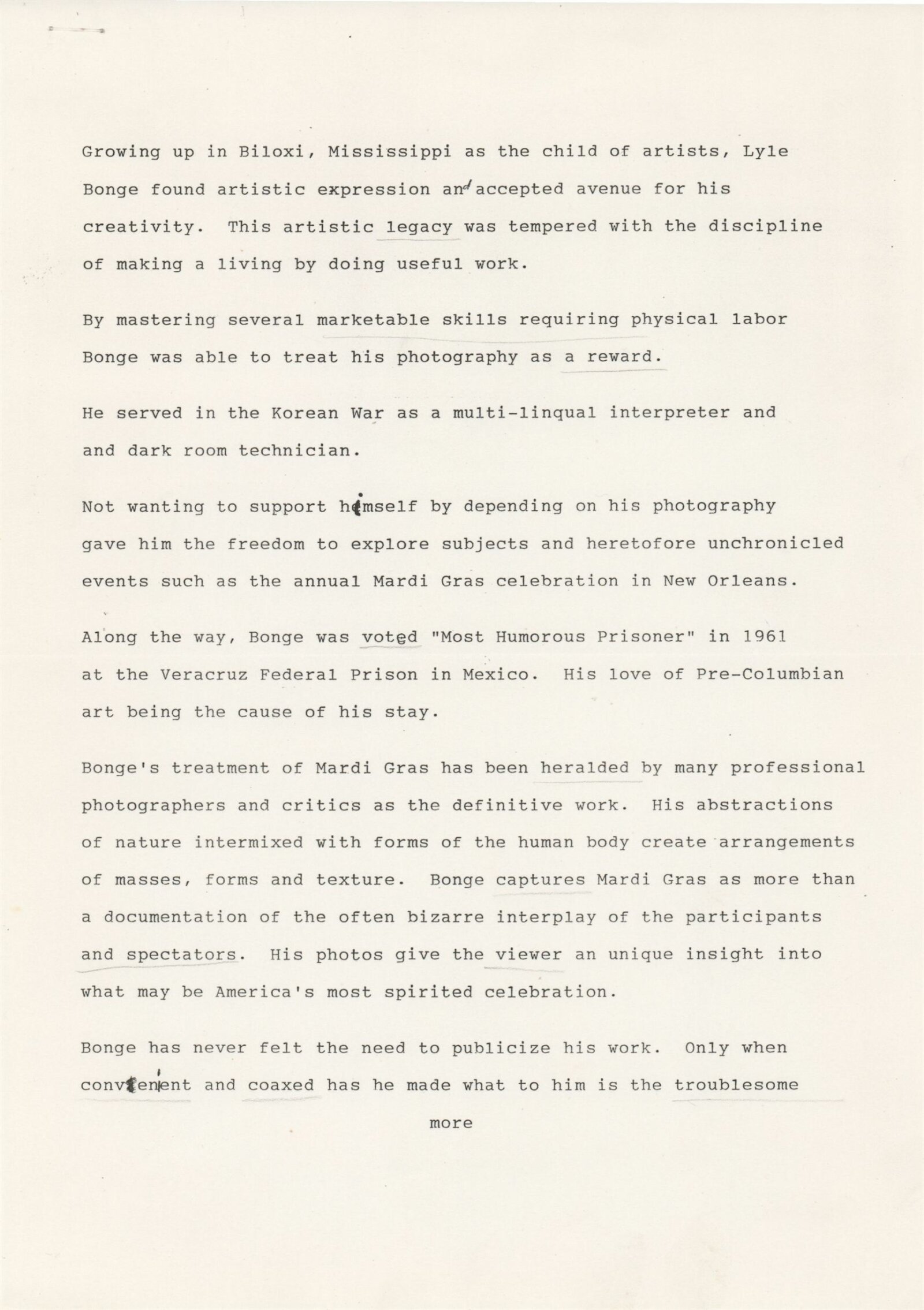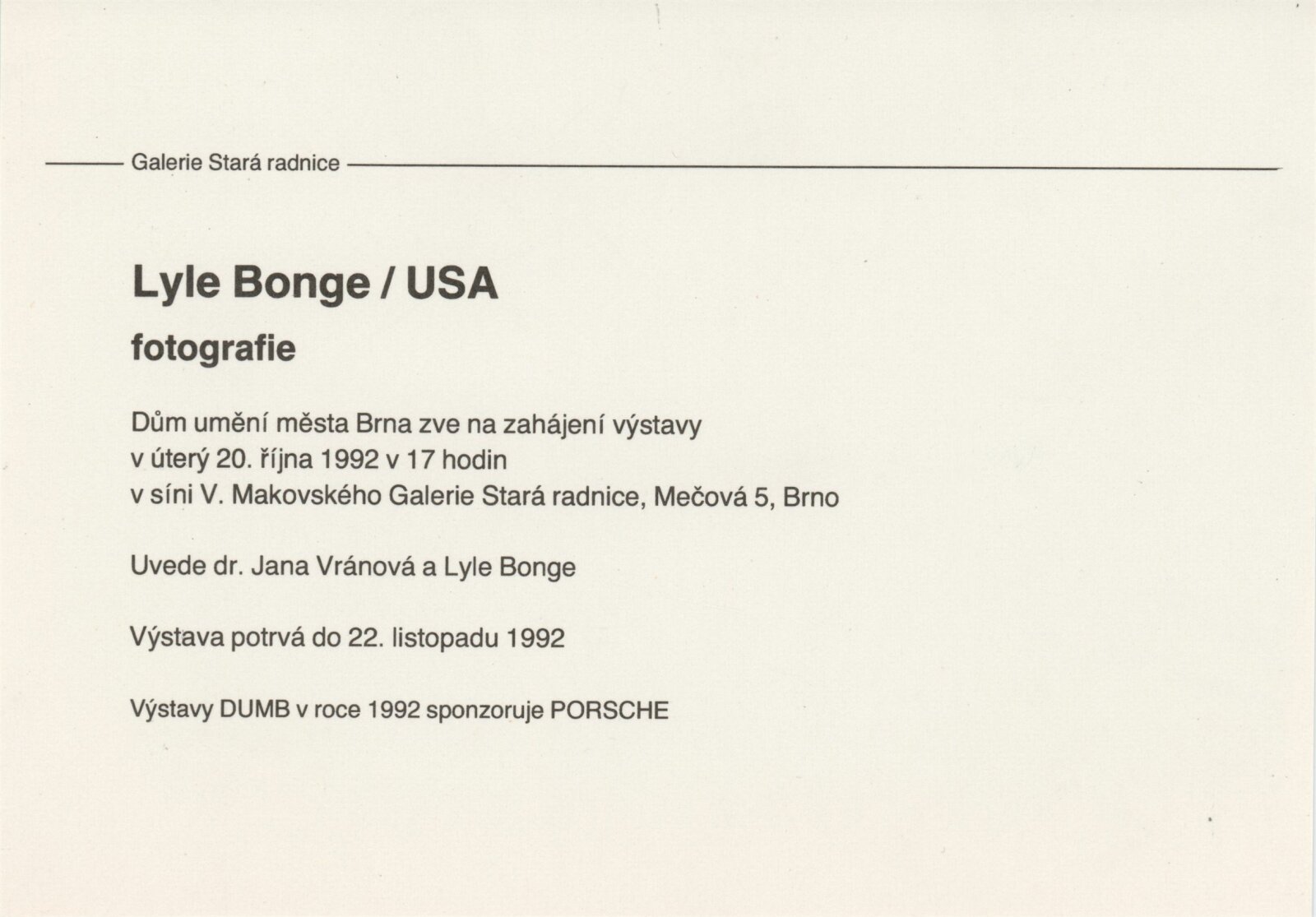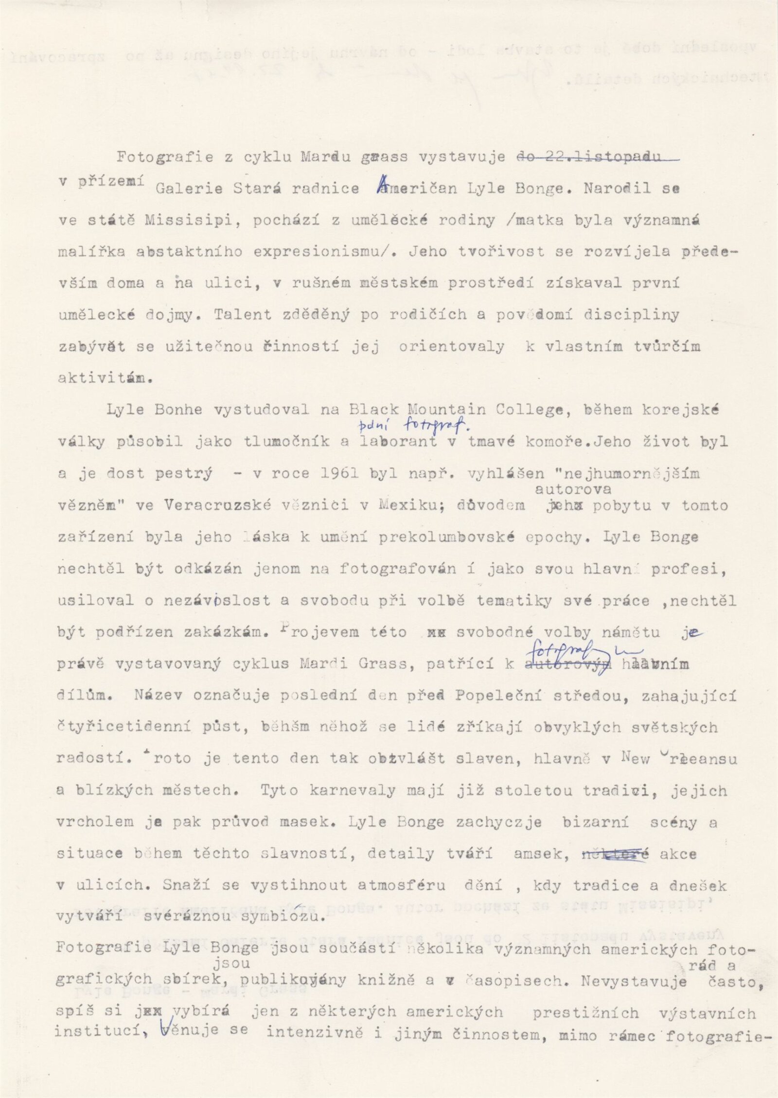 Lyle Bonge. Usa. Fotografie: Galerie Stará radnice 20. 10. – 22. 11. 1992. Převzatý katalog Lyle Bonge. The Sleep of Reason (Mardi Grass): Malá galerie spořitelny v Kladně září - Kladno: Malá galerie spořitelny, - [6] s., obr. GSR 131