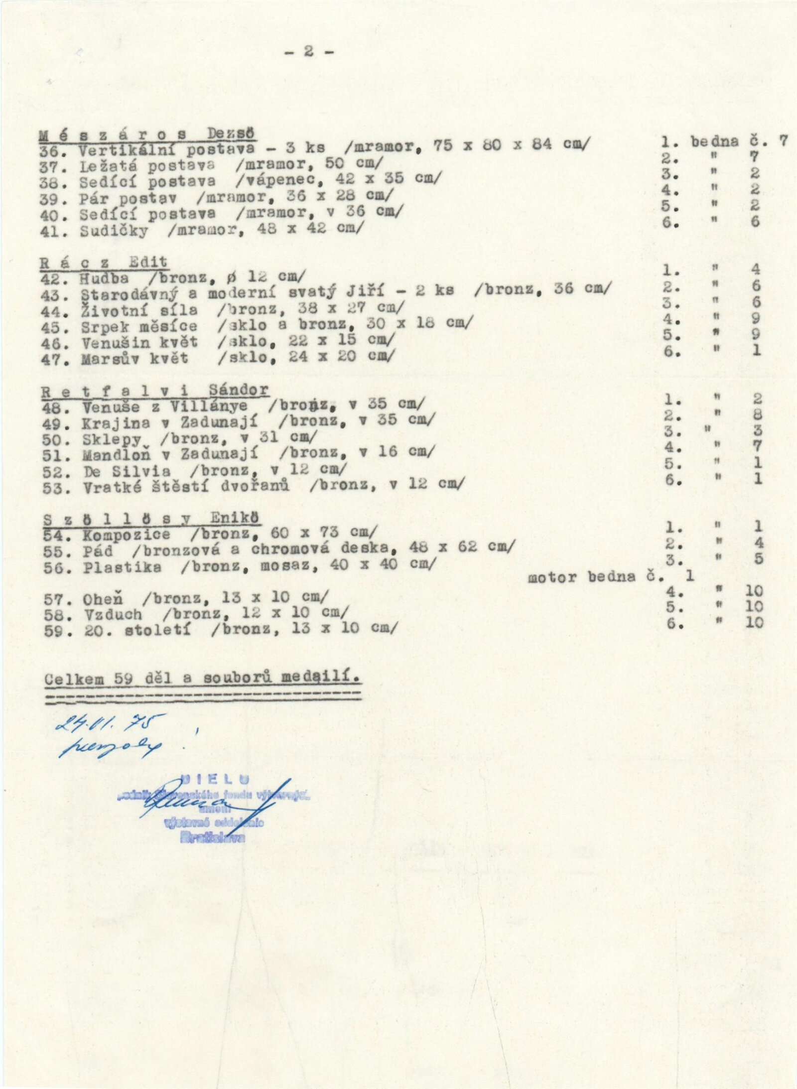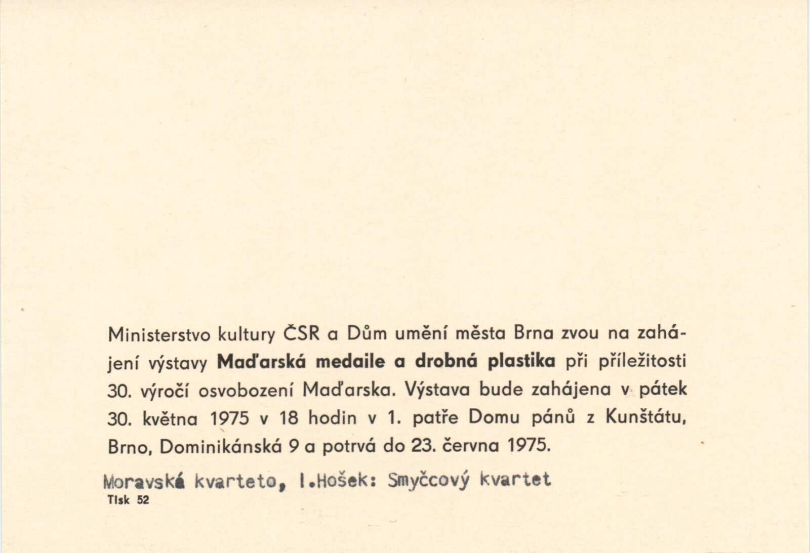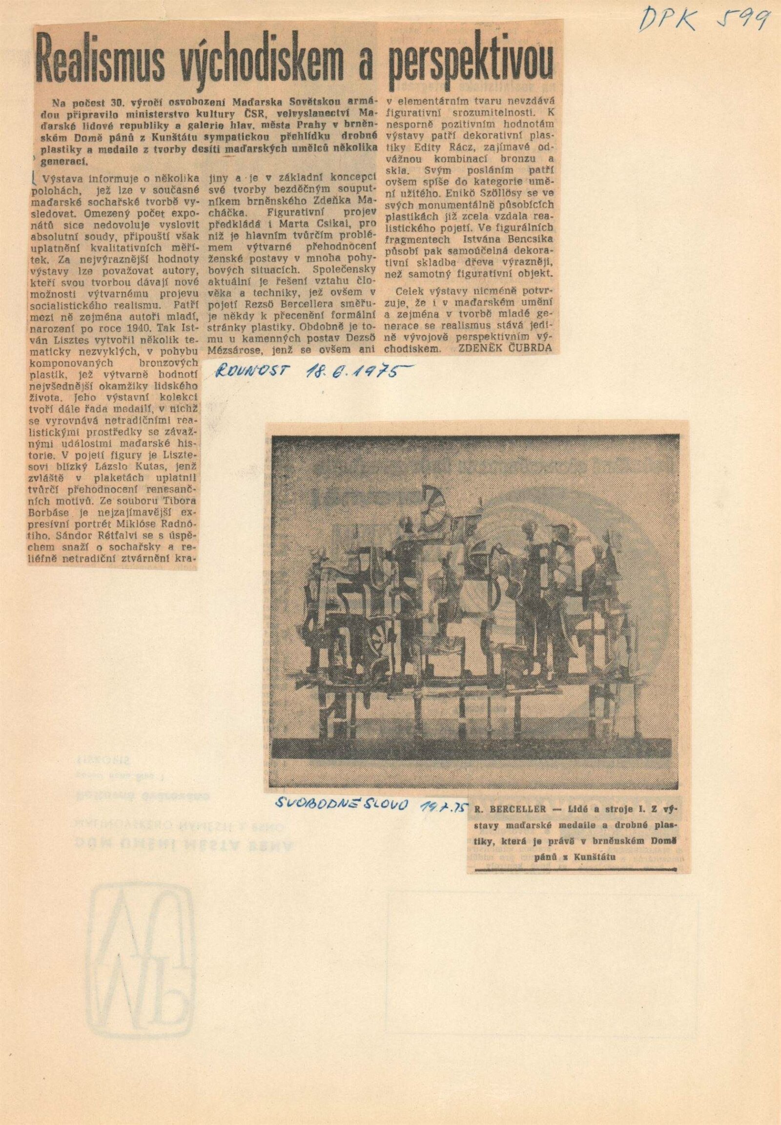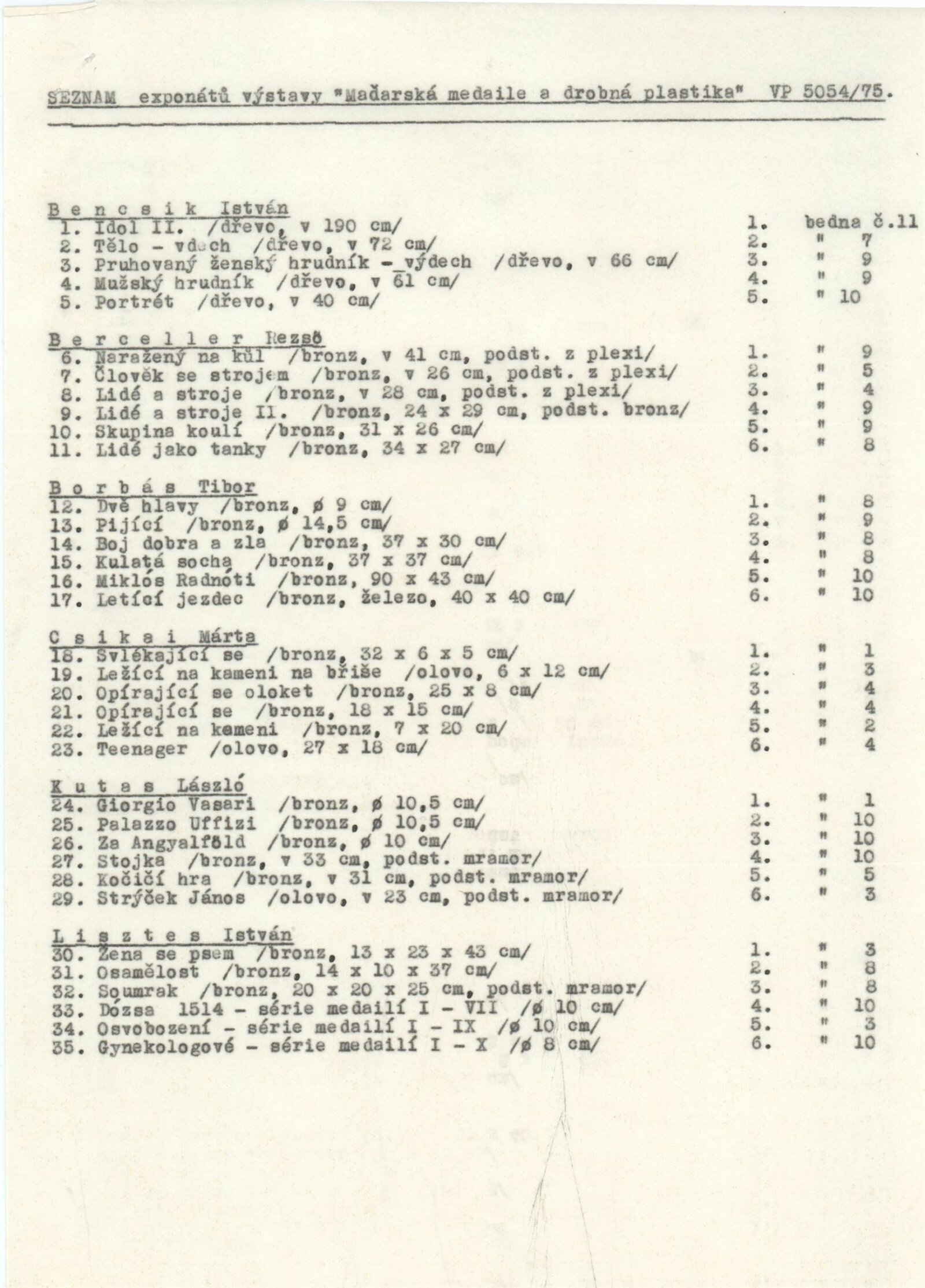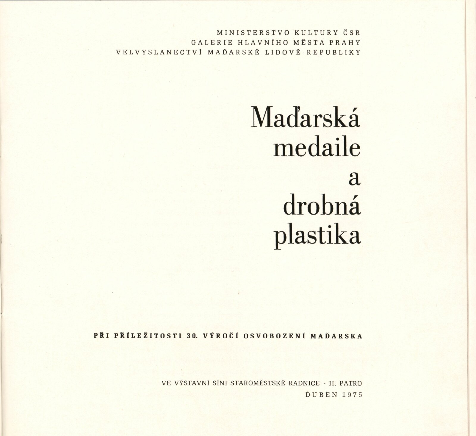 Maďarská medaile a drobná plastika: Dům umění / Dům pánů z Kunštátu, 30. 5. – 23. 6. 1975 / Převzatý katalog. Maďarská medaile a drobná plastika. Při příležitosti 30. výročí osvobození Maďarska: ve výstavní síni Staroměstské radnice, Praha, duben 1975 / Text: Ferenc Szamosi. – Praha: Galerie hlavního města Prahy, 1975. – 14 s., obr., životní data, DPK 599. – MZK