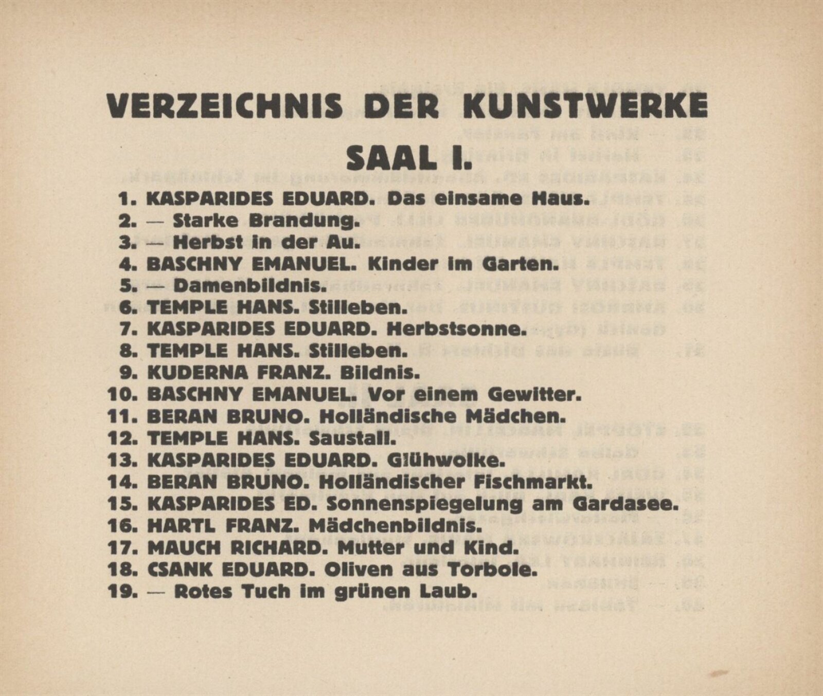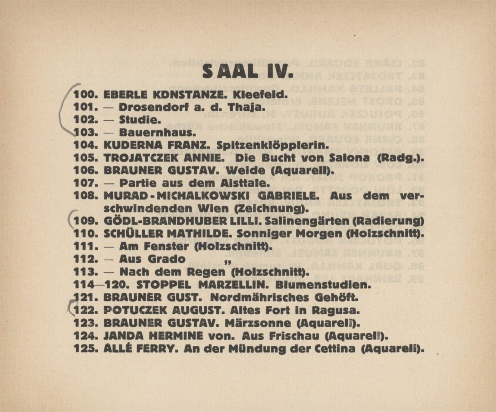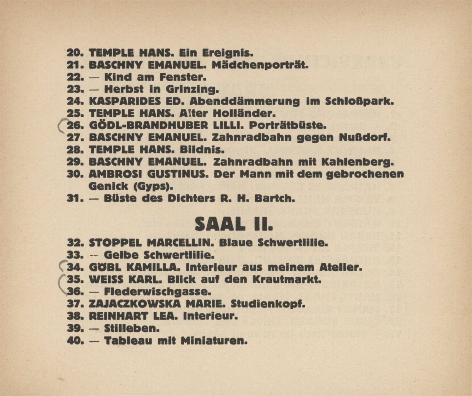 Ferry Allé, Gustinus Ambroise, Emanuel Baschny, Bruno Beran, Gustav Brauner, Samuel Brauner, Ernst Czernotzky, Eduard Csank, Helene Drost, Robert Farsky, Fischer-Schuch, Konstanze Eberle, Kamilla Göbl, Lilli Gödl-Brandhuber, Henriette Heller, Franz Hartl, Hermine Janda, Rudolf Jelinek, Eduard Kasparides, Franz Kuderna, Willibald Lischka, Dorette Löw, Richard Mauch, Murad-Michalkowski, Kamillo Pallete, Alexander Pock, August Potuczek, Josef Prokop, Lea Reinhart, Mathilde Schüller, Konstantin Stoitzner, Marzellin Stoppel, Hans Temple, Anni Trojatczek, Marie Zajaczkowska