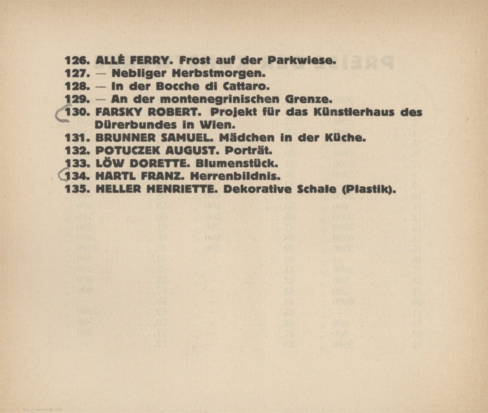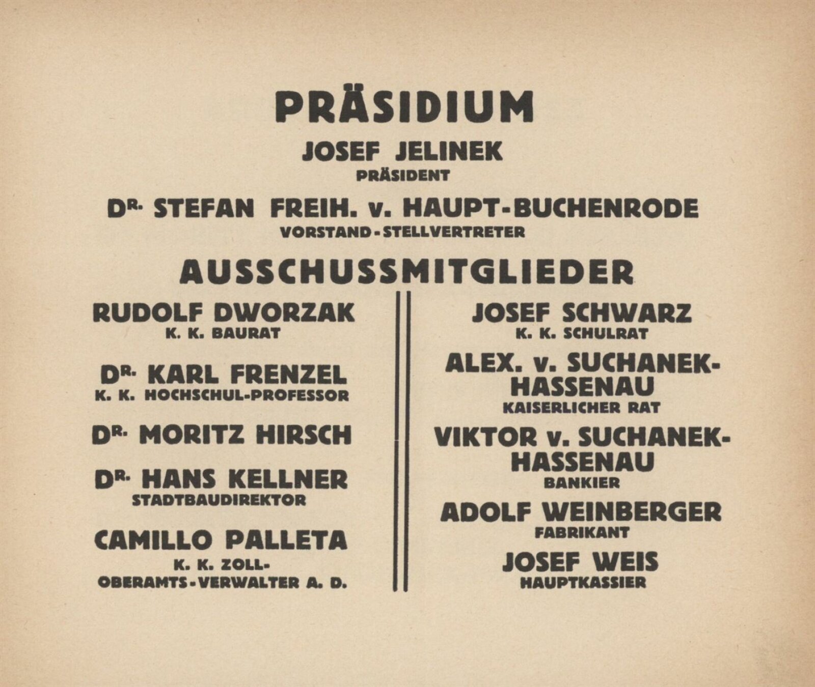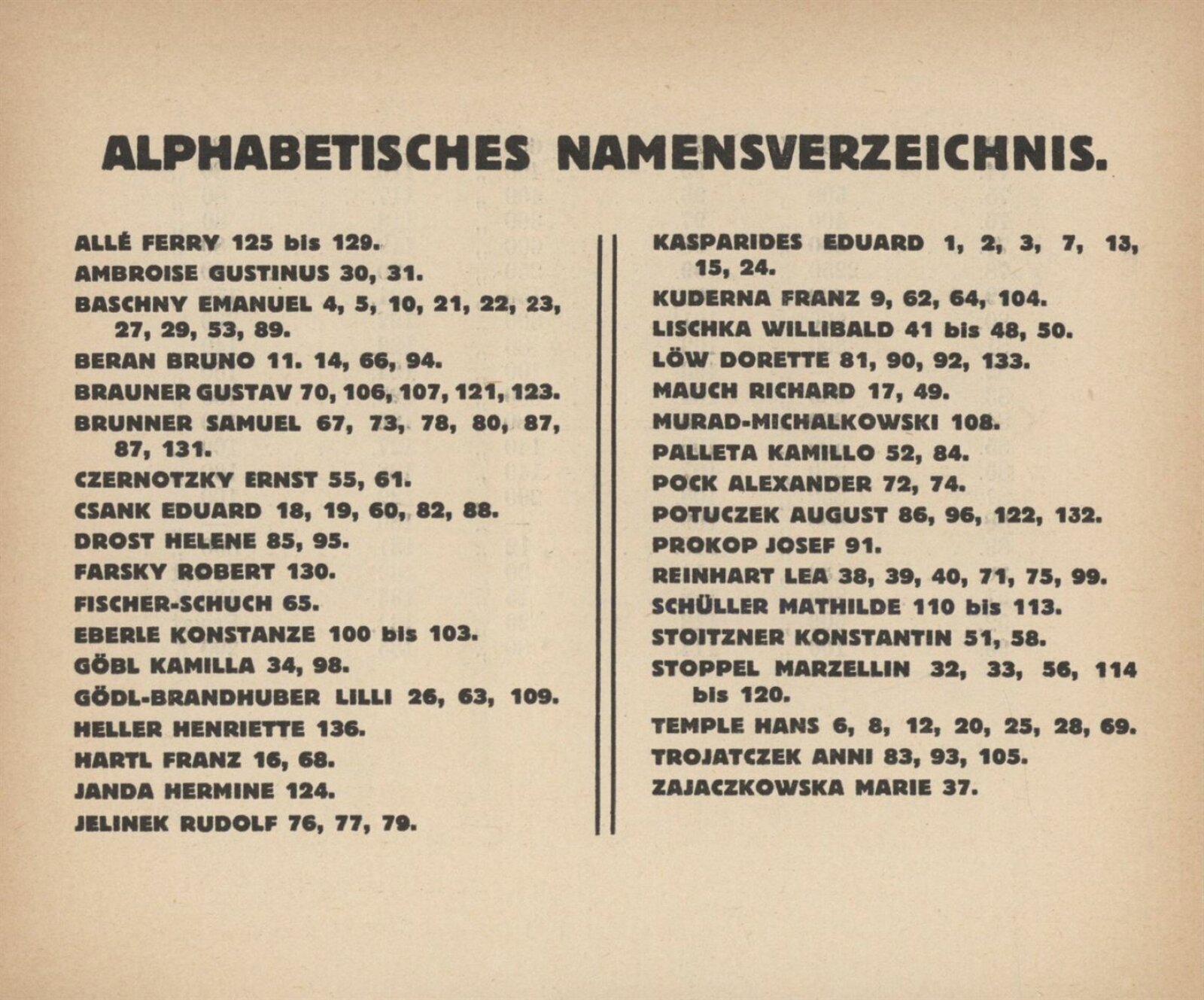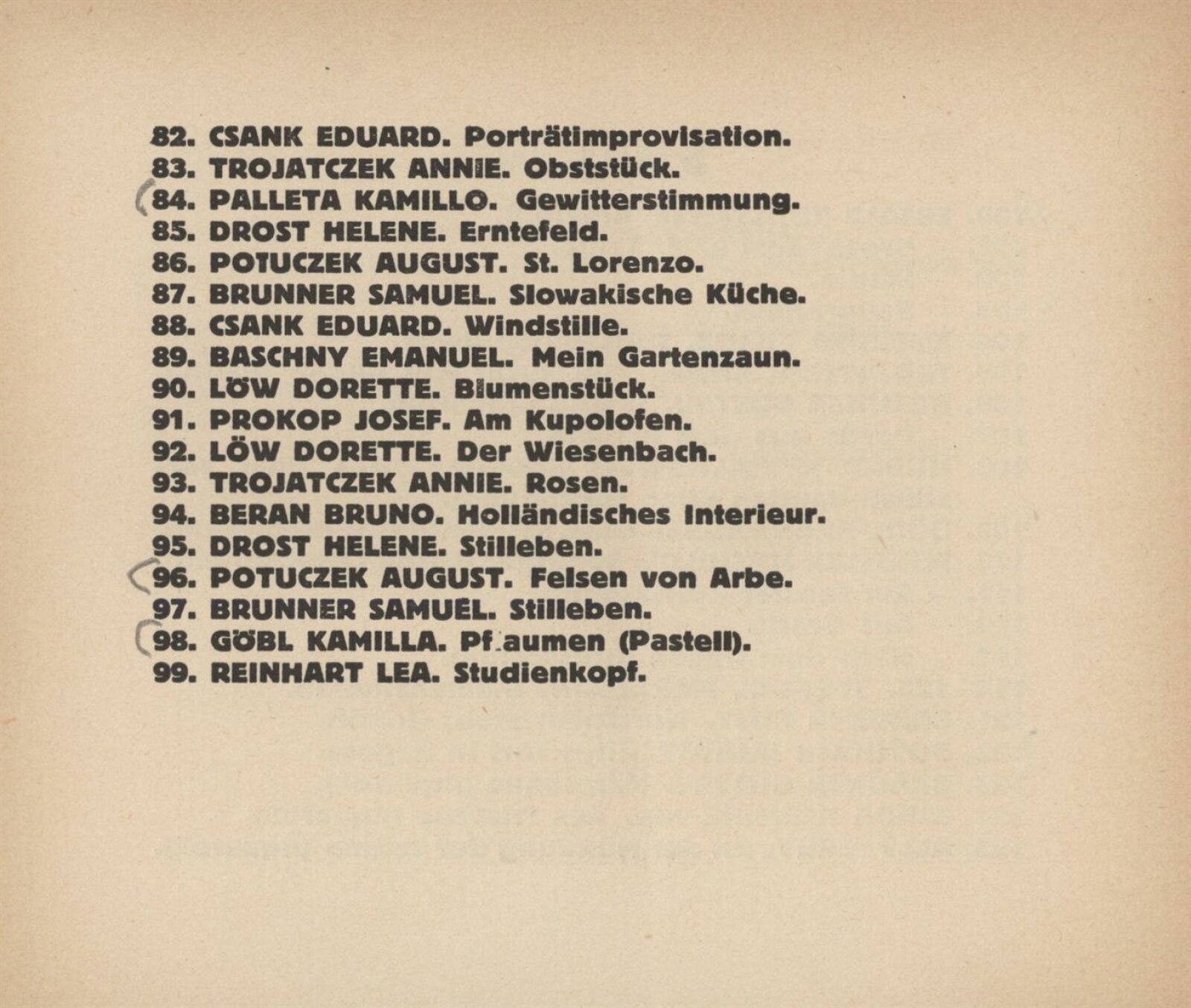 Ferry Allé, Gustinus Ambroise, Emanuel Baschny, Bruno Beran, Gustav Brauner, Samuel Brauner, Ernst Czernotzky, Eduard Csank, Helene Drost, Robert Farsky, Fischer-Schuch, Konstanze Eberle, Kamilla Göbl, Lilli Gödl-Brandhuber, Henriette Heller, Franz Hartl, Hermine Janda, Rudolf Jelinek, Eduard Kasparides, Franz Kuderna, Willibald Lischka, Dorette Löw, Richard Mauch, Murad-Michalkowski, Kamillo Pallete, Alexander Pock, August Potuczek, Josef Prokop, Lea Reinhart, Mathilde Schüller, Konstantin Stoitzner, Marzellin Stoppel, Hans Temple, Anni Trojatczek, Marie Zajaczkowska