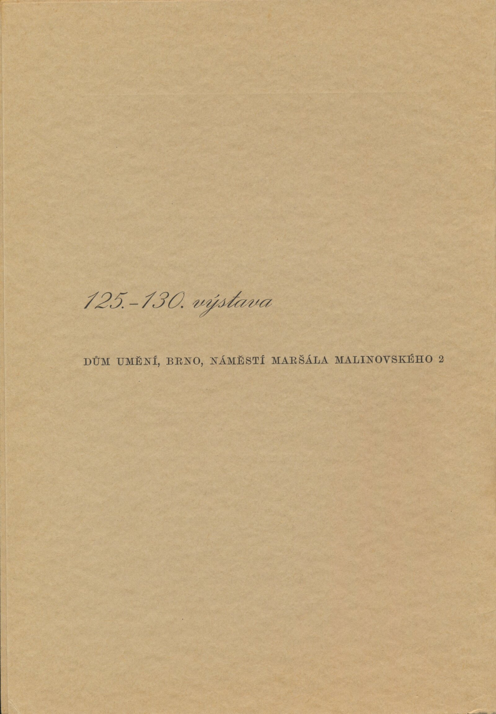Katalog výstav Domu umění, výstavní list Domu umění, pořádaných mezi březnem a dubnem 1950 / Obsahuje výstavy: Sochař Josef Axmann. 125. výstava, Sochař Bohumil Hochman. 126. výstava, Malíř Josef Zamazal. 127. výstava, Dramatické dílo Aloise Jiráska v moravskoslezském divadelnictví. 128. výstava, Život a dílo V. V. Majakovského. 129. výstava, Kresby řeckých dětí. 130. výstava / Texty: A. L., J. B. Svrčka. – Brno: Dům umění, 1950. – 32 s., obr., životopisy umělců, soupisy prací, DU 125–130. – MG; MMB