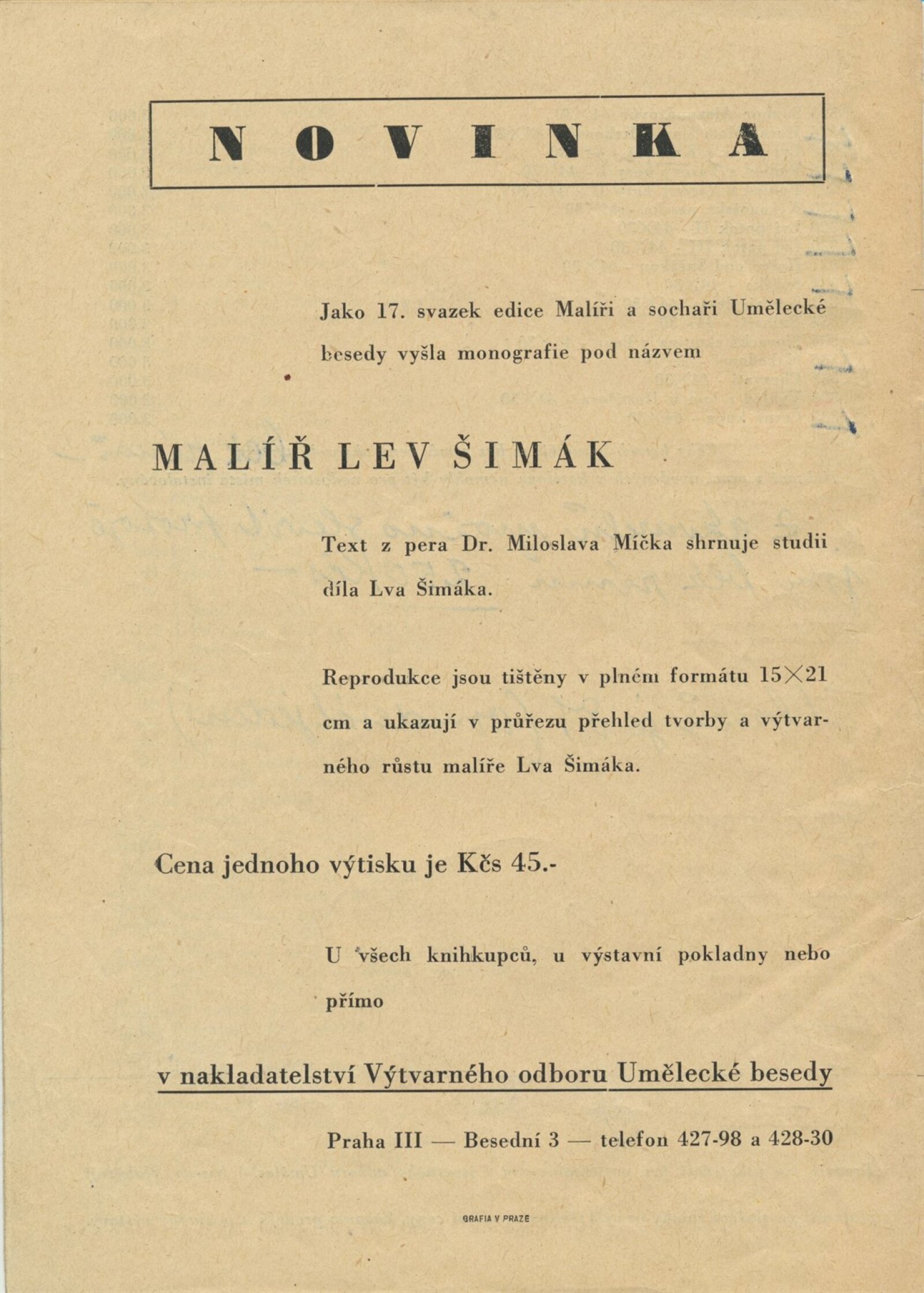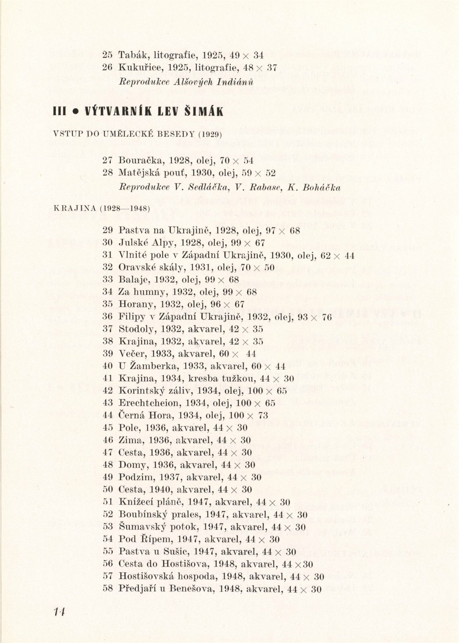 Malíř Lev Šimák. 100. výstava. (výstavní list): Dům umění, 31. 3. – 27. 4. 1949 / Text: Jiří Venera. – Brno: Dům umění, 1949. – 32 s., obr., báseň J. Venera, DU 100. – MZK; MG; MMB