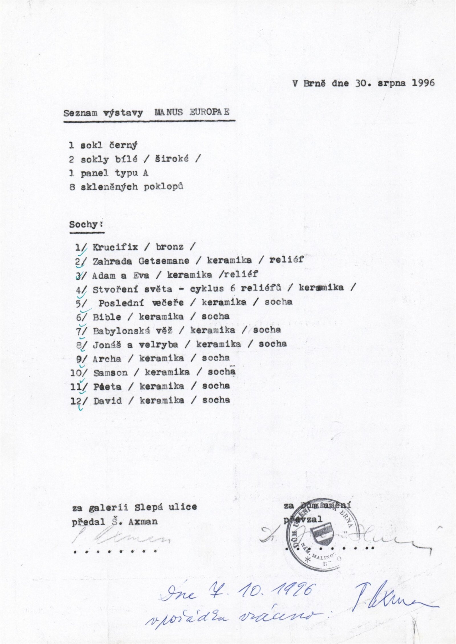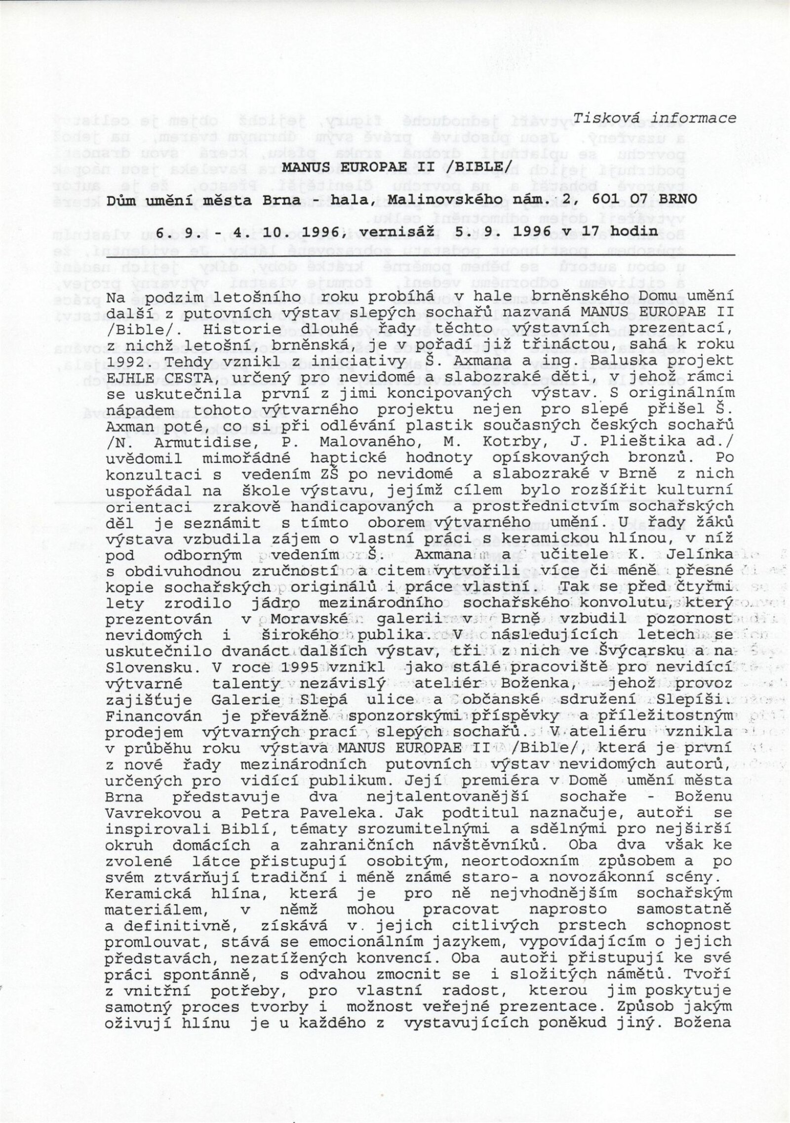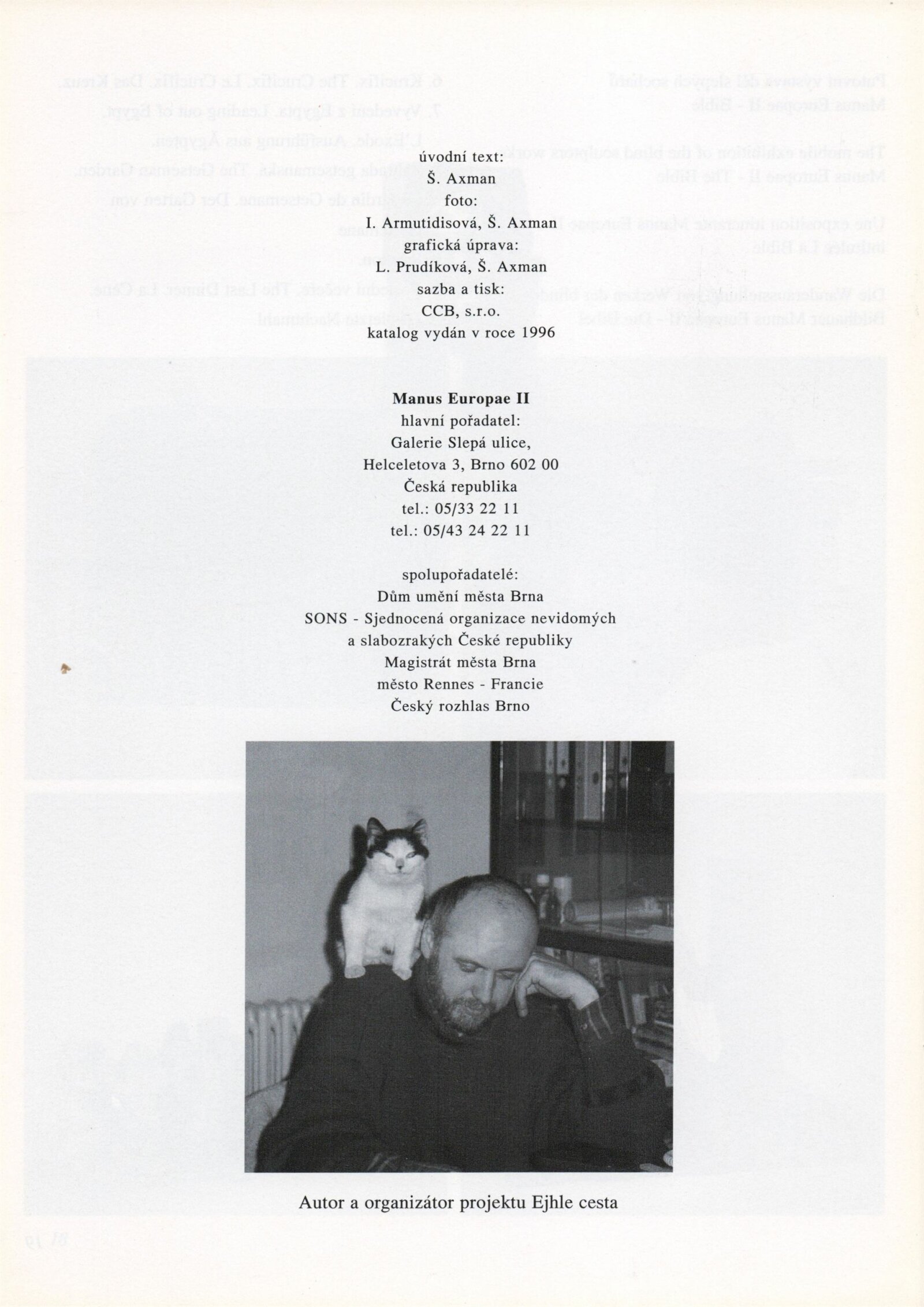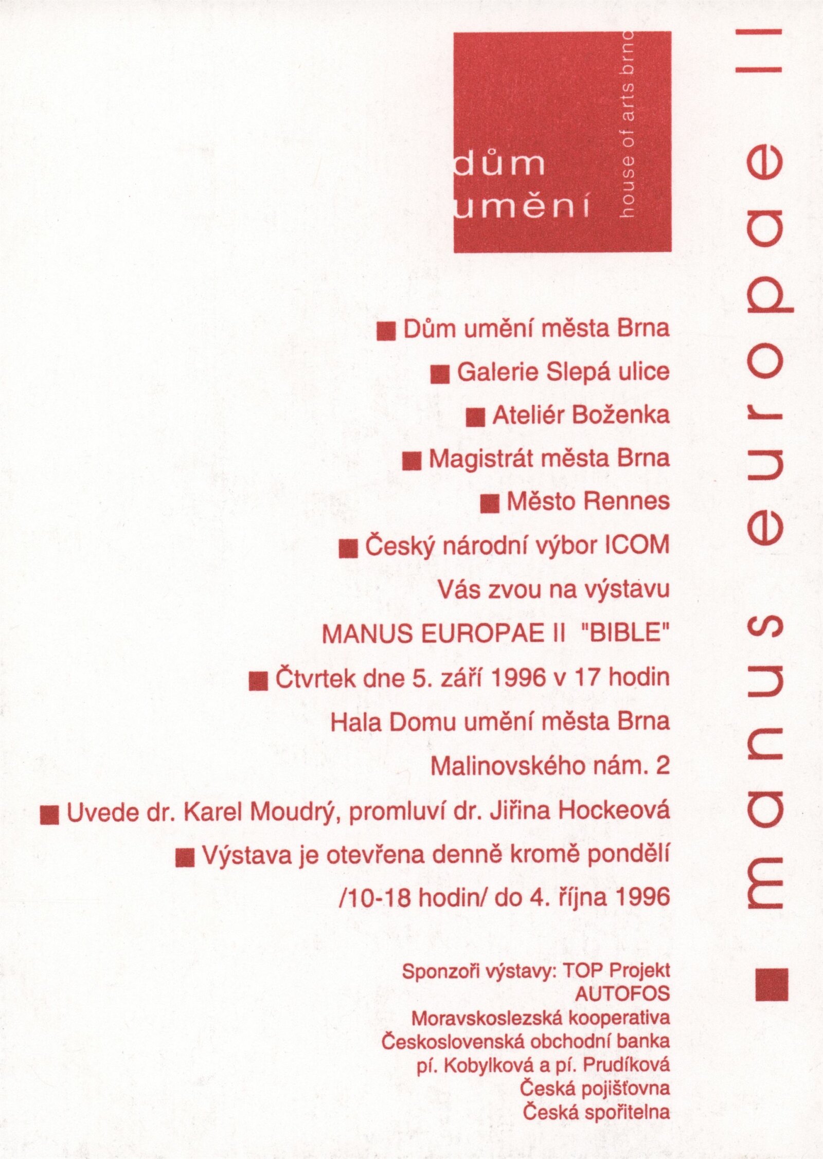 Ejhle cesta. Manus Europae II. Bible: Dům umění města Brna, hala, 5. 9. – 4. 10. 1996 / Text: Štěpan Axmann. – Brno: Galerie Slepá ulice, 1996. – [20] s., obr., katalog putovní výstavy, DU 1031