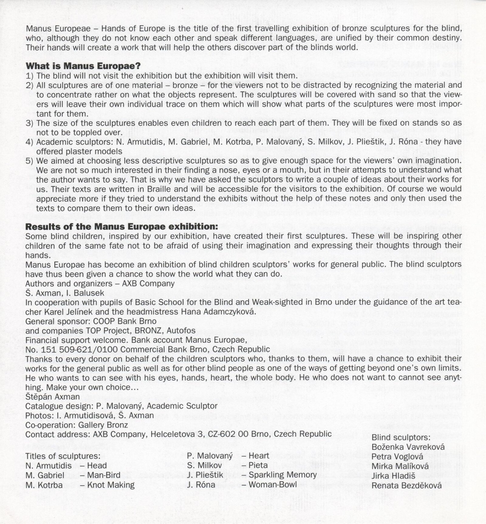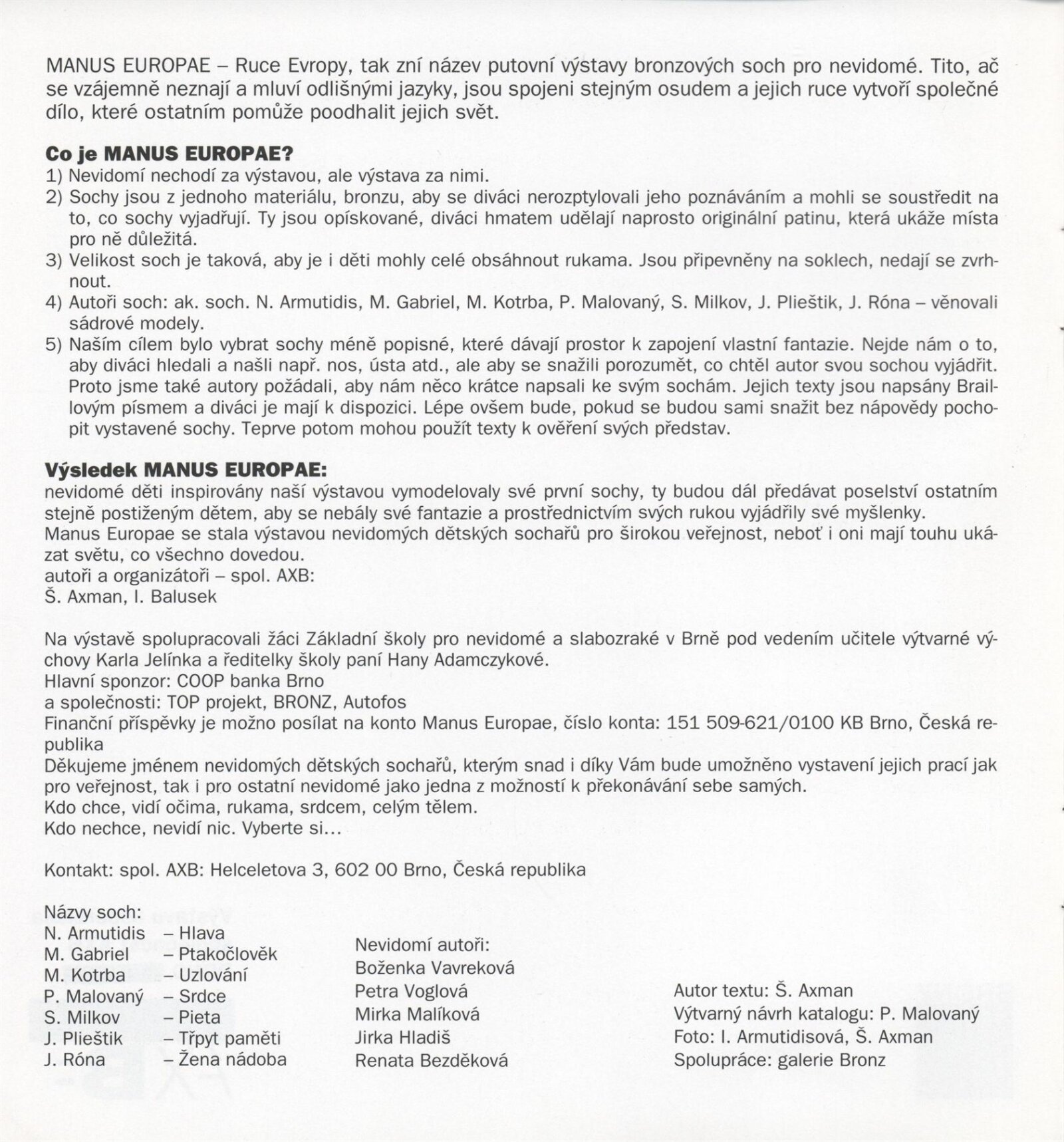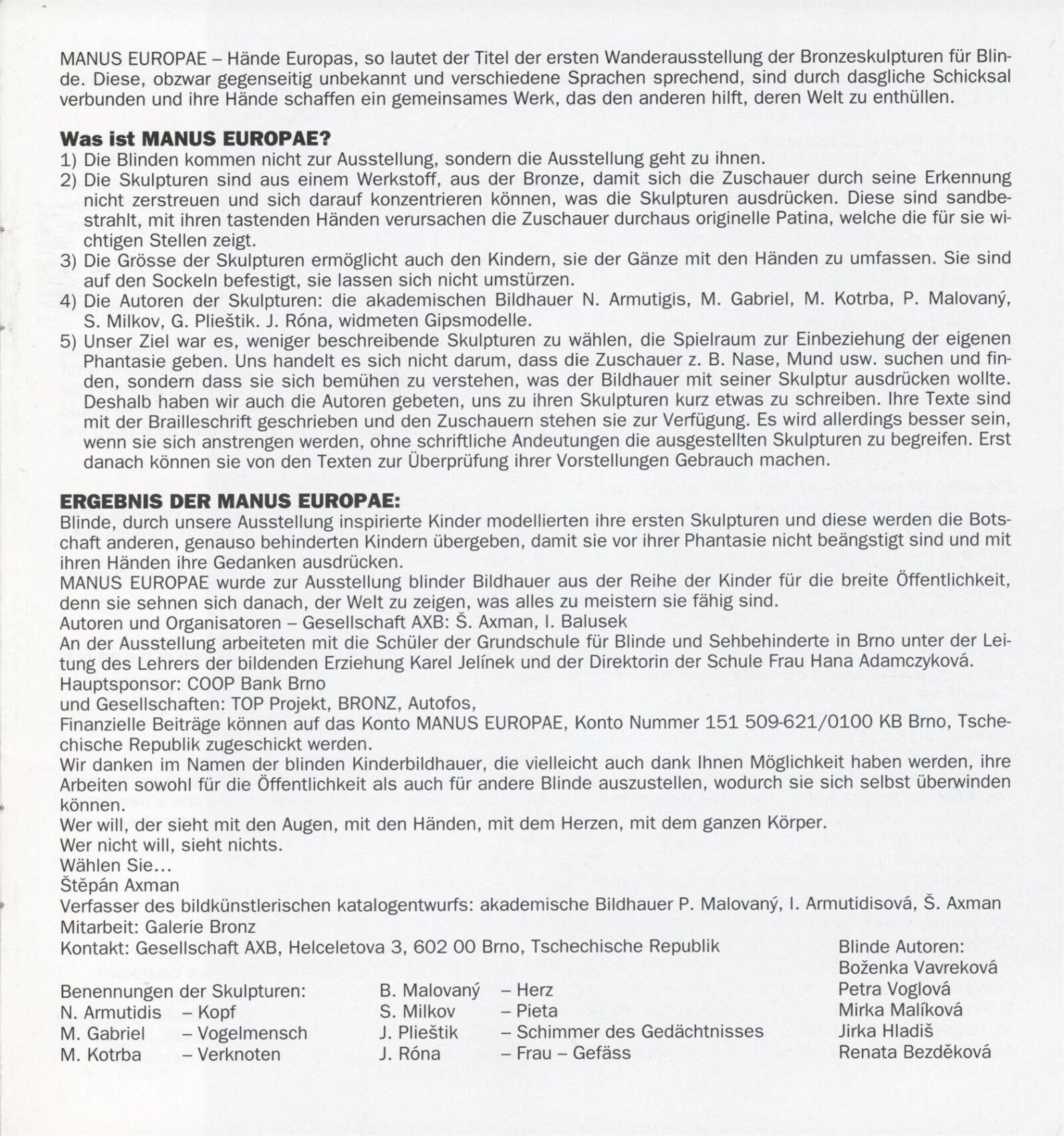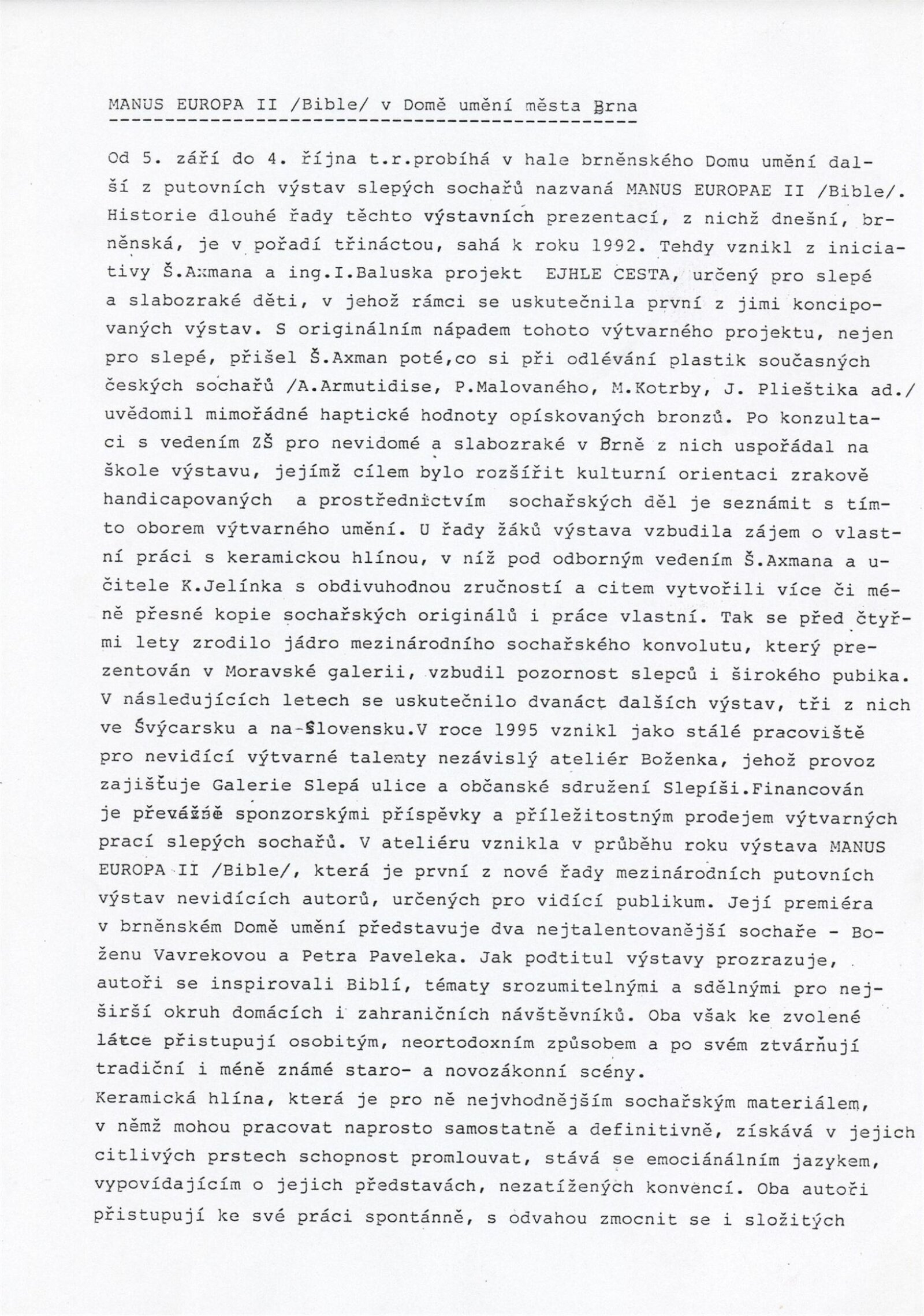 Ejhle cesta. Manus Europae II. Bible: Dům umění města Brna, hala, 5. 9. – 4. 10. 1996 / Text: Štěpan Axmann. – Brno: Galerie Slepá ulice, 1996. – [20] s., obr., katalog putovní výstavy, DU 1031