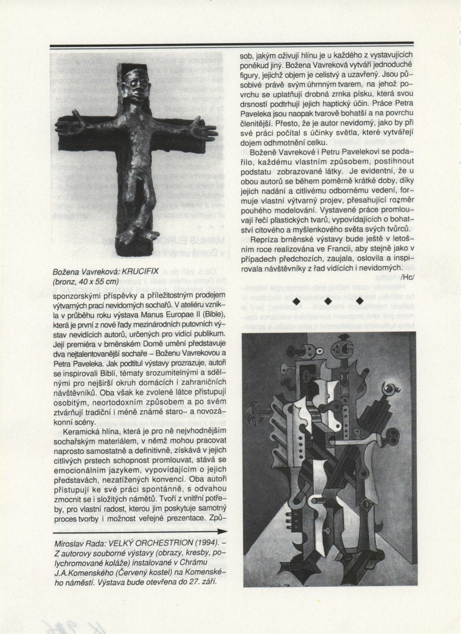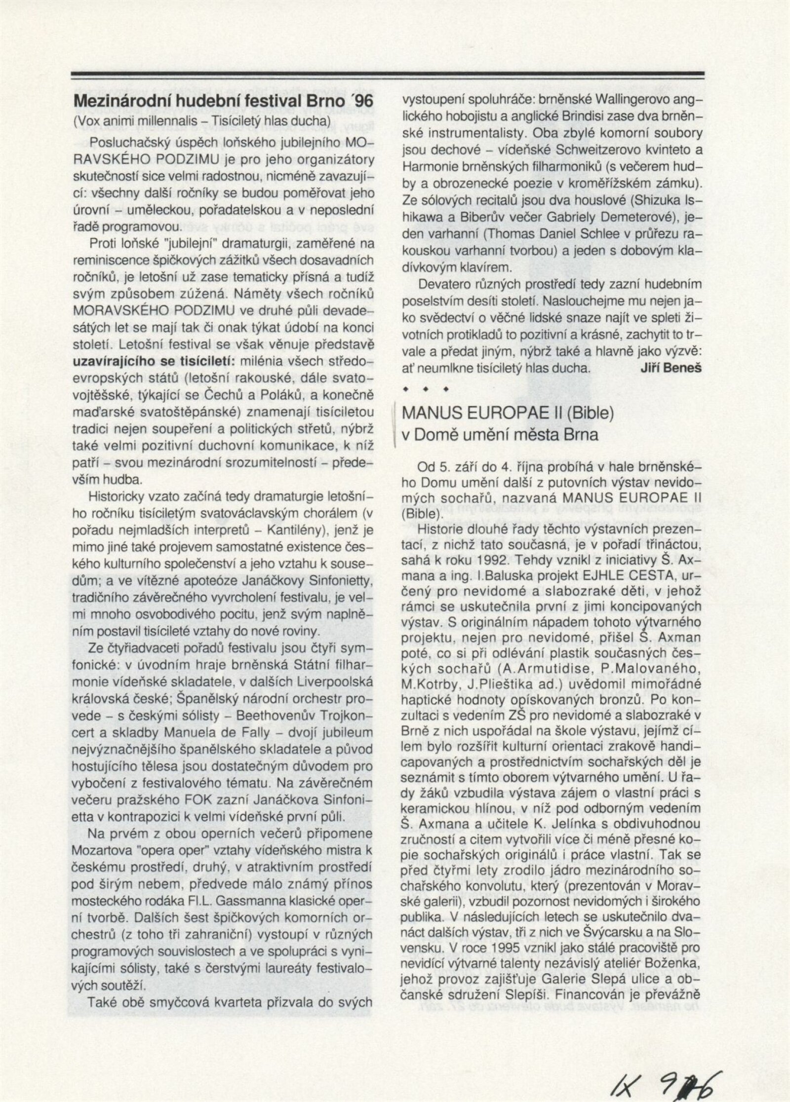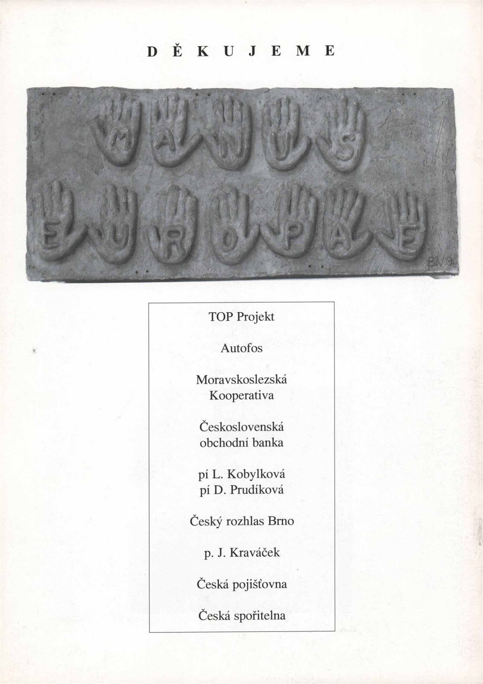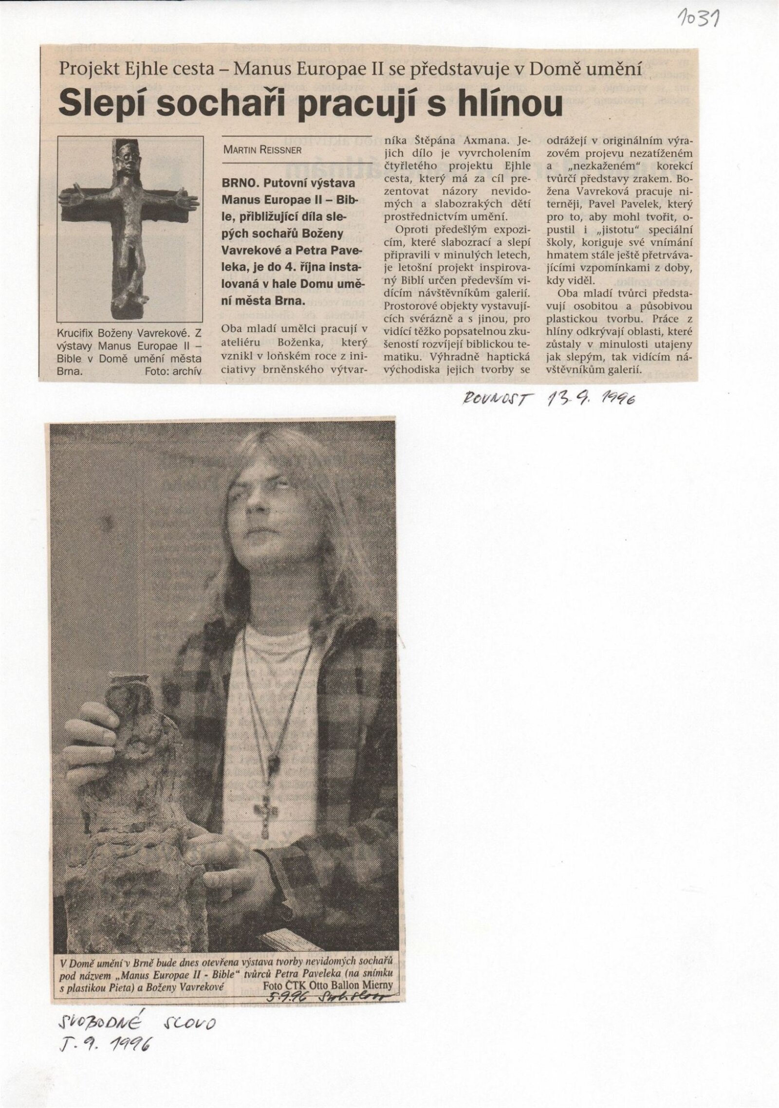 Ejhle cesta. Manus Europae II. Bible: Dům umění města Brna, hala, 5. 9. – 4. 10. 1996 / Text: Štěpan Axmann. – Brno: Galerie Slepá ulice, 1996. – [20] s., obr., katalog putovní výstavy, DU 1031