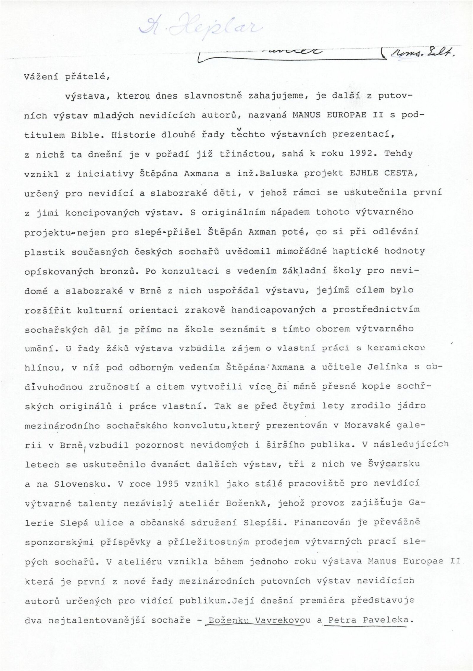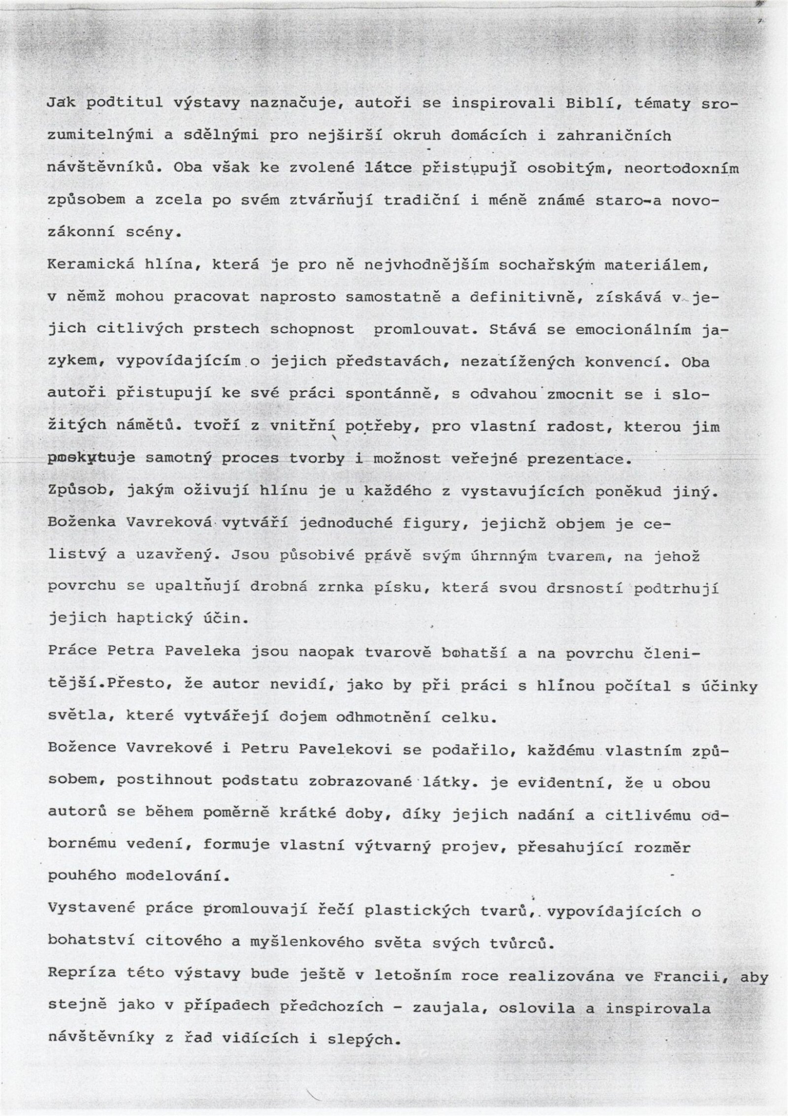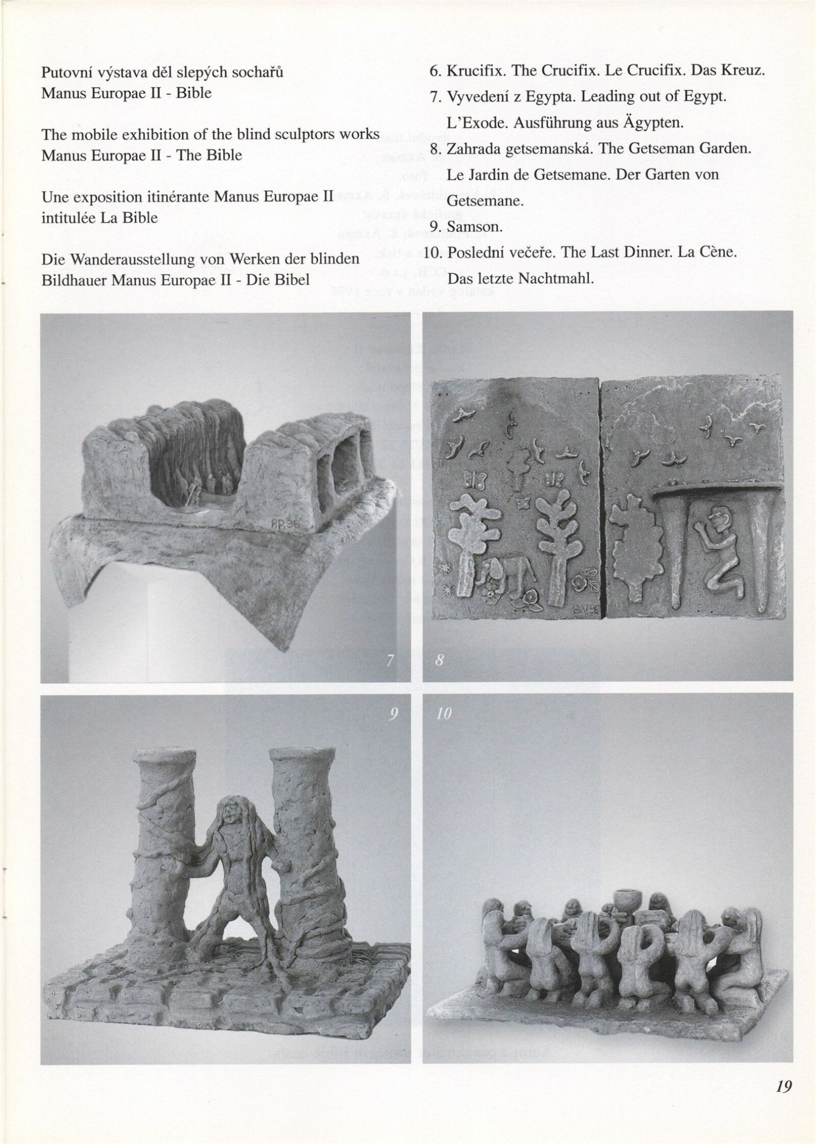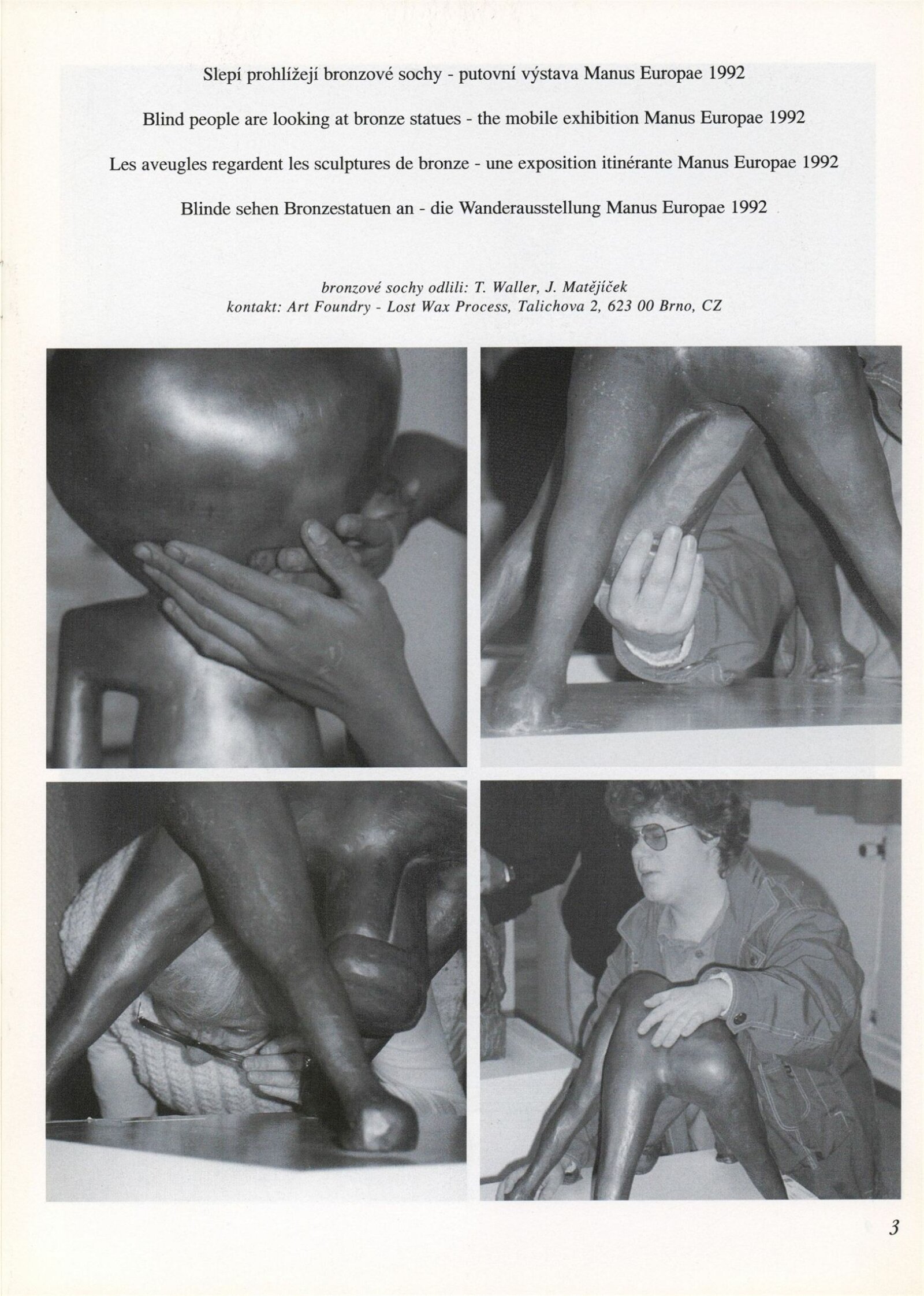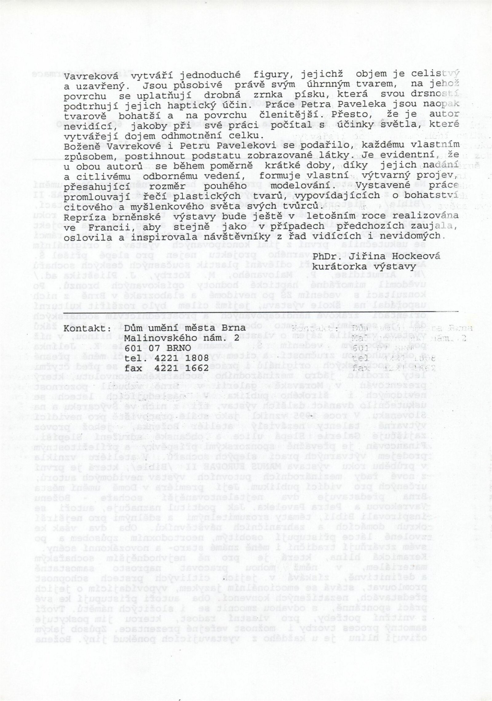 pozvánka na výstavu a tiskovou besedu, katalog, podklady pro pozvánky a katalog, fotografie děl, úvodní slovo vernisáž, texty - zpráv pro média (J. Hockeová), seznam vystavených děl, provozní korespondence, žádost TT klubu o poskytnutí dotace na výstavu v DU a Galerie Slepá ulice na Mezinárodní centrum hmatového modelování, kontakt a adresa, recenze v tisku, poznámky