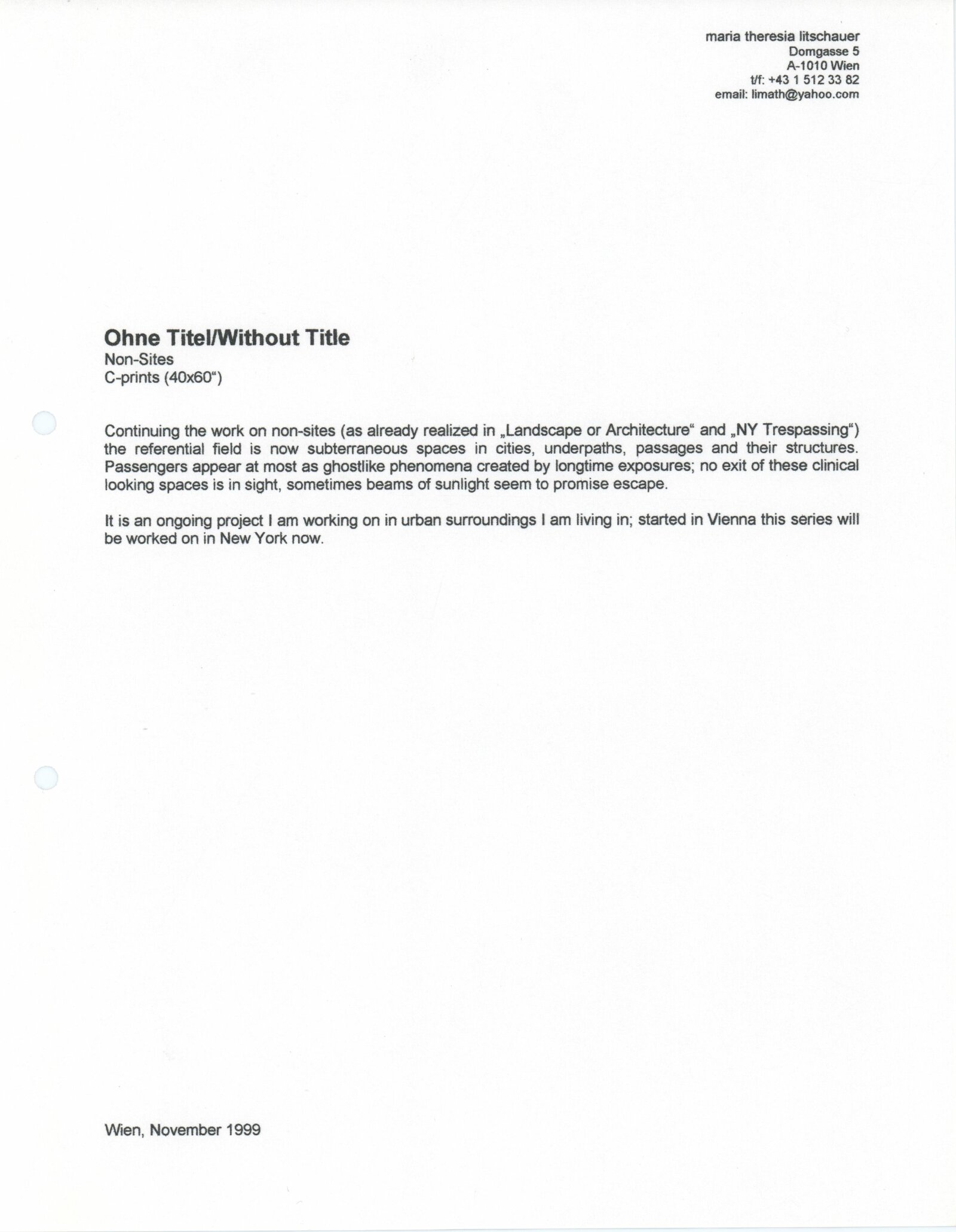 pozvánka, texty k výstavě, biografie, seznam vystavených děl, provozní korespondence, korespondence o realizaci výstavy, žádost o finanční podporu výstavy, smlouvy k výstavě, celní dokumenty, návrh rozpočtu, recenze v tisku, poznámky