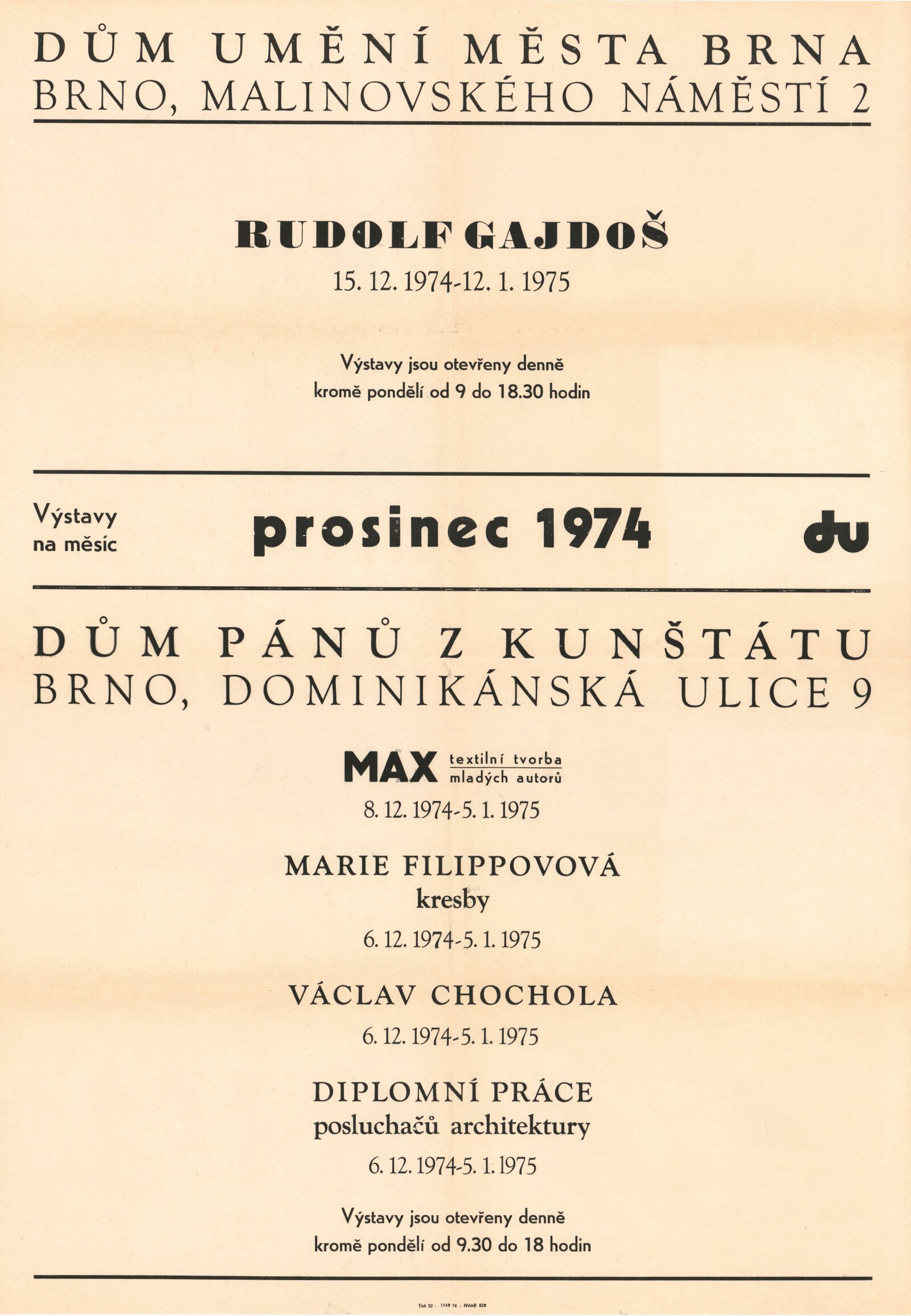 Marie Filippovová. Kresby 1973–1974: Dům umění / Dům pánů z Kunštátu, 146. výstava Kabinetu grafiky, 6. 12. 1974 – 5. 1. 1975 / Text: Nina Dvořáková. – Brno: DUmB, 1974. – slož. list, obr., životopis, DPK 582. – MMB