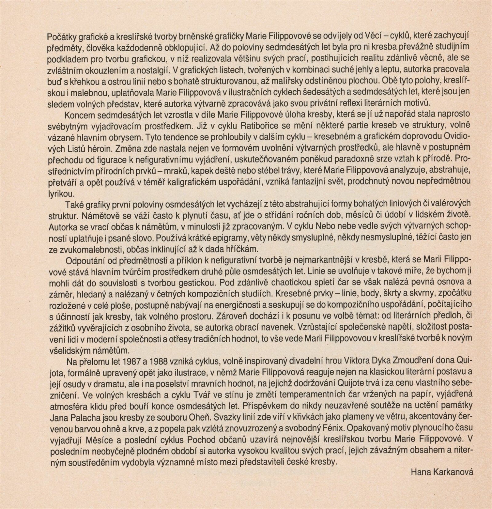 Marie Filippovová. Kresby, grafiky: Dům umění města Brna, 157. výstava v Galerii Jaroslava Krále, 22. 4. – 31. 5. 1990 / Text: Hana Karkanová. – Brno: ČFVU-Dílo, 1990. – [12] s., obr., životní data, výstavy, ceny, zastoupení ve sbírkách, DU 885