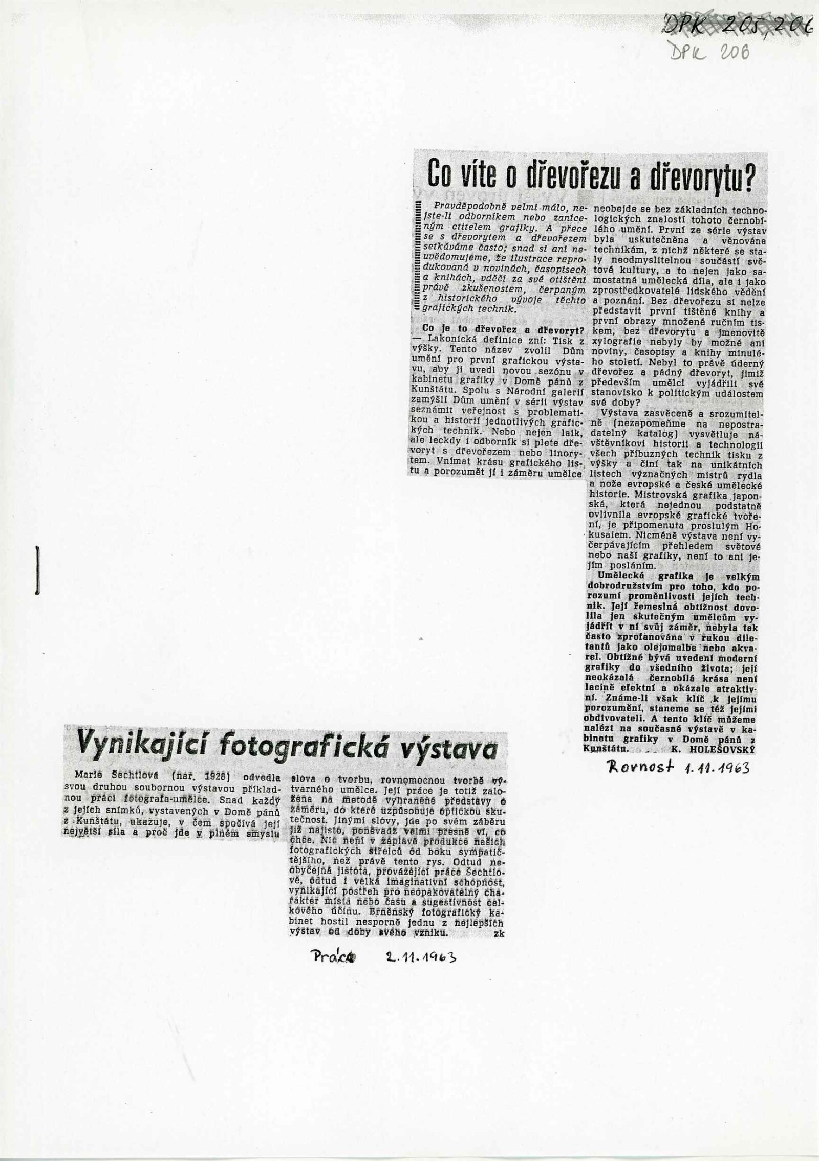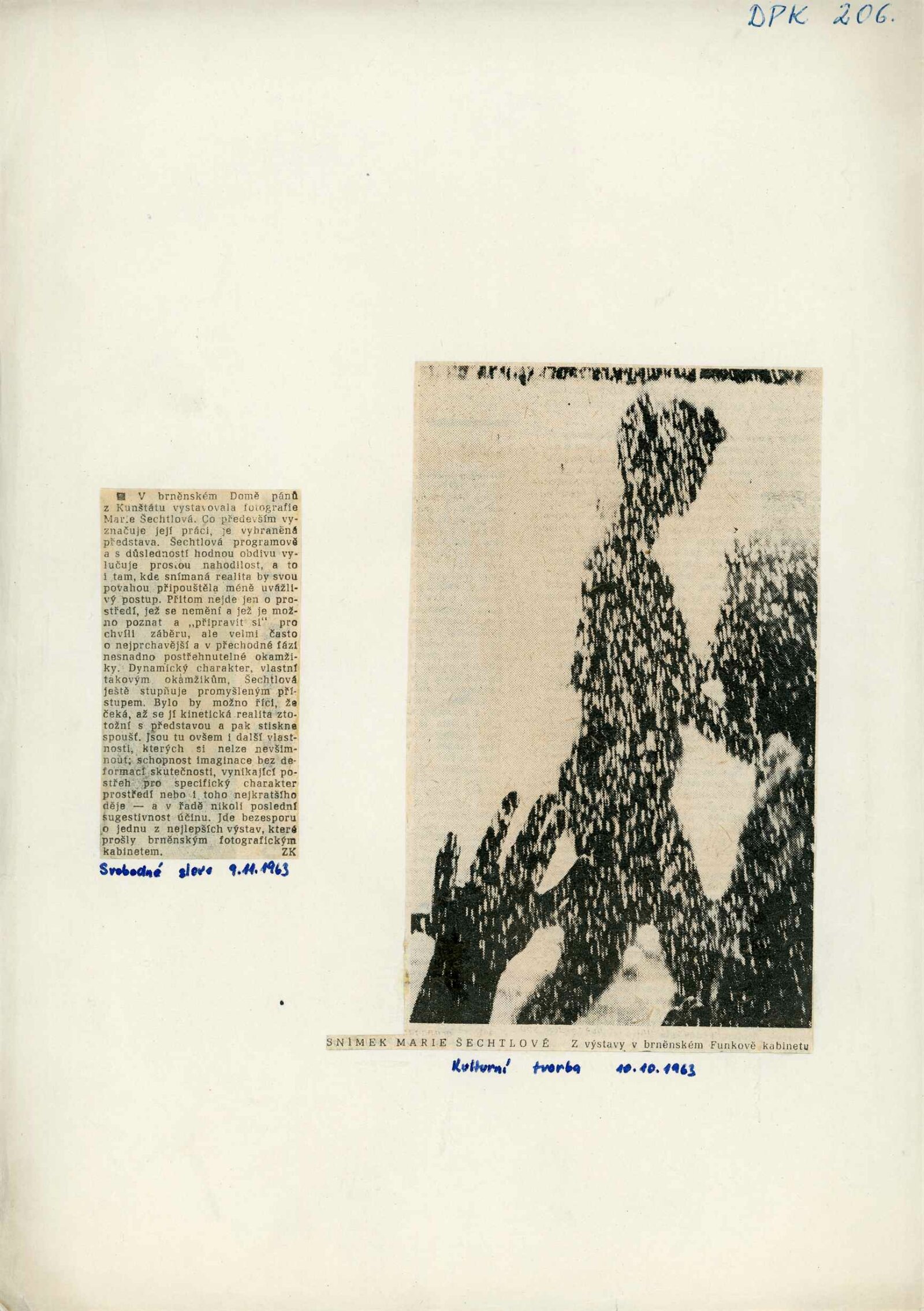 společná pozvánka s DPK 205, katalog, strojopis katalogu J. Noha, fotografie, podmínky pro uspořádání výstavy, korespondence (příprava výstavy – Marie Šechtlová, Adolf Kroupa, Nina Dvořáková), recenze v tisku