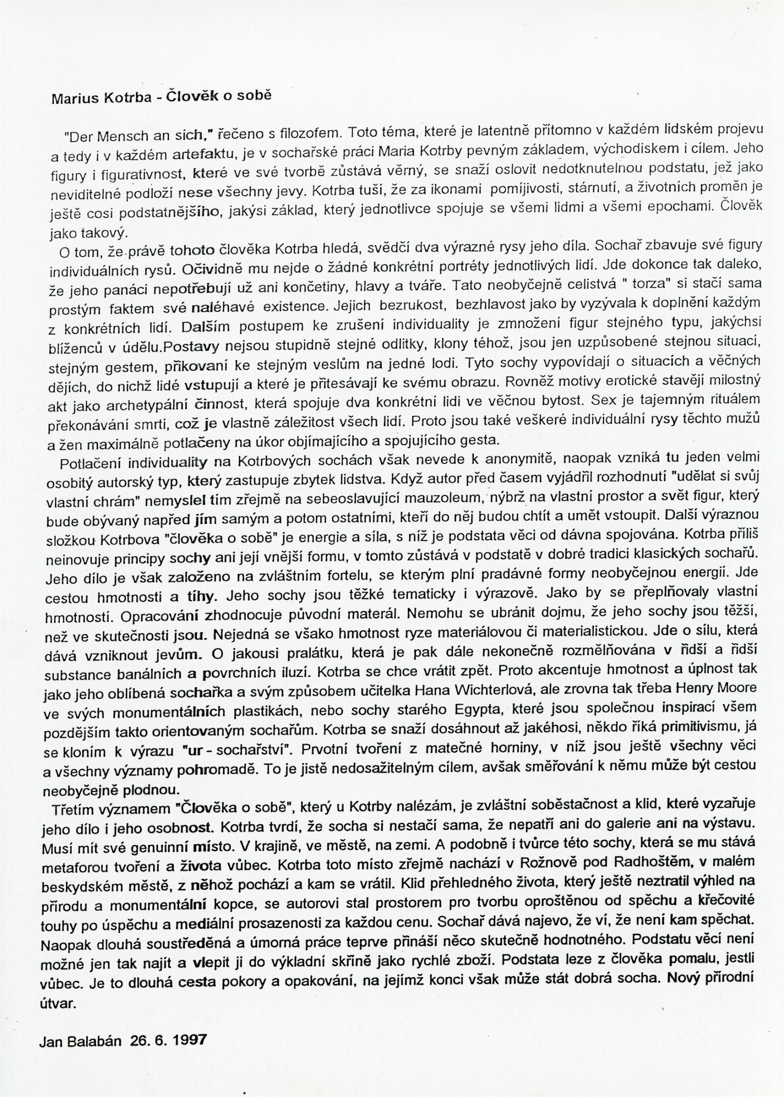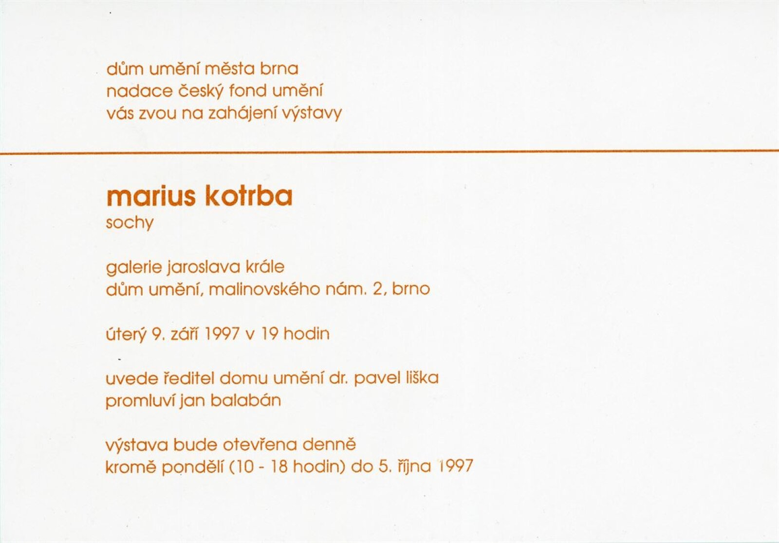 Márius Kotrba. Sochy: Dům umění města Brna, Galerie Jaroslava Krále, 9. 9. – 5. 10. 1997 / Text: Jan Balabán. – B. m. n. – 4 s., životní data, výstavy, symposia, DU 1060