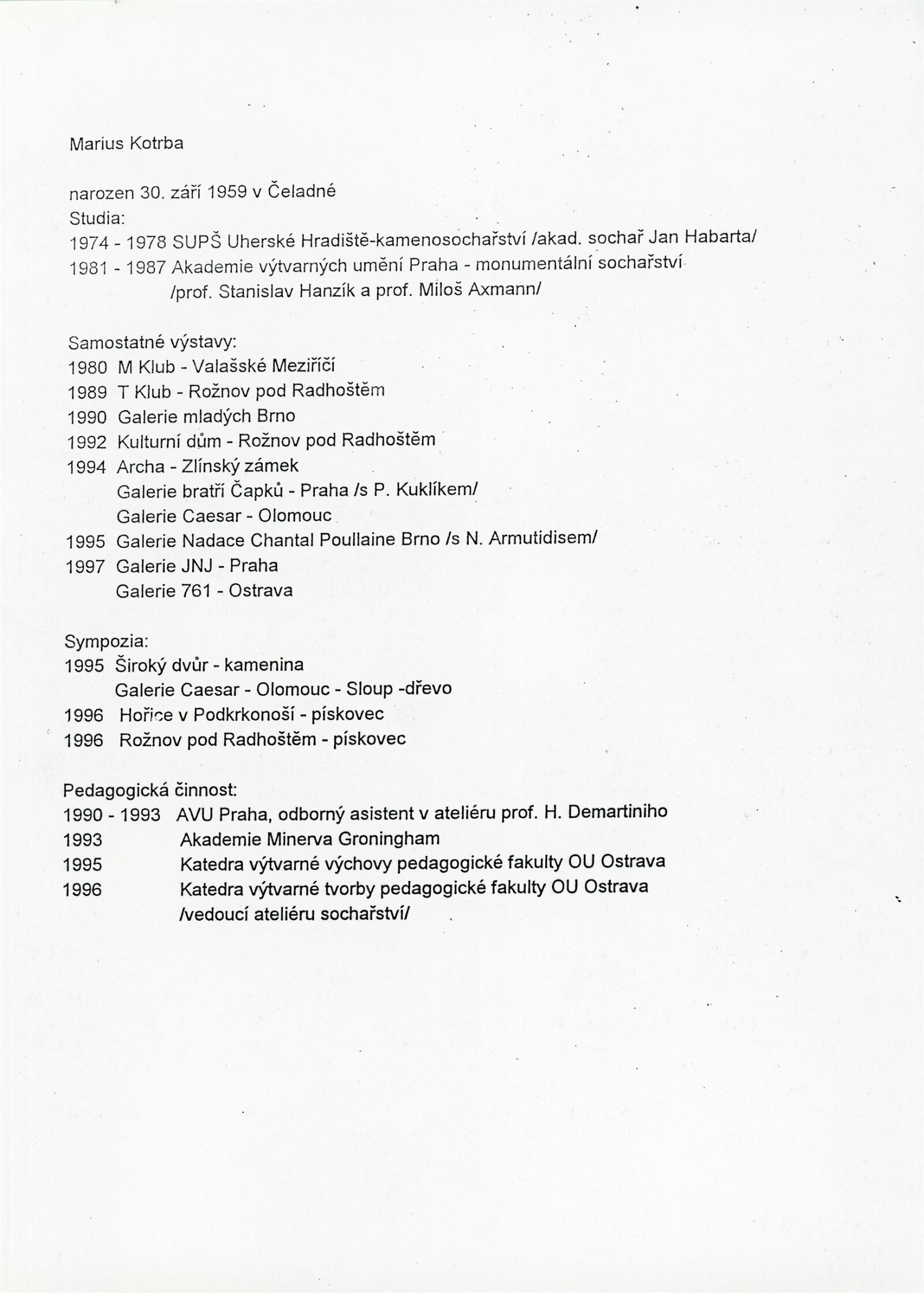 pozvánka, pohlednice, kresba PF 1997, dvoulist k výstavě s textem Jana Balabána, podklady pro katalog, fotografie vernisáže, 1 fotografie díla, provozní korespondence, recenze v tisku, pozvánka (JNJ Galerie, Praha, 1996), katalog (Muzeum jihovýchodní Moravy, Zlín 1994)