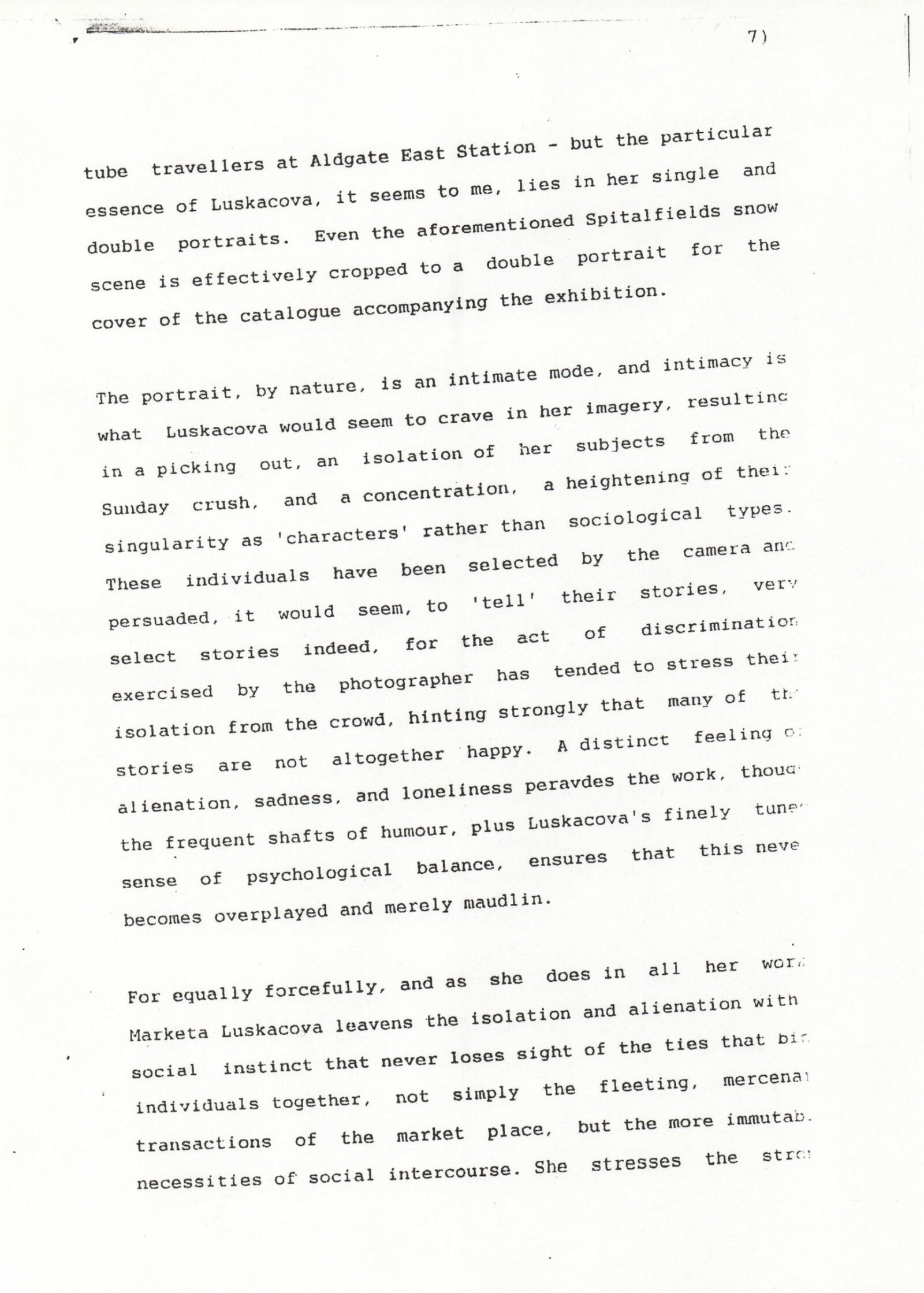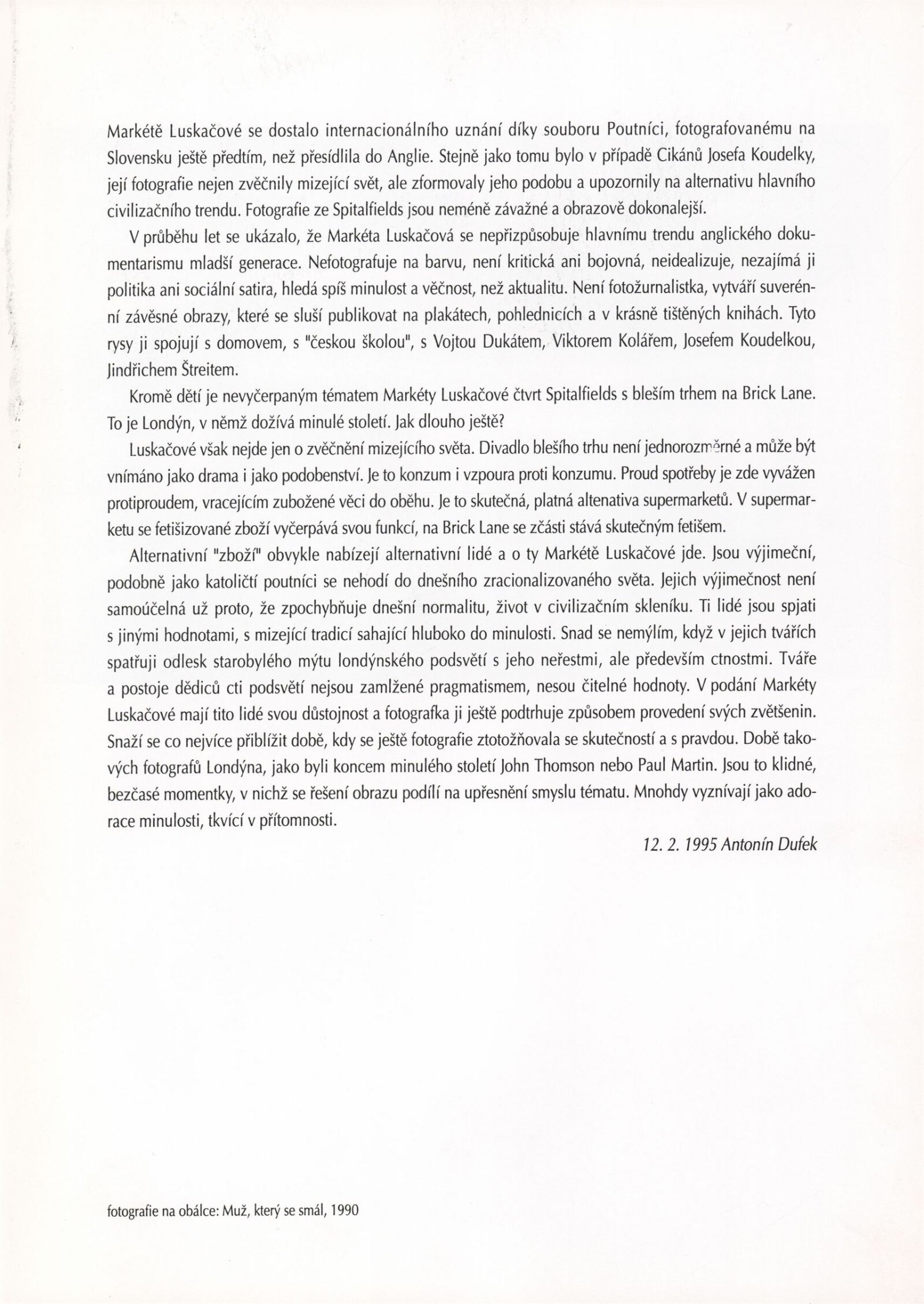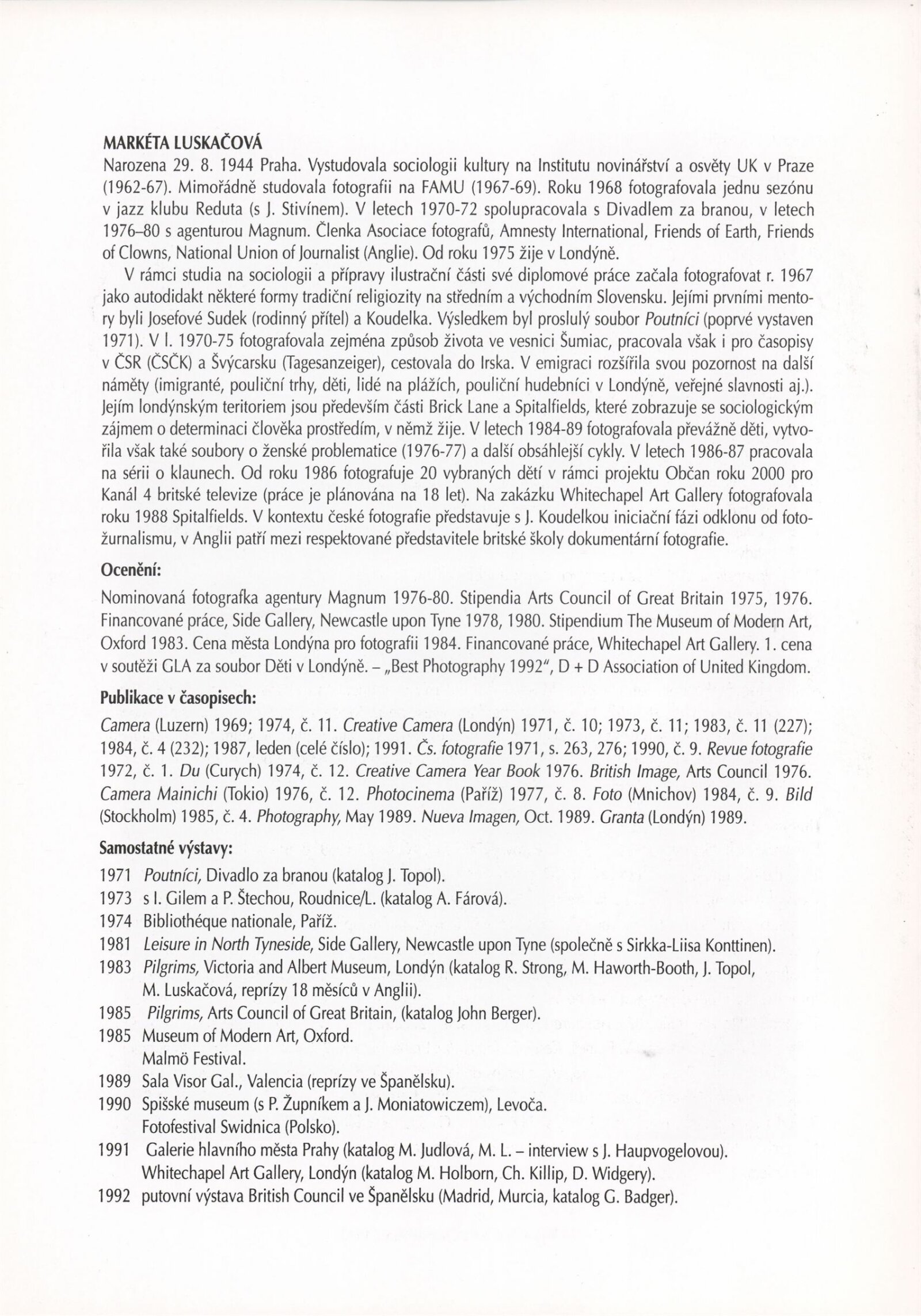 Markéta Luskačová. Fotografie ze Spitalfields , Londýn 1974–1990: Dům umění města Brna, hala, 16. 3. – 16. 4. 1995 / Text Antonín Dufek. - Brno: DUmB, - [16] s., obr. Životopis, ceny, výstavy, zastoupení ve sbírkách, bibliografie DU 989