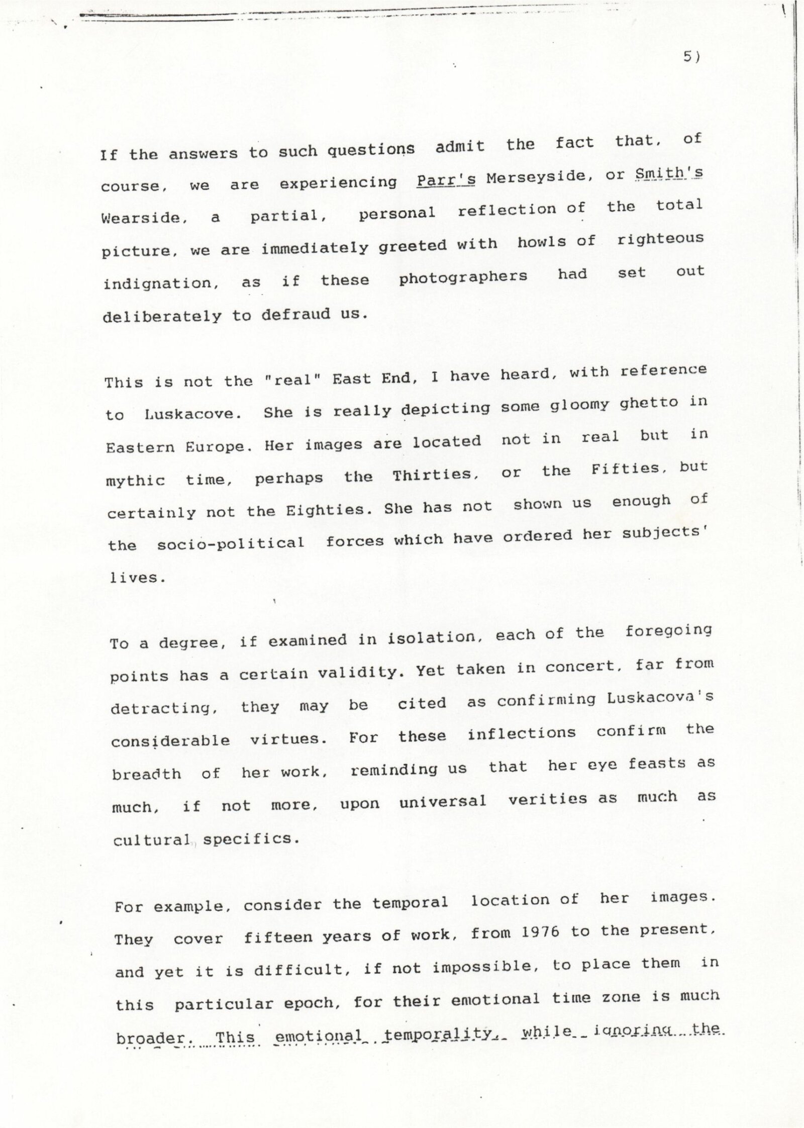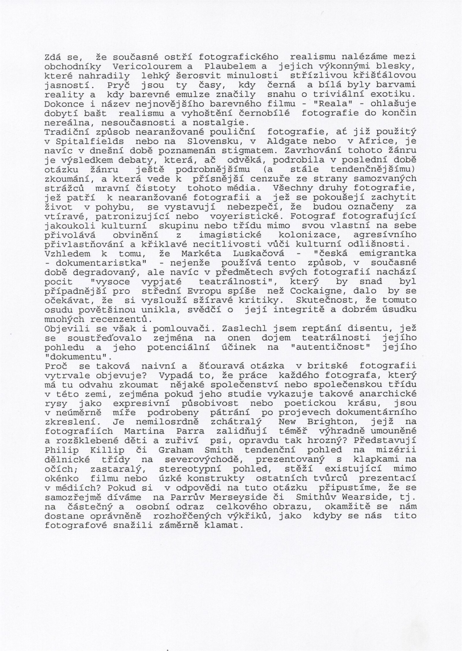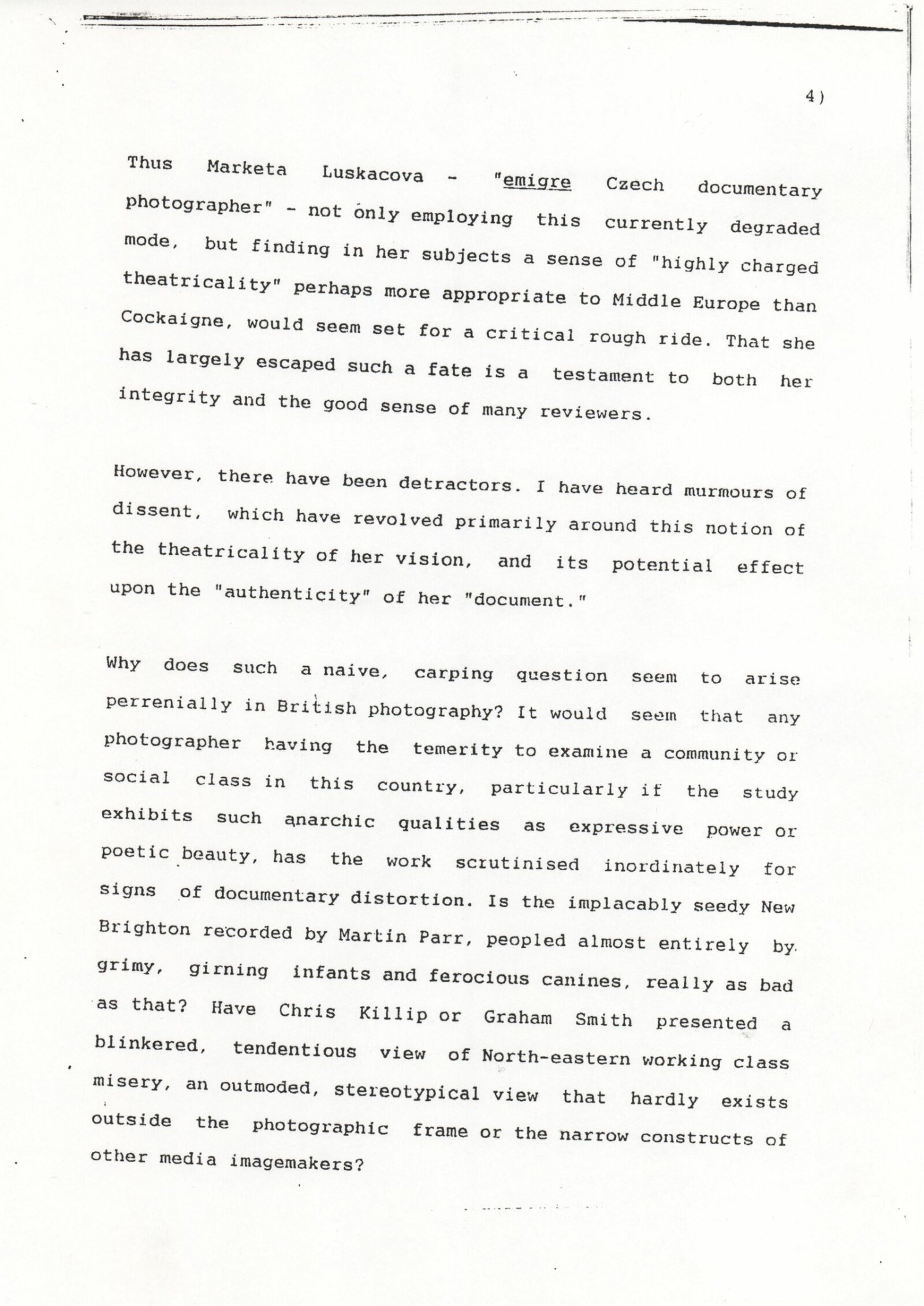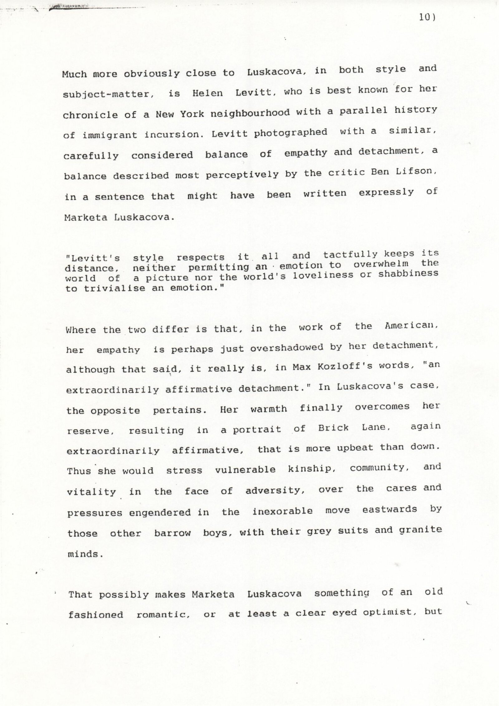 Markéta Luskačová. Fotografie ze Spitalfields , Londýn 1974–1990: Dům umění města Brna, hala, 16. 3. – 16. 4. 1995 / Text Antonín Dufek. - Brno: DUmB, - [16] s., obr. Životopis, ceny, výstavy, zastoupení ve sbírkách, bibliografie DU 989