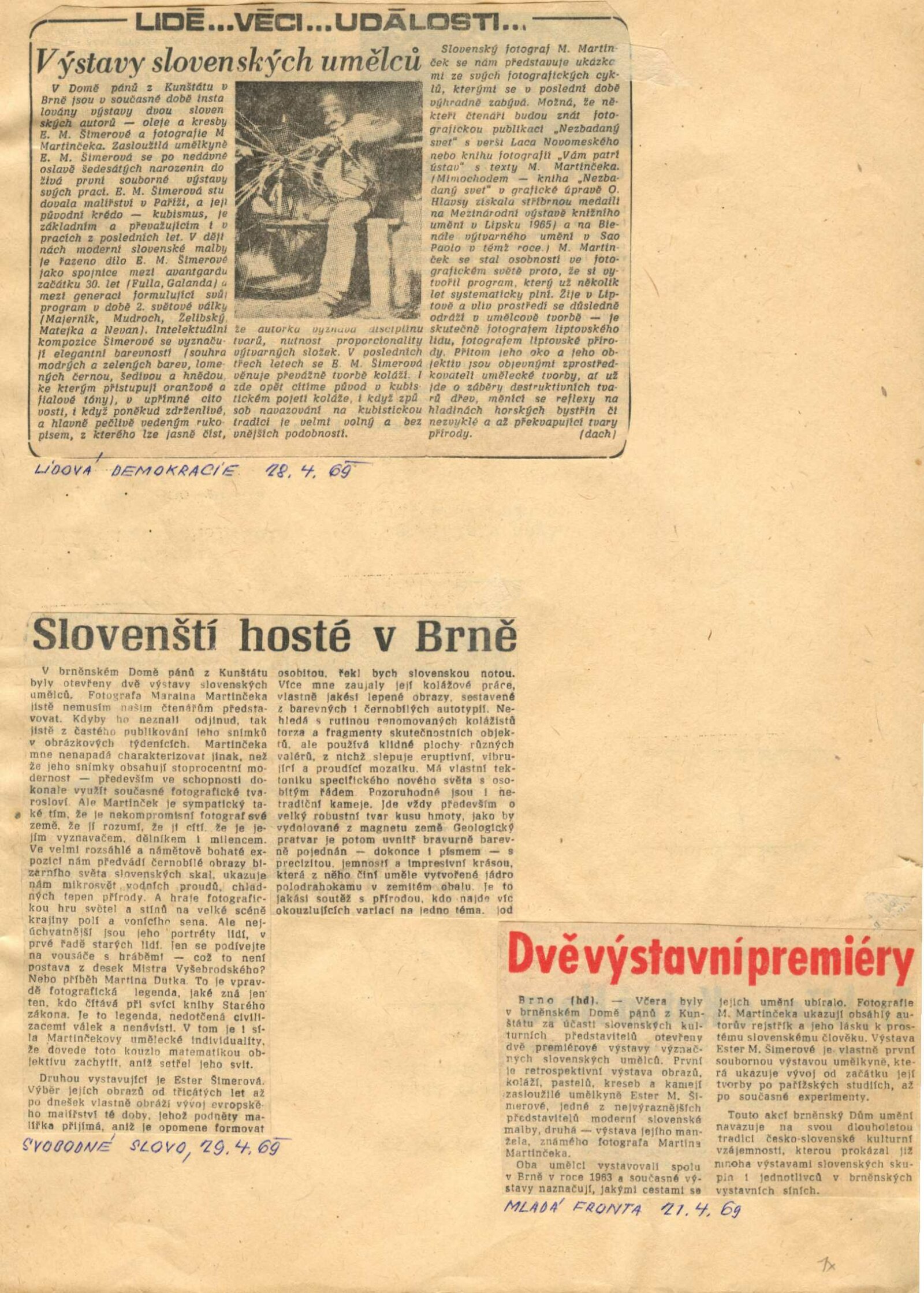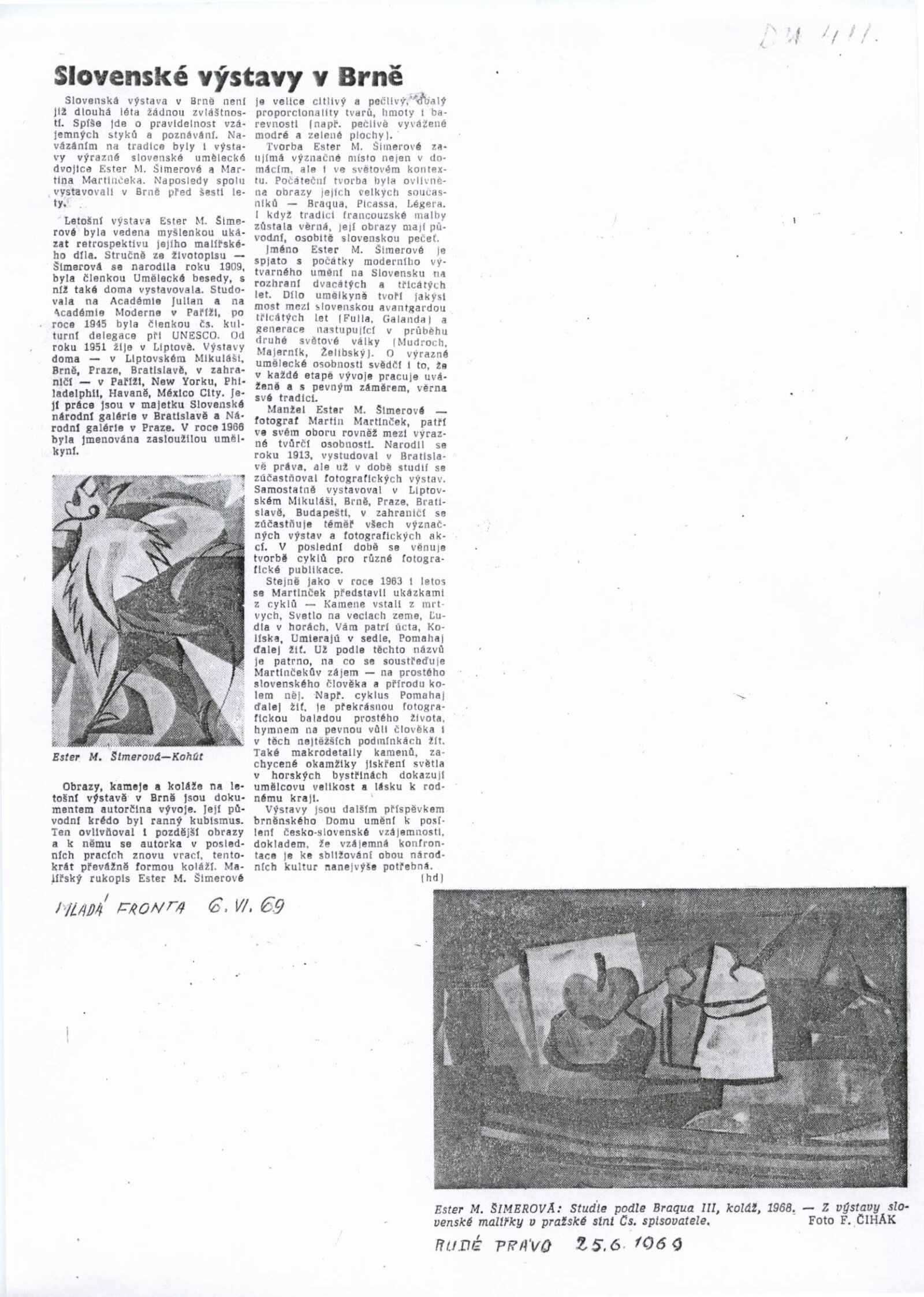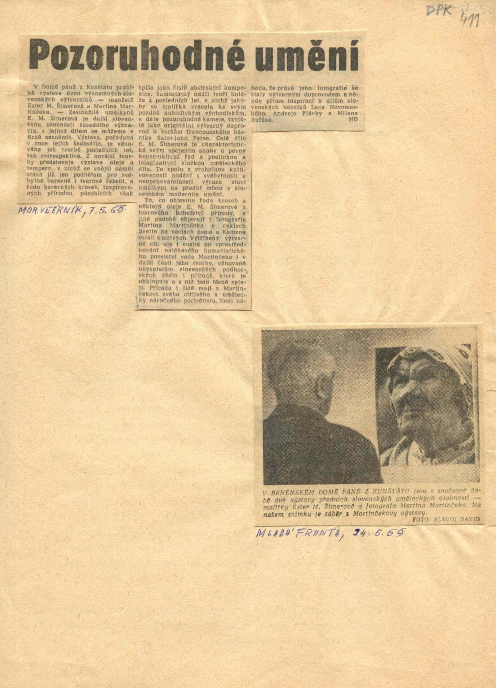 Viz složka DPK 411: společná pozvánka DPK 411–412, katalog, strojopis, seznam fotografií, fotografie M. Martinček, společná korespondence DPK 411–412 (výstava v Praze, příprava spol. výstavy, instalace, příprava katalogu – dopisy Ester Šimerová / Martin Martinček / DU, žádost o výstavu – E. Šimerová, dopis M. Martinček)