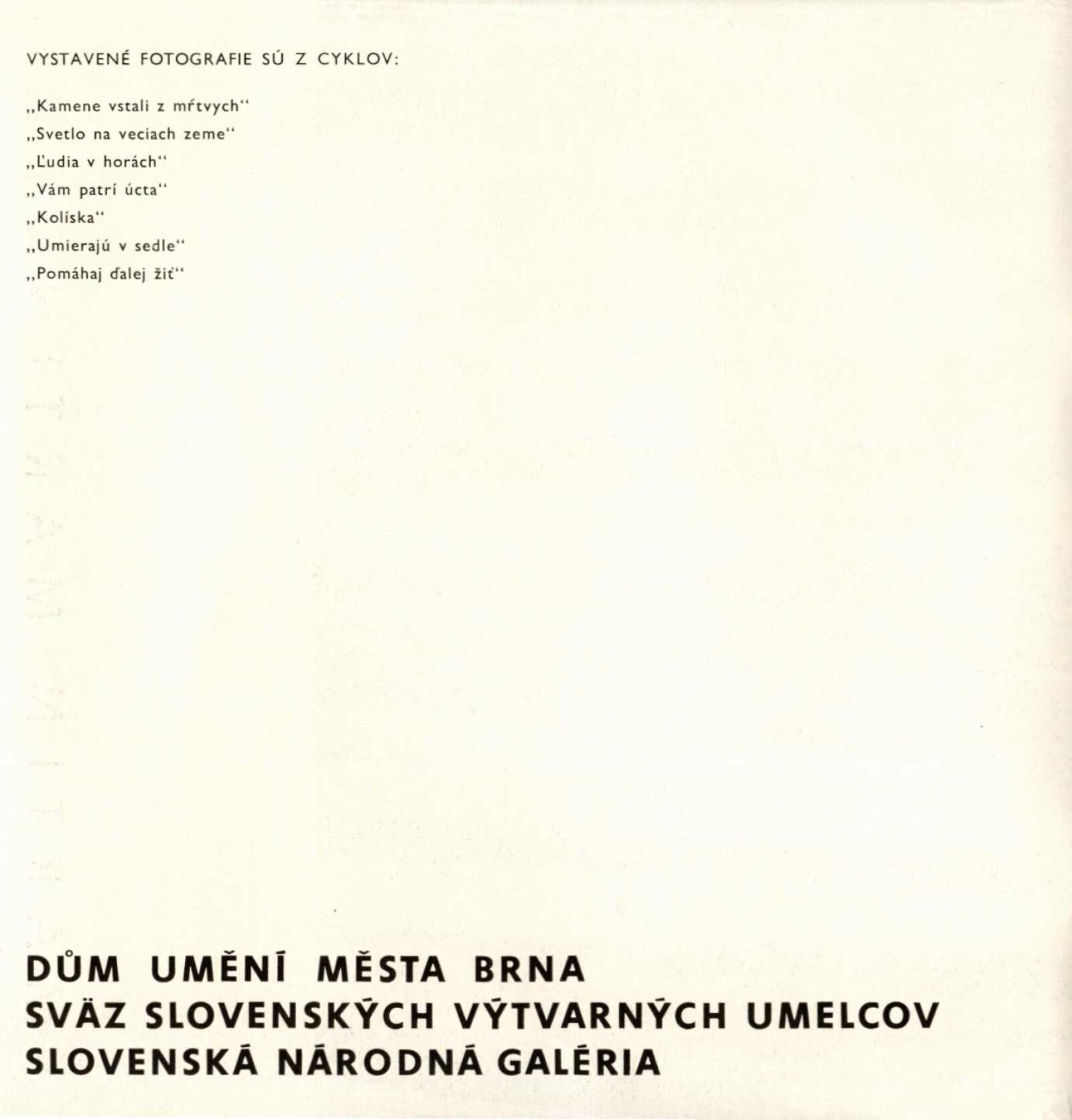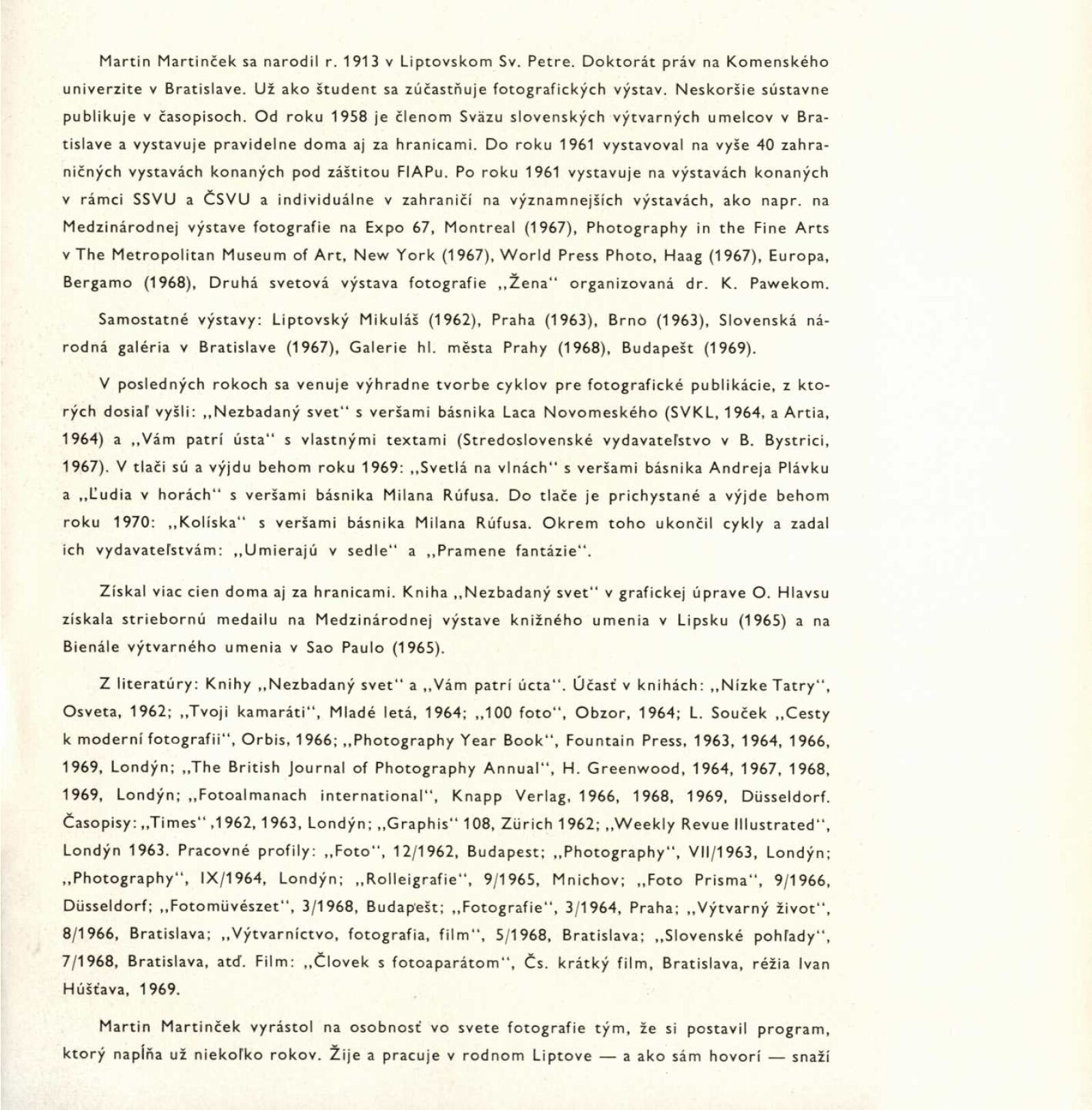 Martin Martinček. Fotografie: Dům umění města Brna / Dům pánů z Kunštátu, 20. 4. – 25. 5. 1969 / Text: Ľudmila Peterajová. – Brno: DUmB, 1969. – 8 s., obr., DPK 412. – MZK; MG