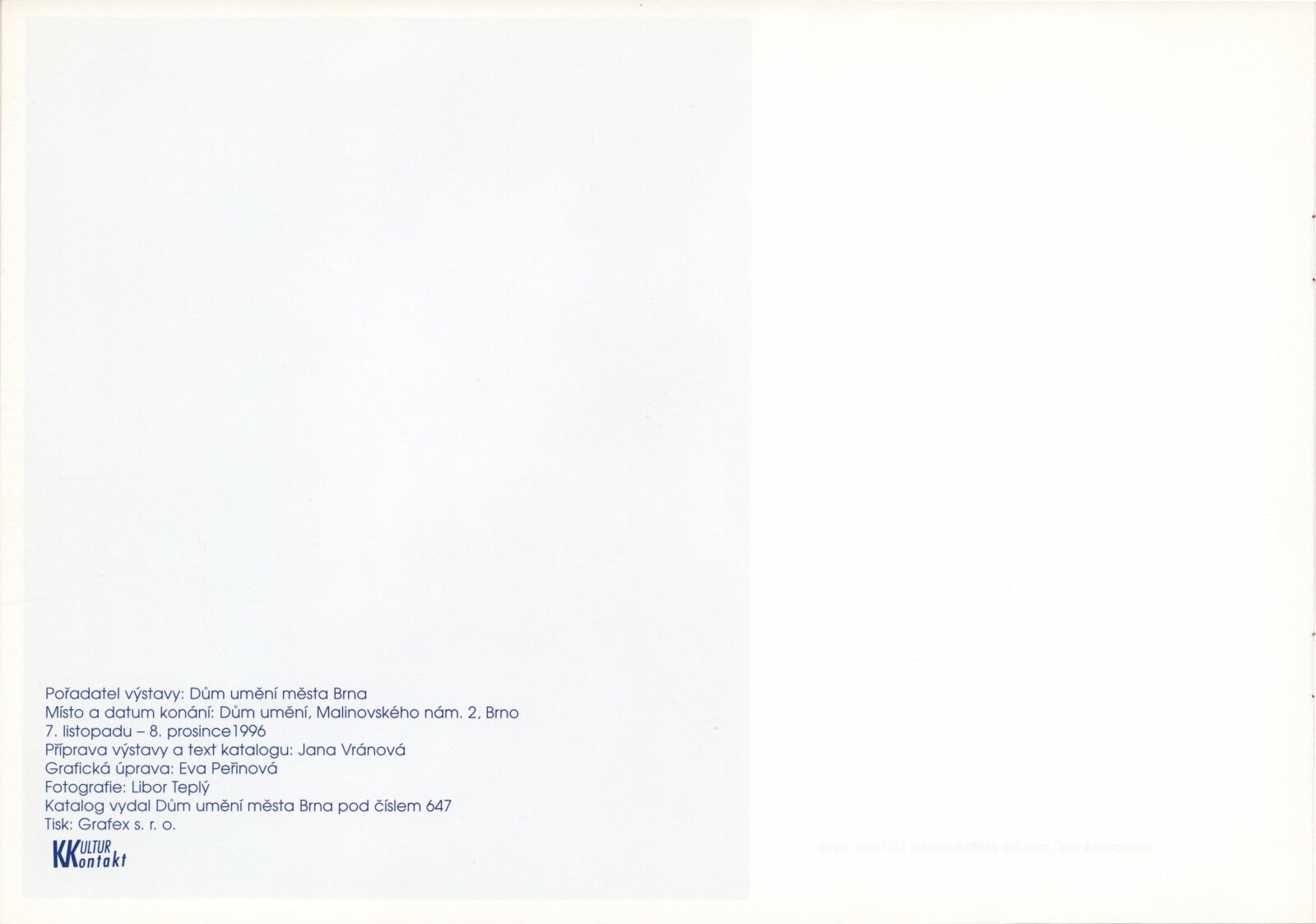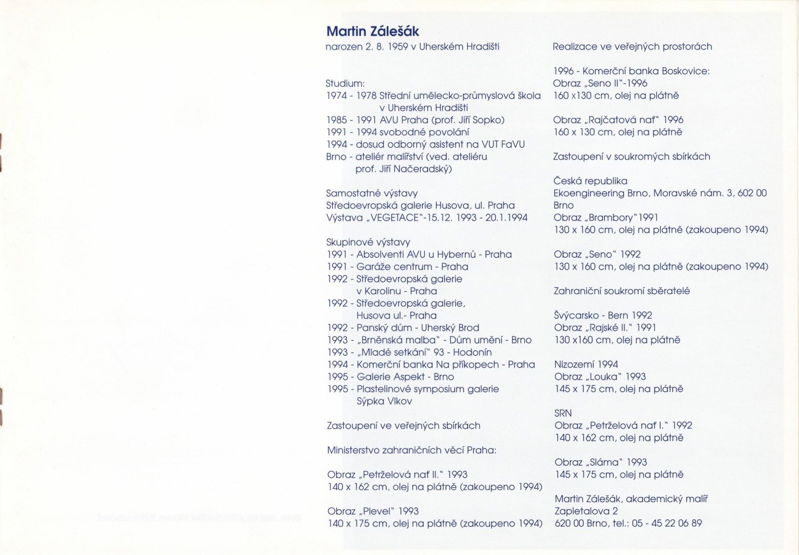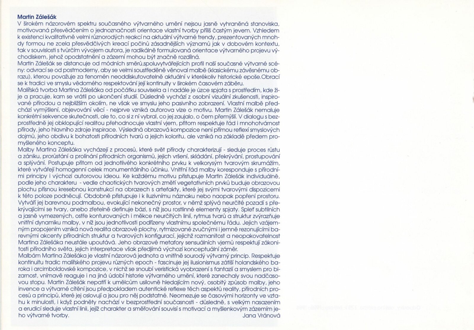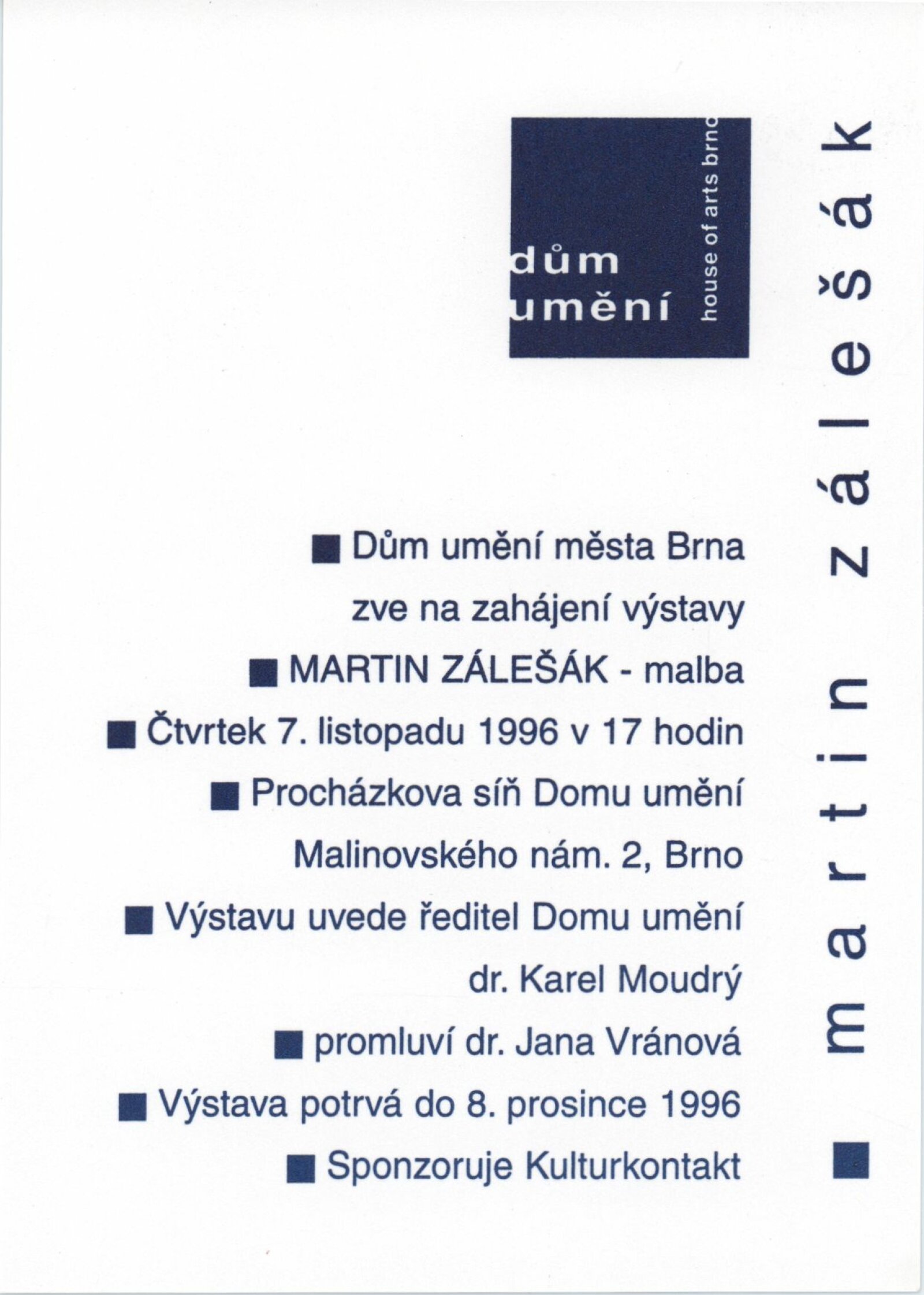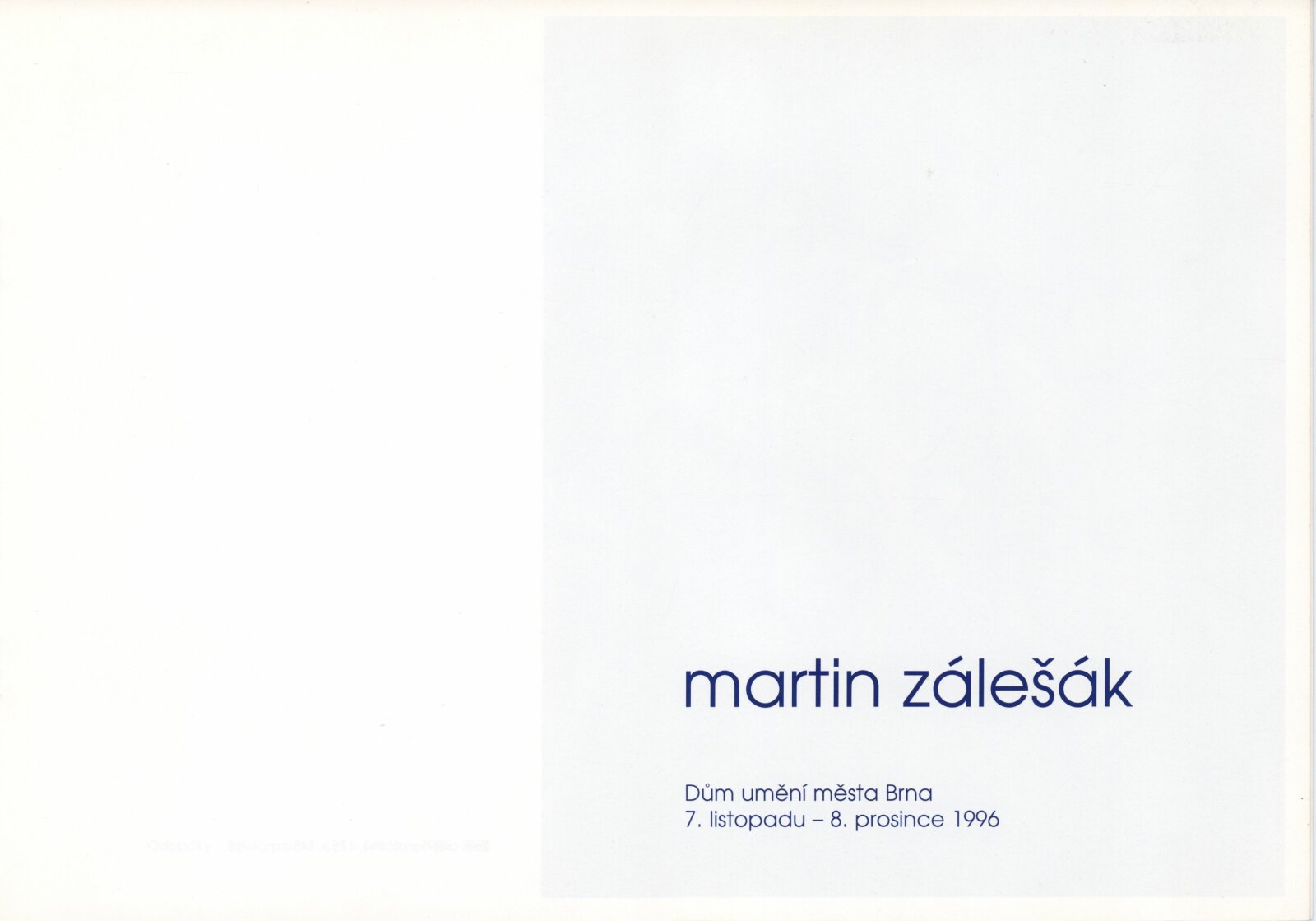 Martin Zálešák. Malba: Dům umění města Brna, Procházkova síň, 7. 11. – 8. 12. 1996 / Text: Jana Vránová. – Brno: DUmB, 1996. – [8] s., obr., DU 1037. – MG