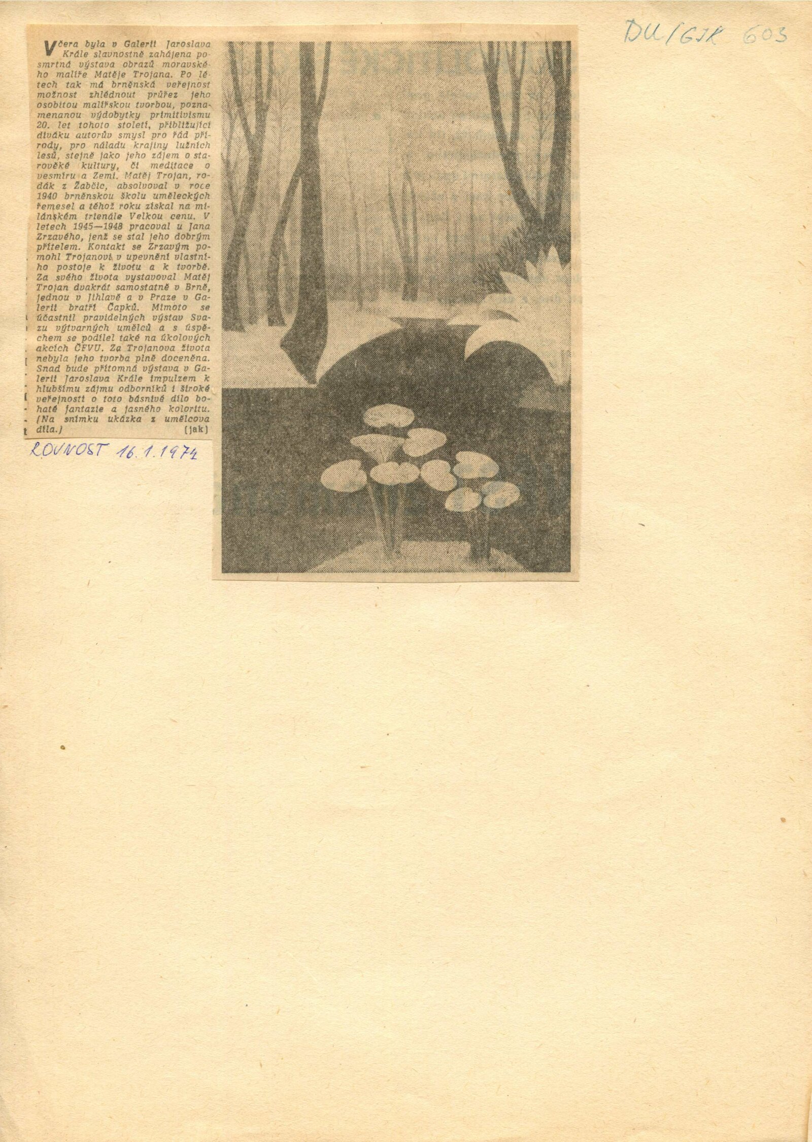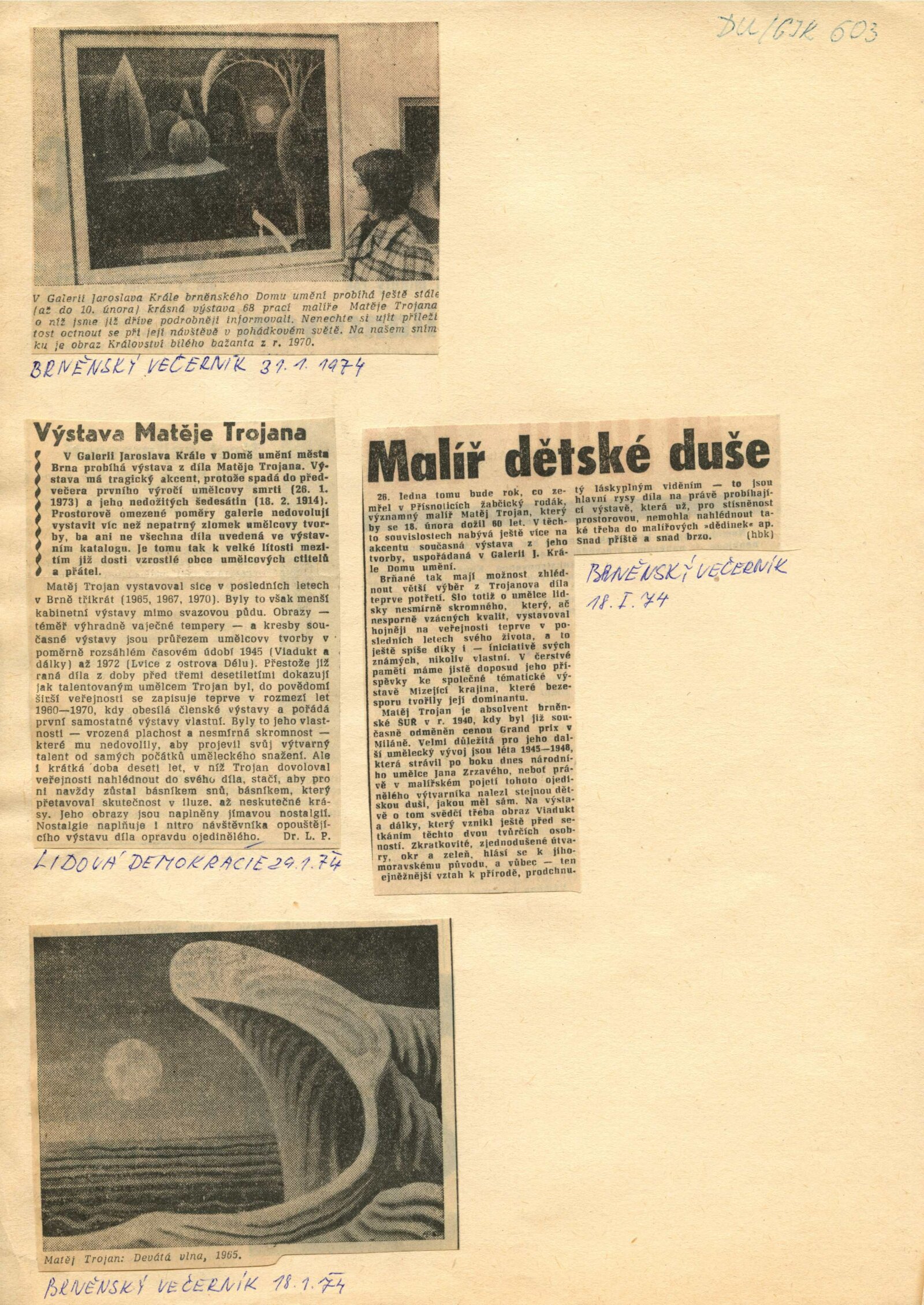 Matěj Trojan. 1944–1972: Dům umění / Dům pánů z Kunštátu, 57. výstava v Galerii Jaroslava Krále, 15. 1. – 10. 2. 1974 / Text: Josefa Sedláčková. – Brno: ČFVU, 1974. – 10 s., obr., seznam vystavených prací 2 s., portrét, životní data, výstavy, vyznamenání, studijní cesty, DU 603. – MZK; MG; MMB