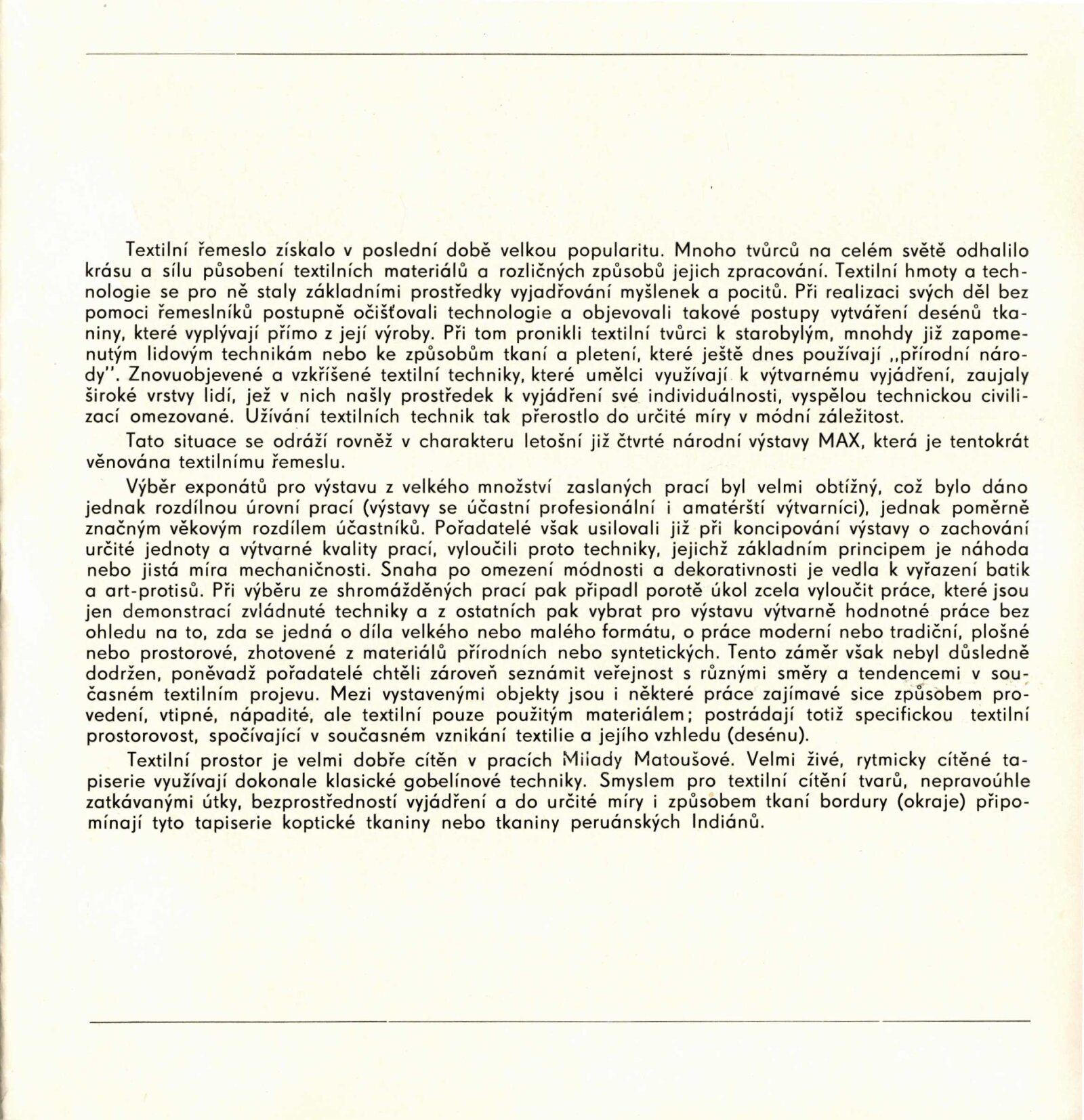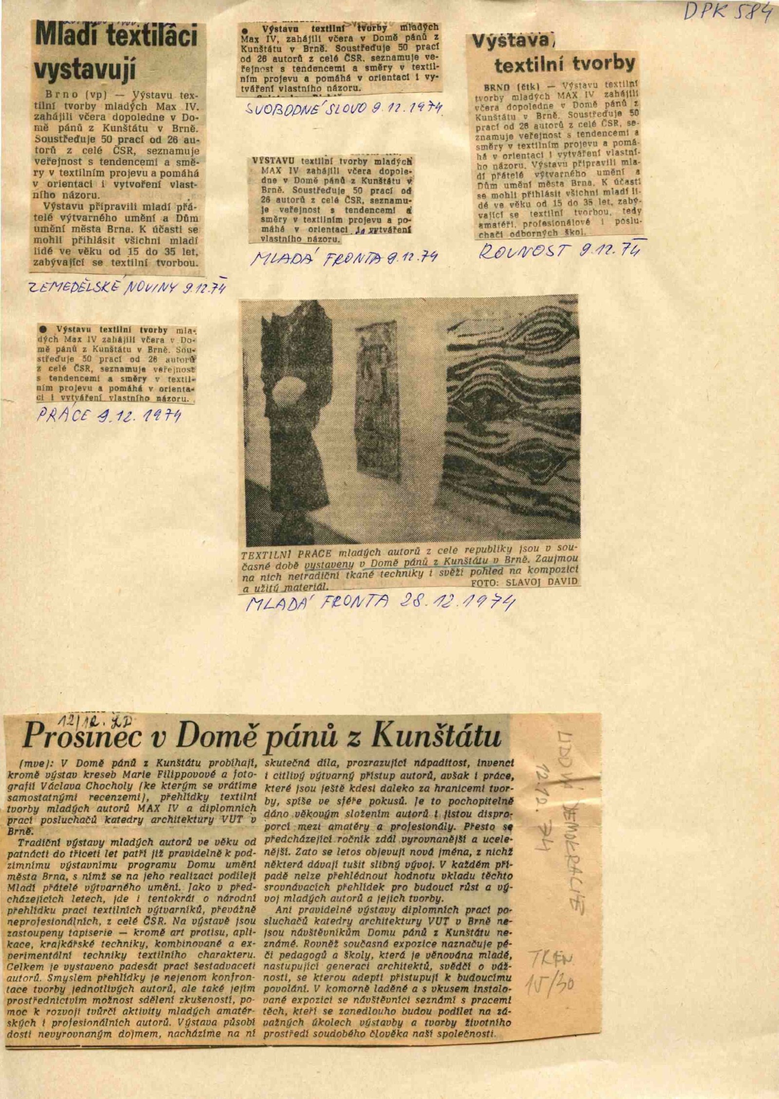 MAX IV. Textilní tvorba mladých autorů: Dům umění / Dům pánů z Kunštátu, 8. 12. 1974 – 5. 1. 1975 / Text: Eliška Lysková. – Brno: DUmB, 1974. – 20 s., obr., DPK 584