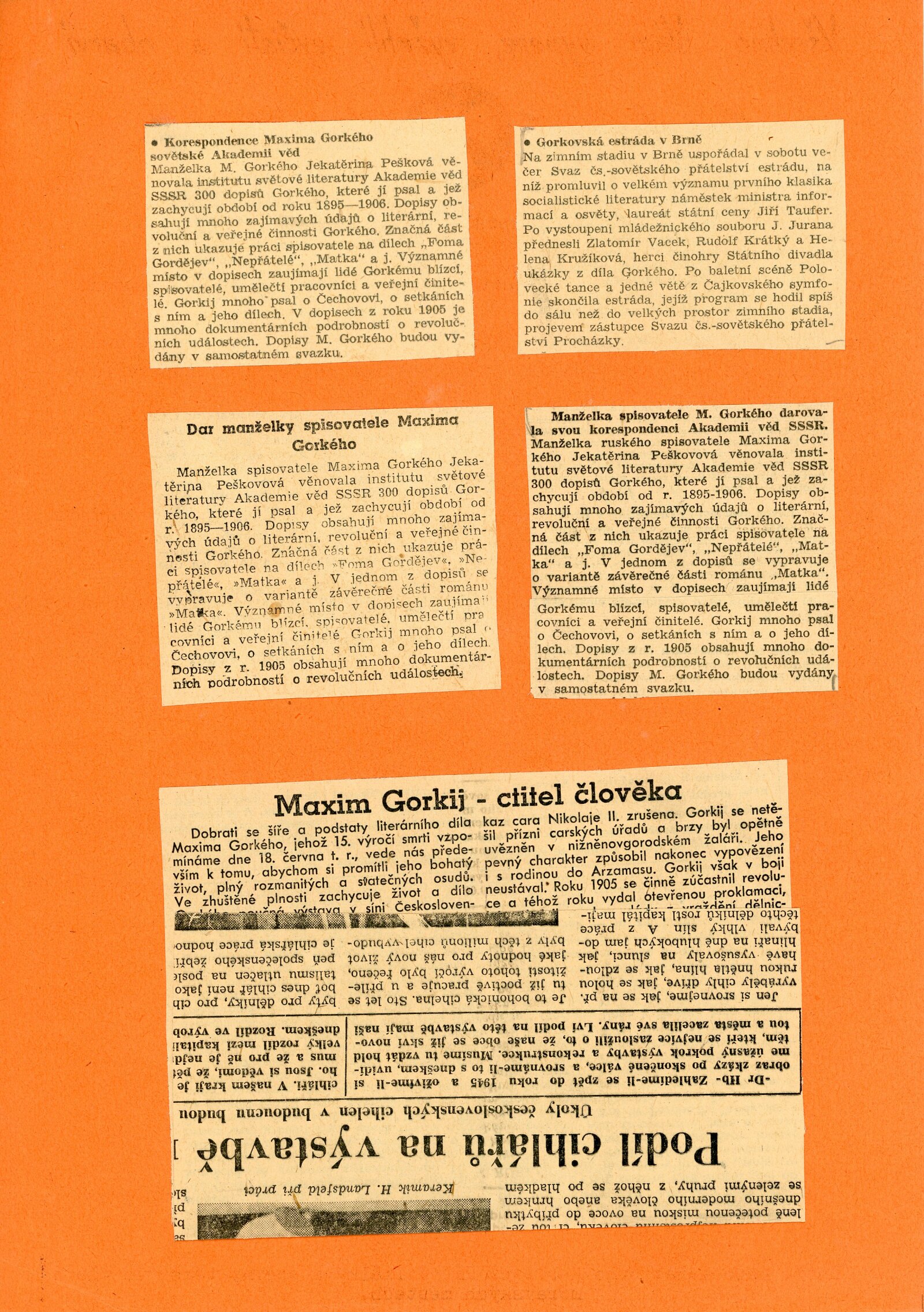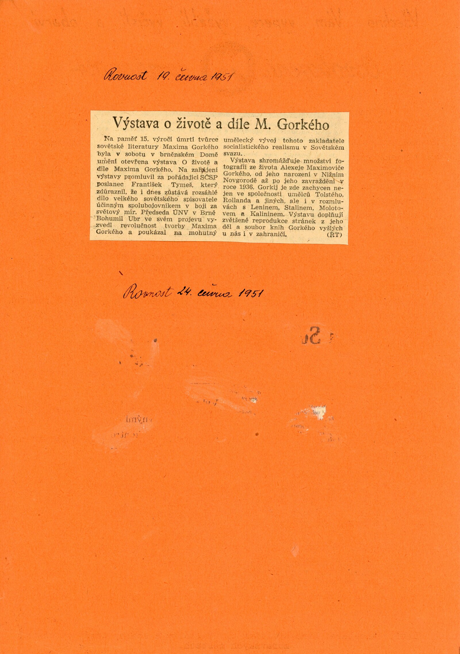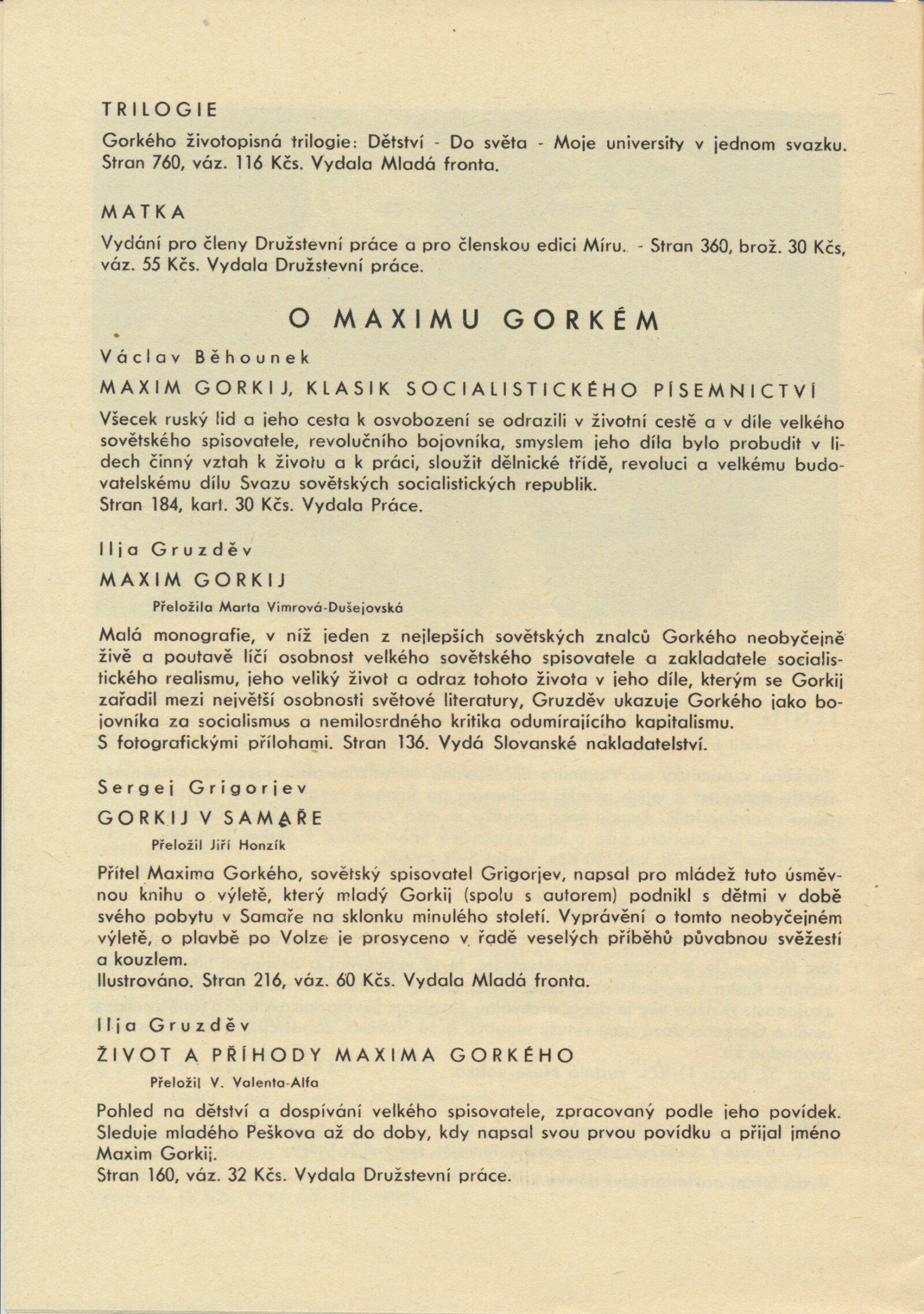 Maxim Gorkij: Dům umění, 16. 6. – 1. 7. 1951 / Převzatý katalog. Maxim Gorkij. Život a dílo: Výstavní síň Československého spisovatele, červen 1951 / Texty: Josef Kadlec, Bohumil Mathesius. – Praha: Svaz československo-sovětského přátelství, 1951. – 16 s., obr., DU 159. – MZK