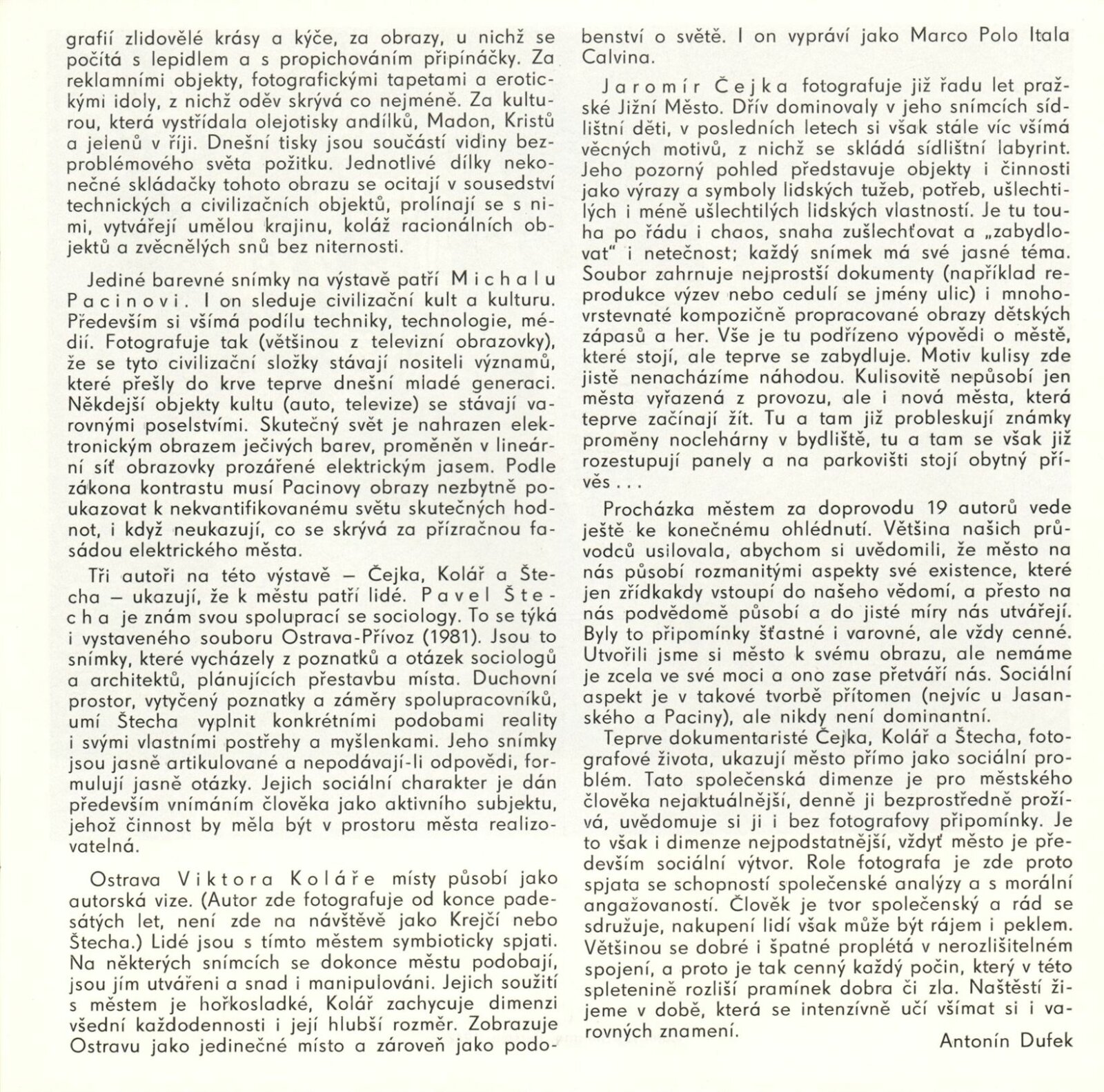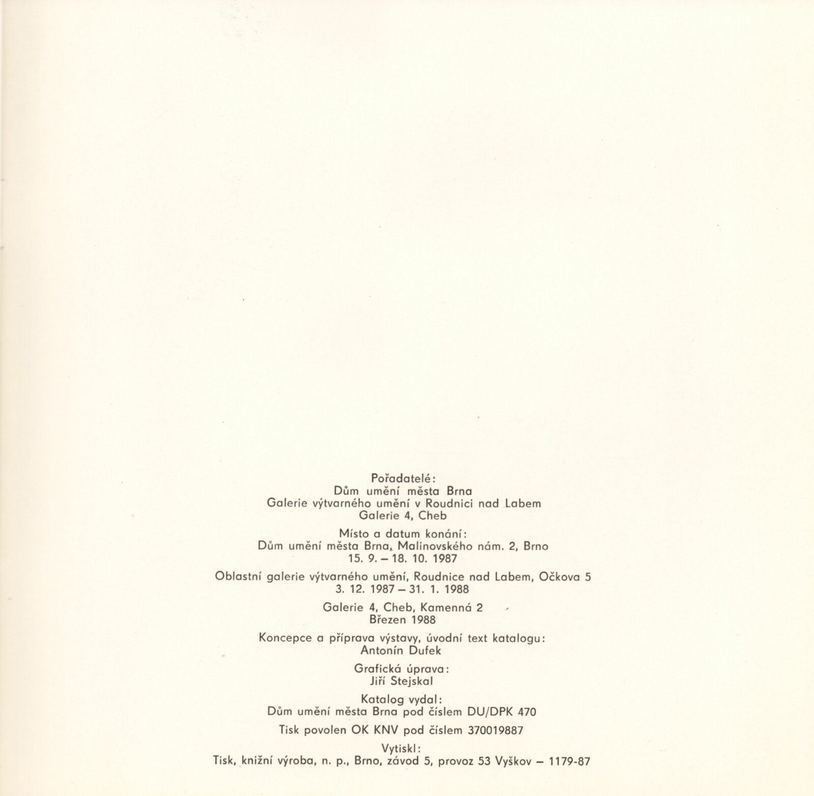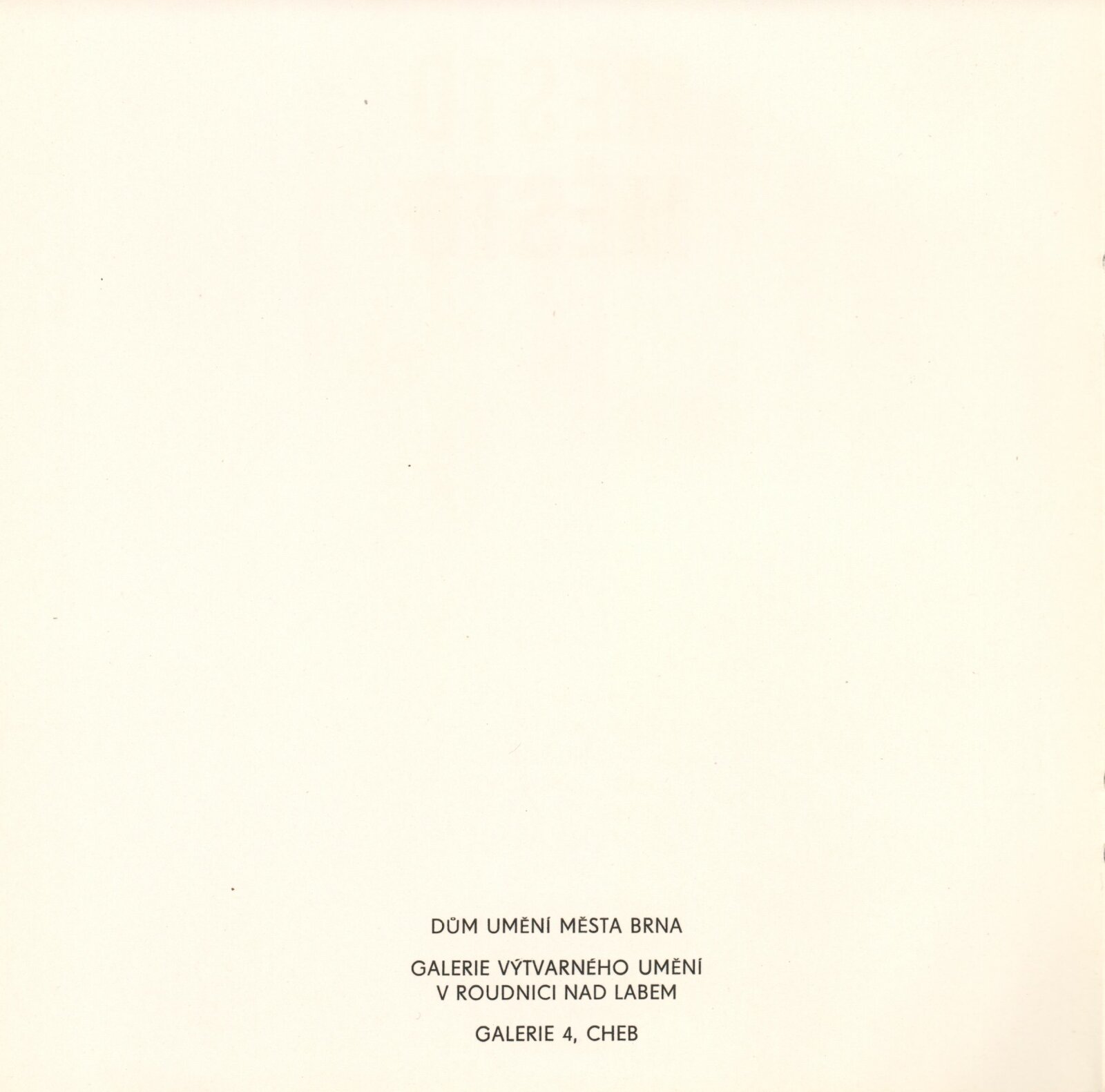 Město. 19 fotografů a jeden námět: Dům umění města Brna, [hala], 15. 9. – 18.10.1987 / Text: Antonín Dufek. – Brno: DUmB, 1987. – [48] s., obr., životní data vystavujících, DU 839. – MZK; MG