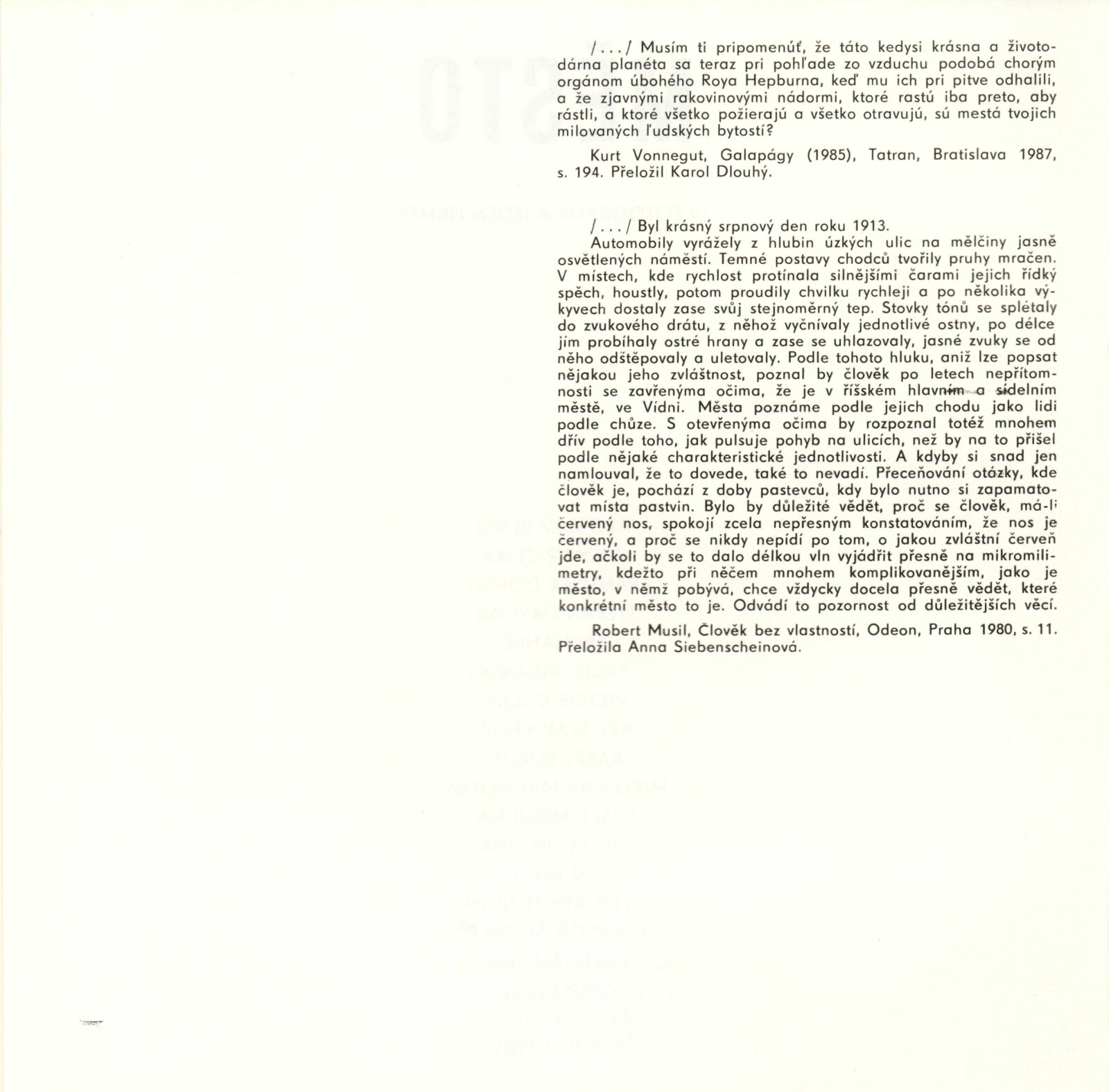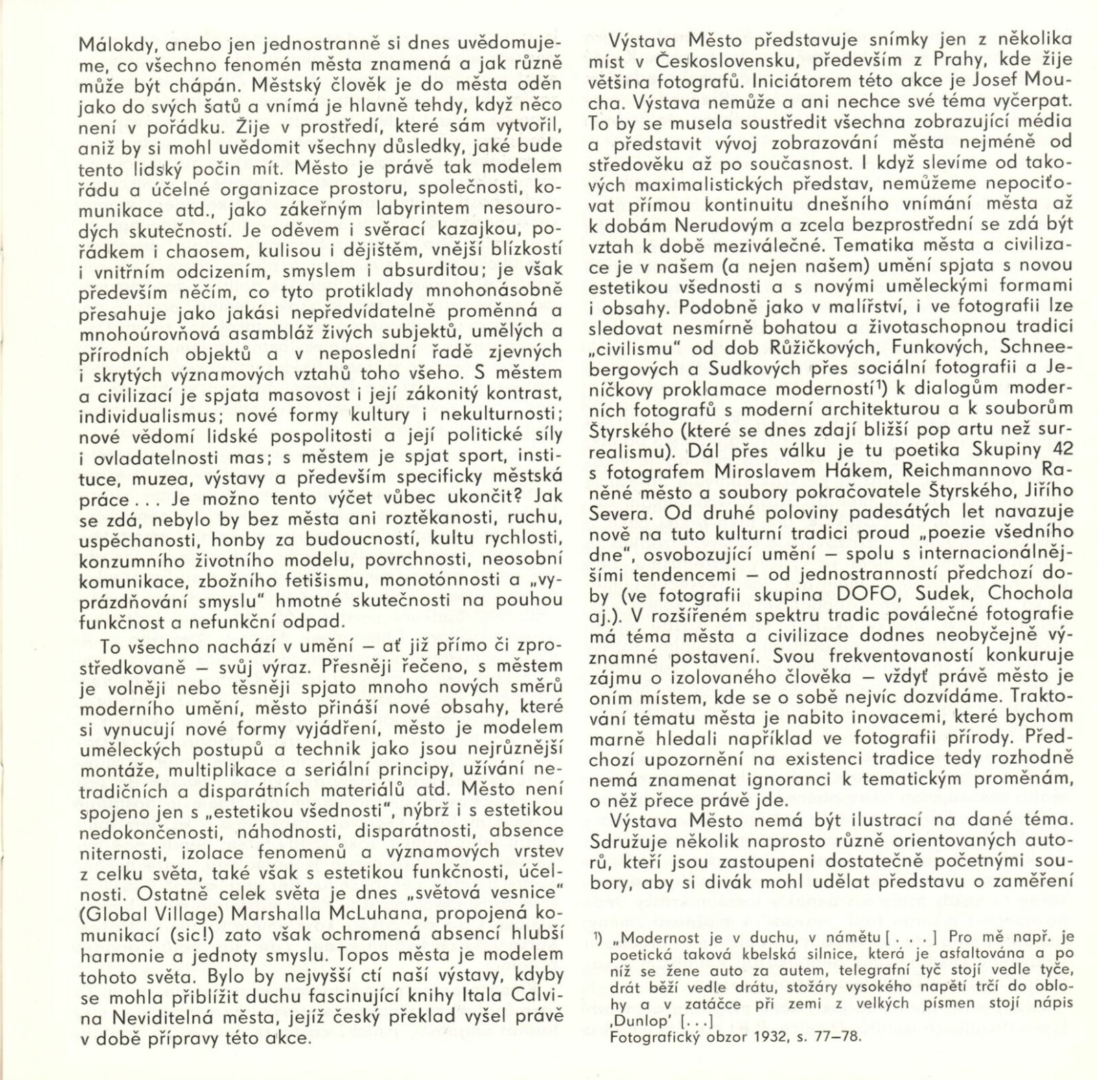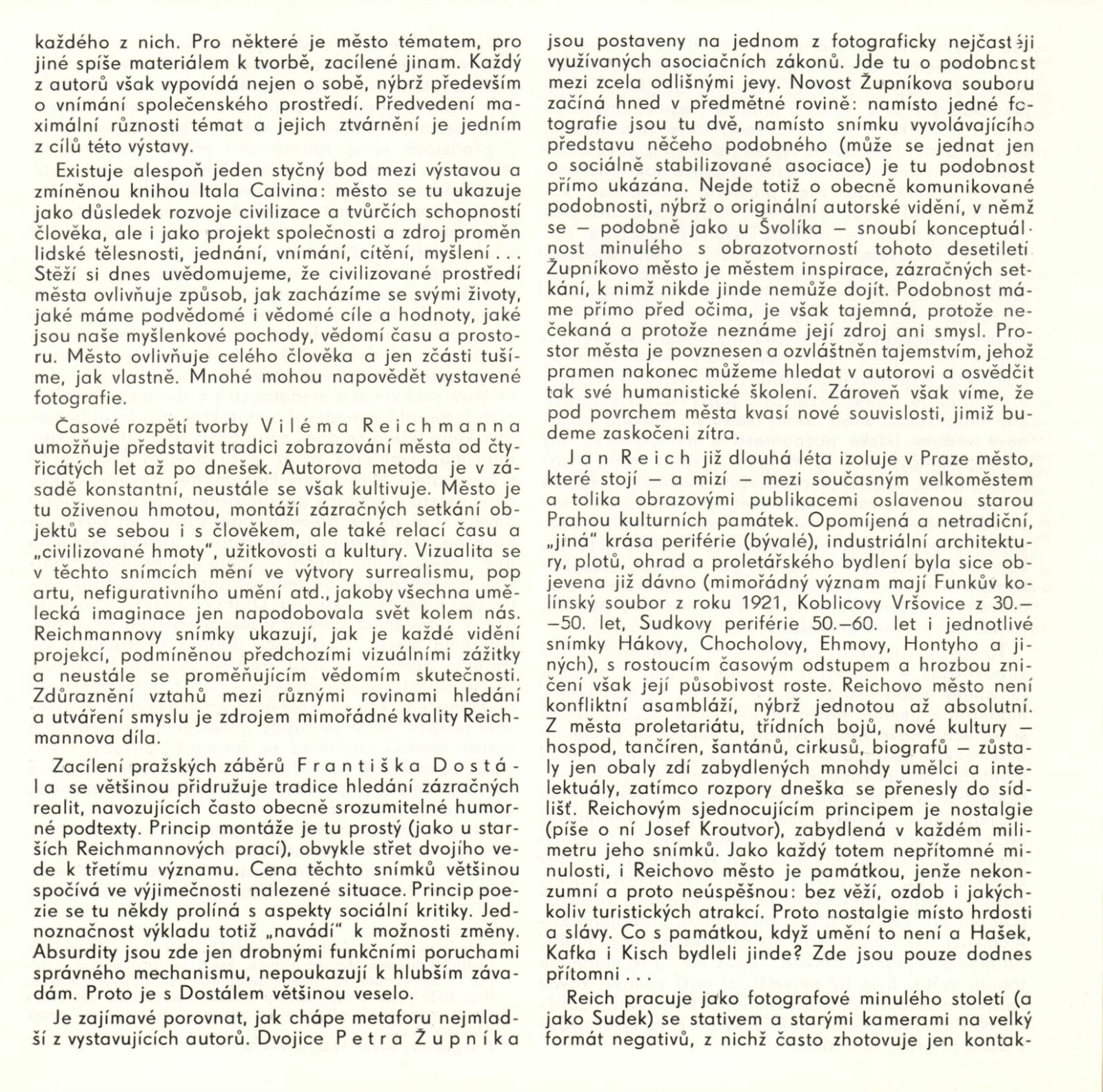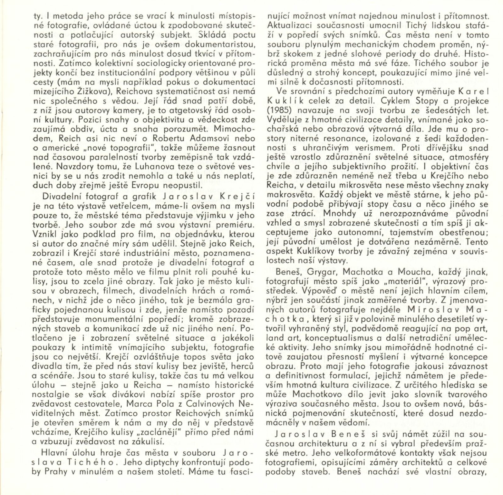 Město. 19 fotografů a jeden námět: Dům umění města Brna, [hala], 15. 9. – 18.10.1987 / Text: Antonín Dufek. – Brno: DUmB, 1987. – [48] s., obr., životní data vystavujících, DU 839. – MZK; MG