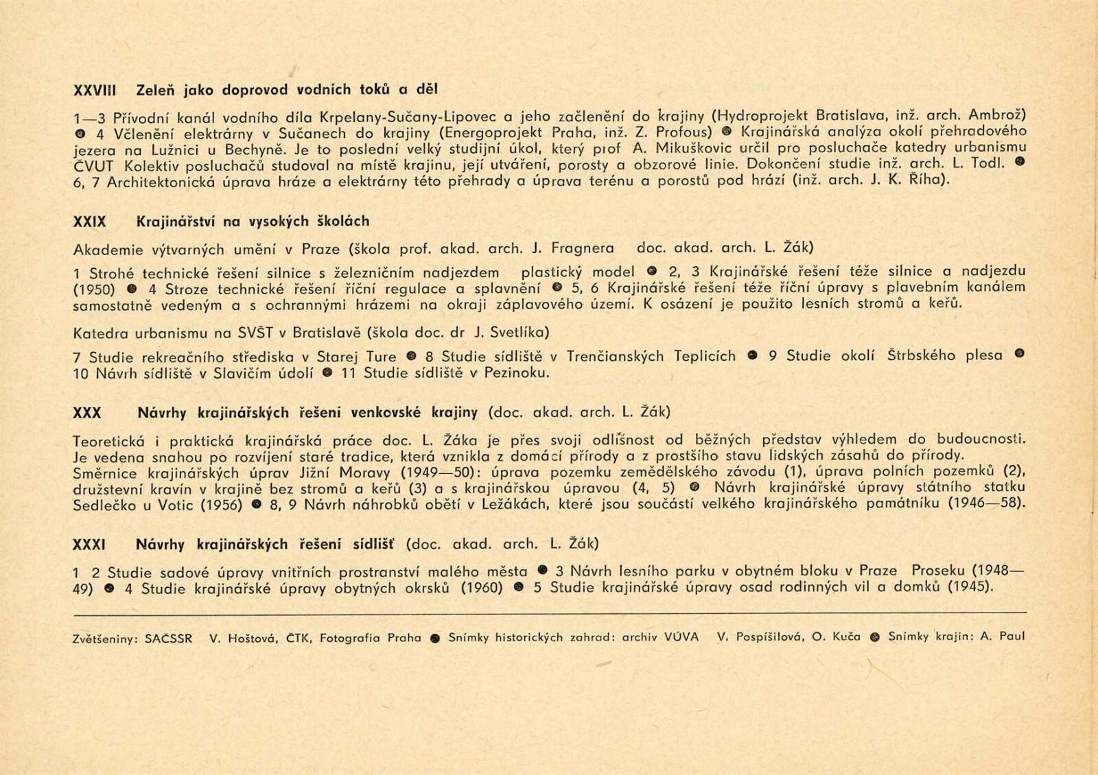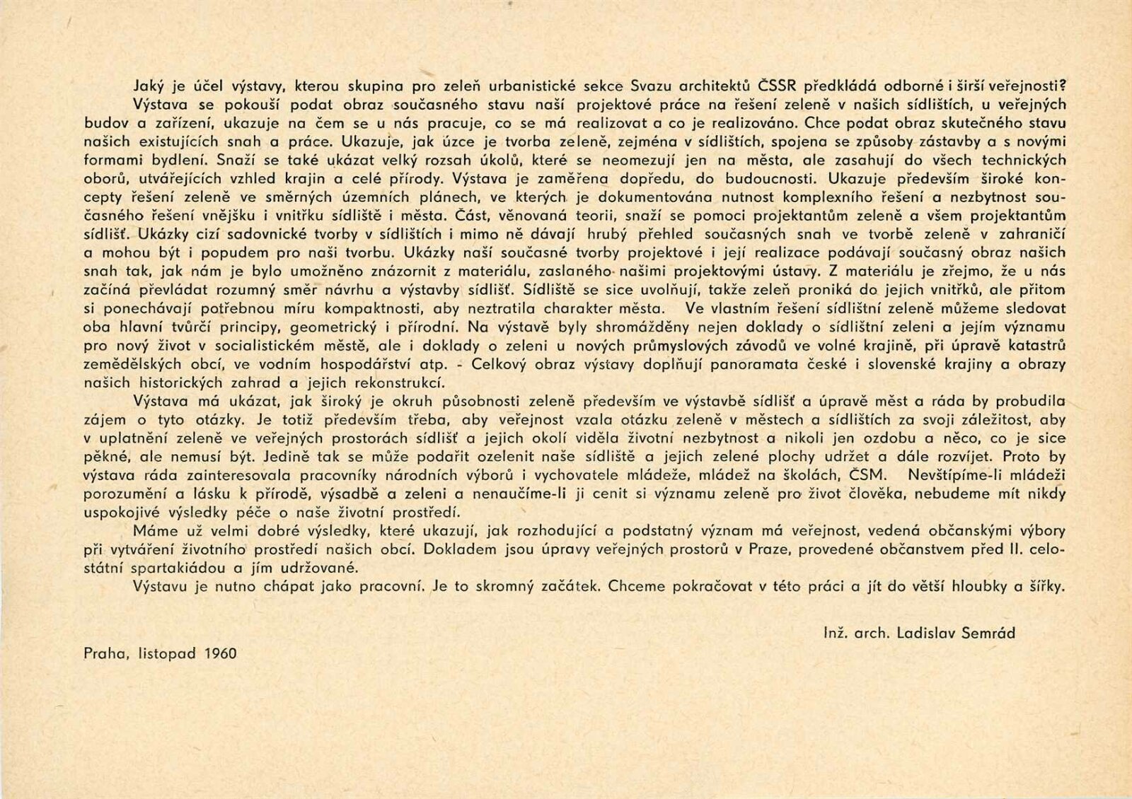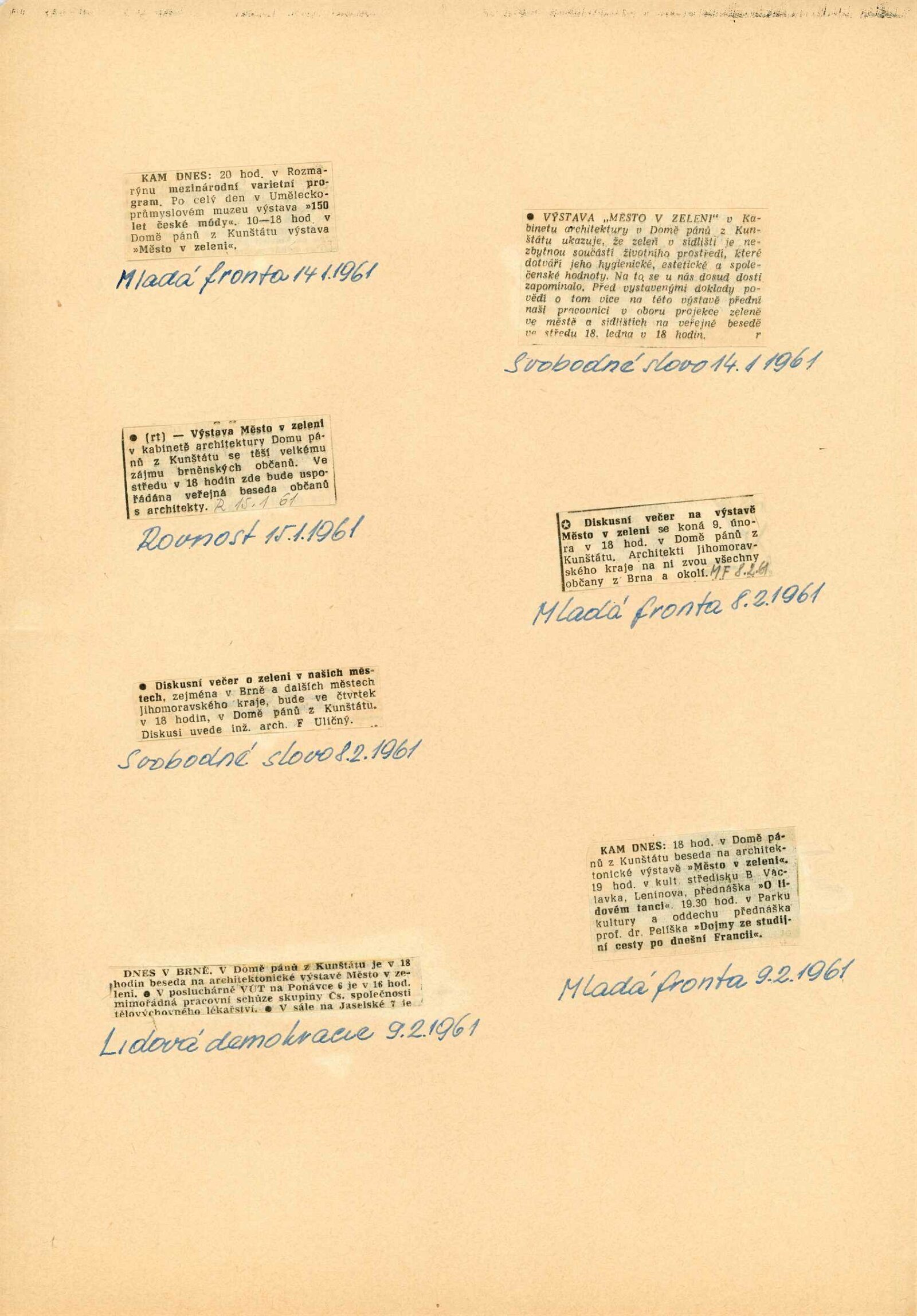 Město v zeleni: Dům umění města Brna / Dům pánů z Kunštátu, 12. výstava Kabinetu architektury Svazu architektů ČSSR, 5. 1. – 26. 2. 1961 / Brno: Svaz architektů ČSSR, 1961. – 4 s., obr. Město v zeleni / Katalog putovní výstavy. Text: Ladislav Semrád. – Praha: Svaz architektů ČSSR, 1961. – 16 s., obr., DPK 96. – MG