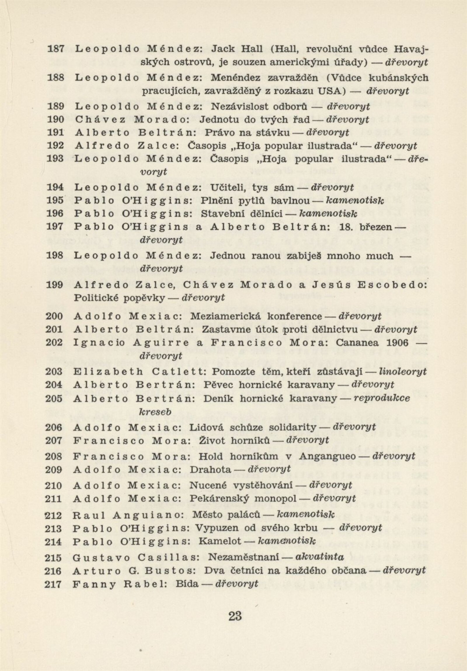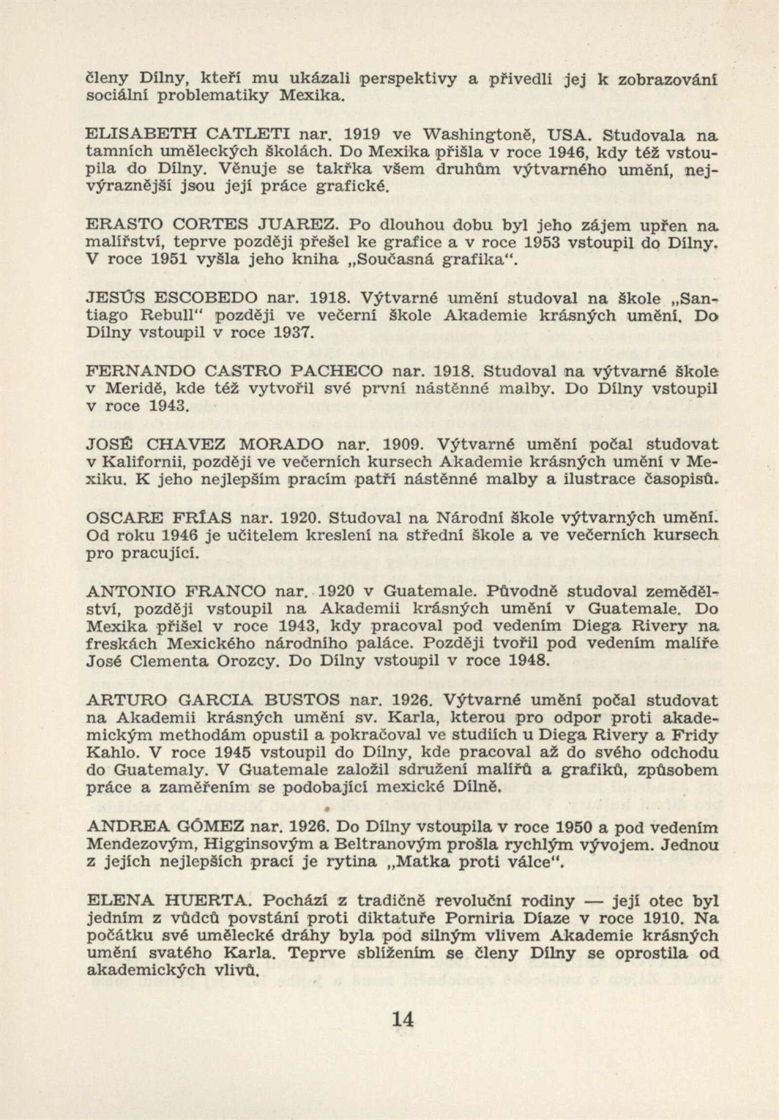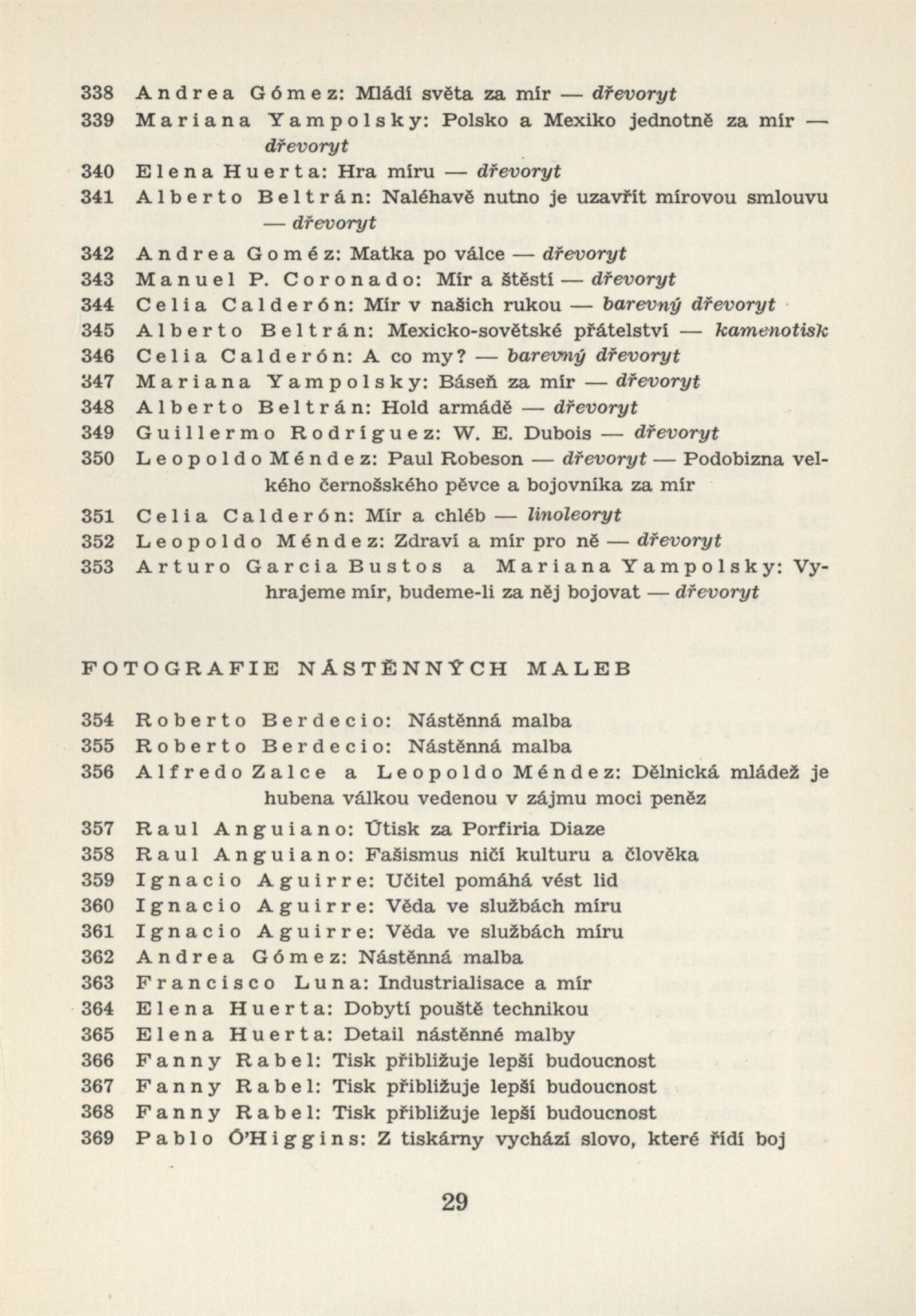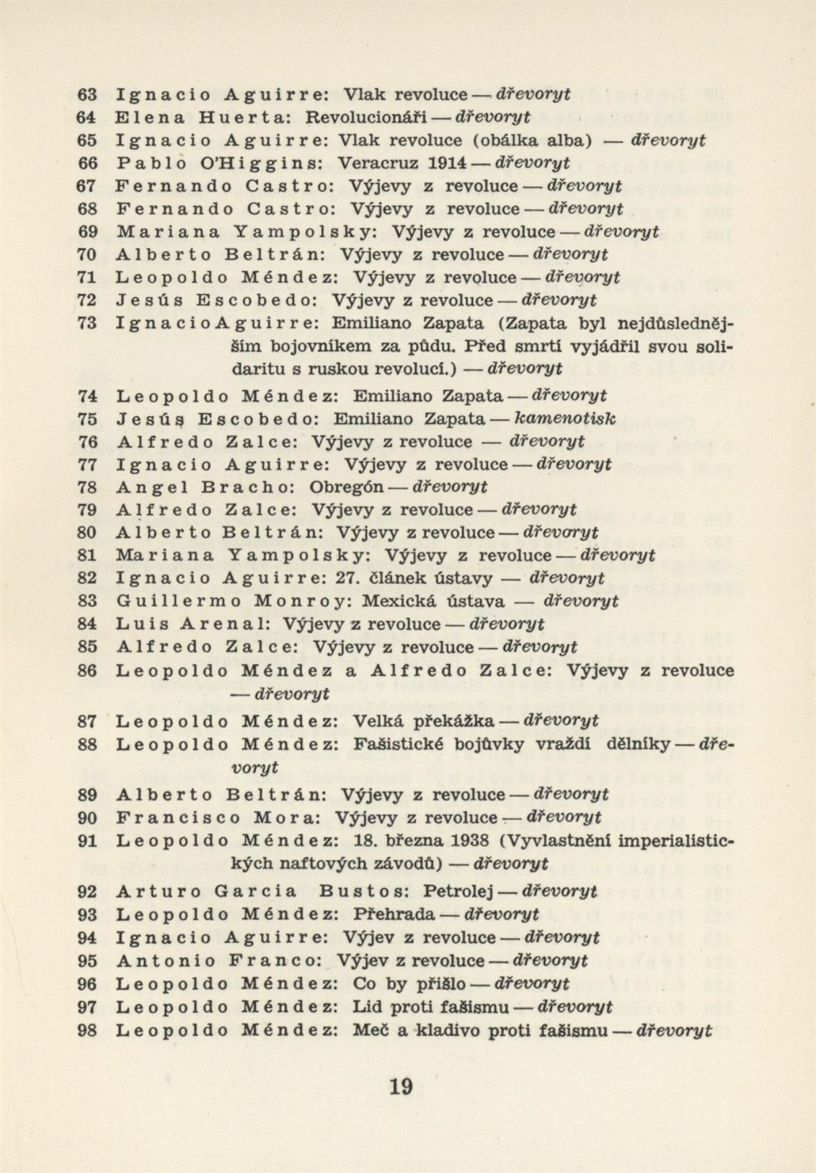 Mexická grafika. Taller de grafica popular: Dům umění, 5. 9. – 3. 10. 1954 / Převzatý katalog. Mexická grafika. Taller de grafica popular: Praha, červen–červenec 1954 / Text: anonymní. – Praha: ÚSČSVU, 1954. – 31 s., 8 s. obr. přil., báseň Pablo Nerudy přebásněná Ivo Fleischmannem, životopisy, DU 201. – MZK; MG