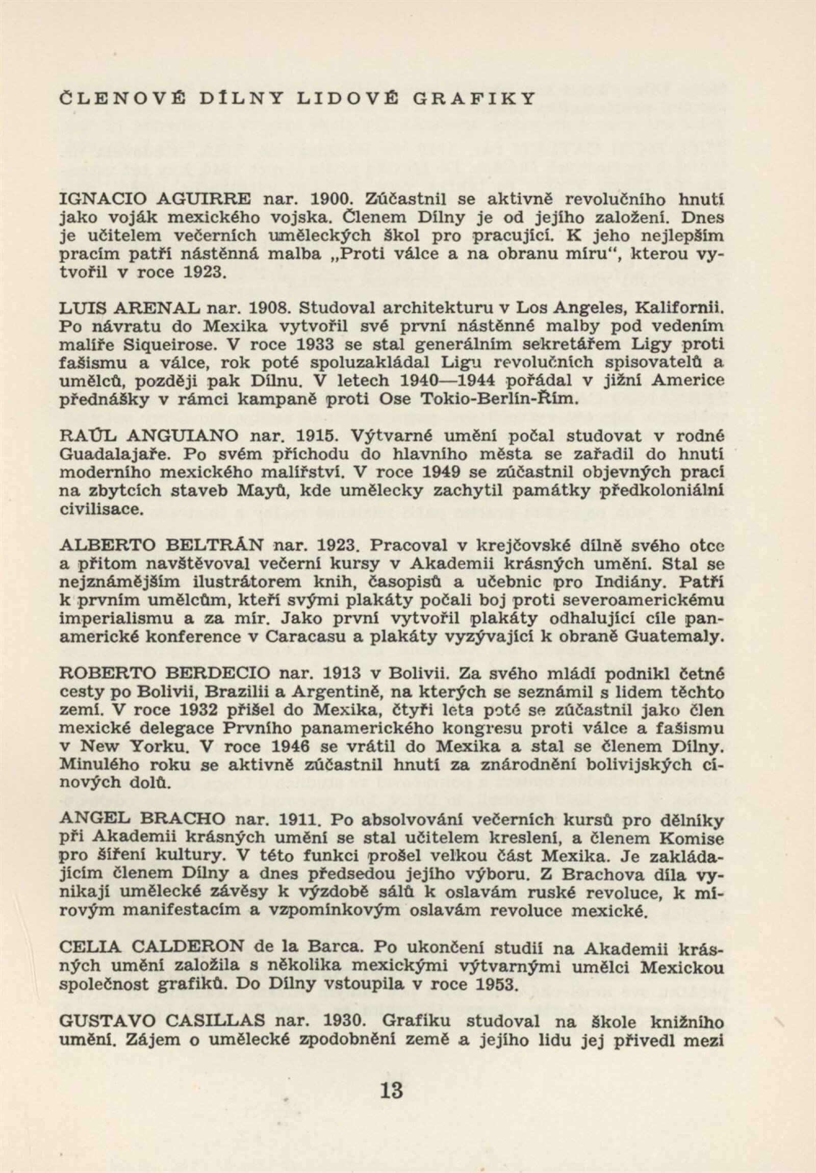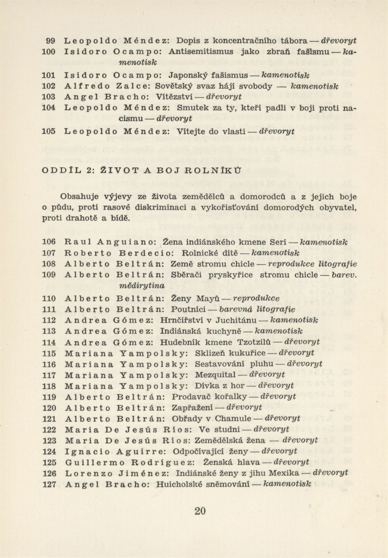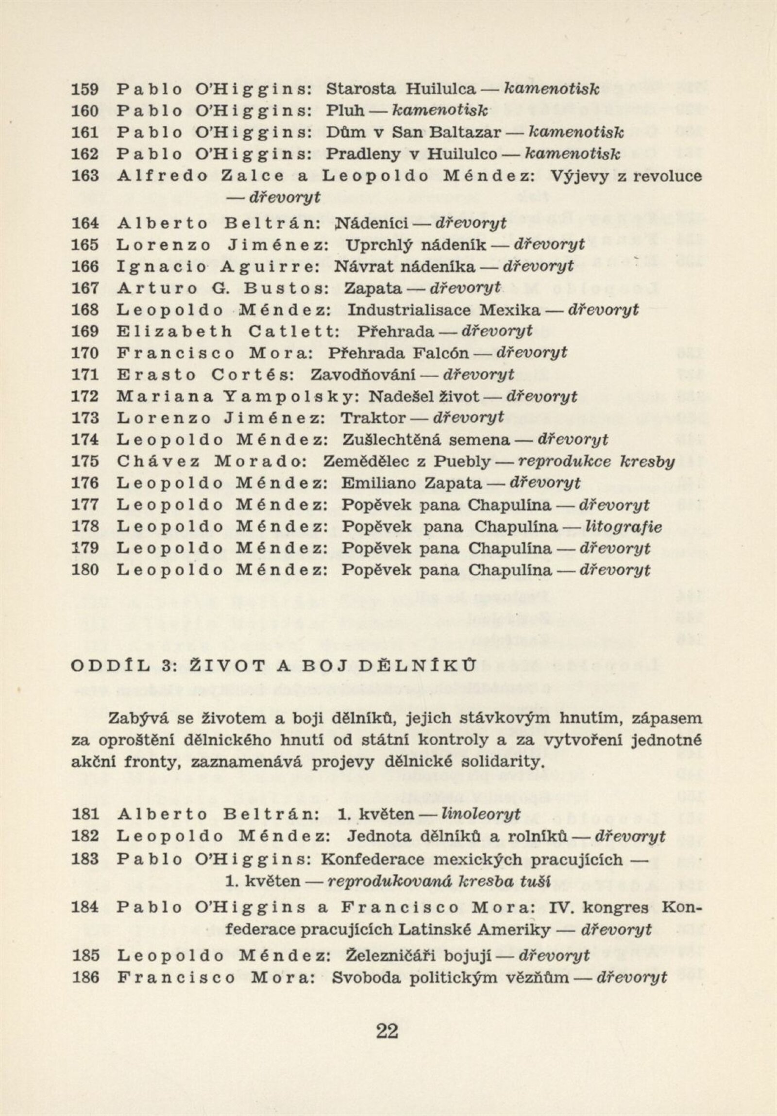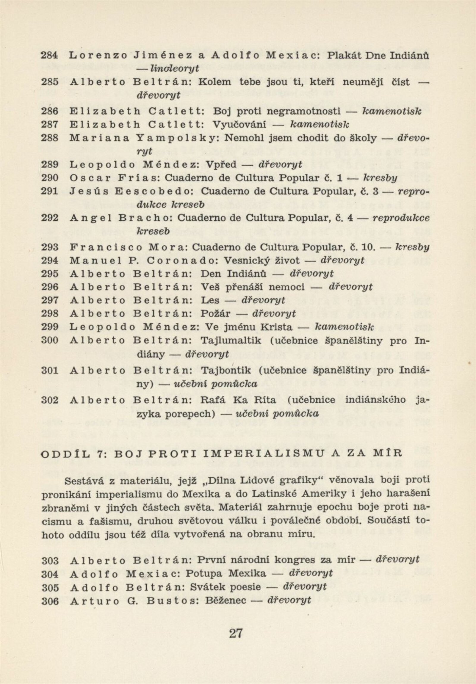Mexická grafika. Taller de grafica popular: Dům umění, 5. 9. – 3. 10. 1954 / Převzatý katalog. Mexická grafika. Taller de grafica popular: Praha, červen–červenec 1954 / Text: anonymní. – Praha: ÚSČSVU, 1954. – 31 s., 8 s. obr. přil., báseň Pablo Nerudy přebásněná Ivo Fleischmannem, životopisy, DU 201. – MZK; MG
