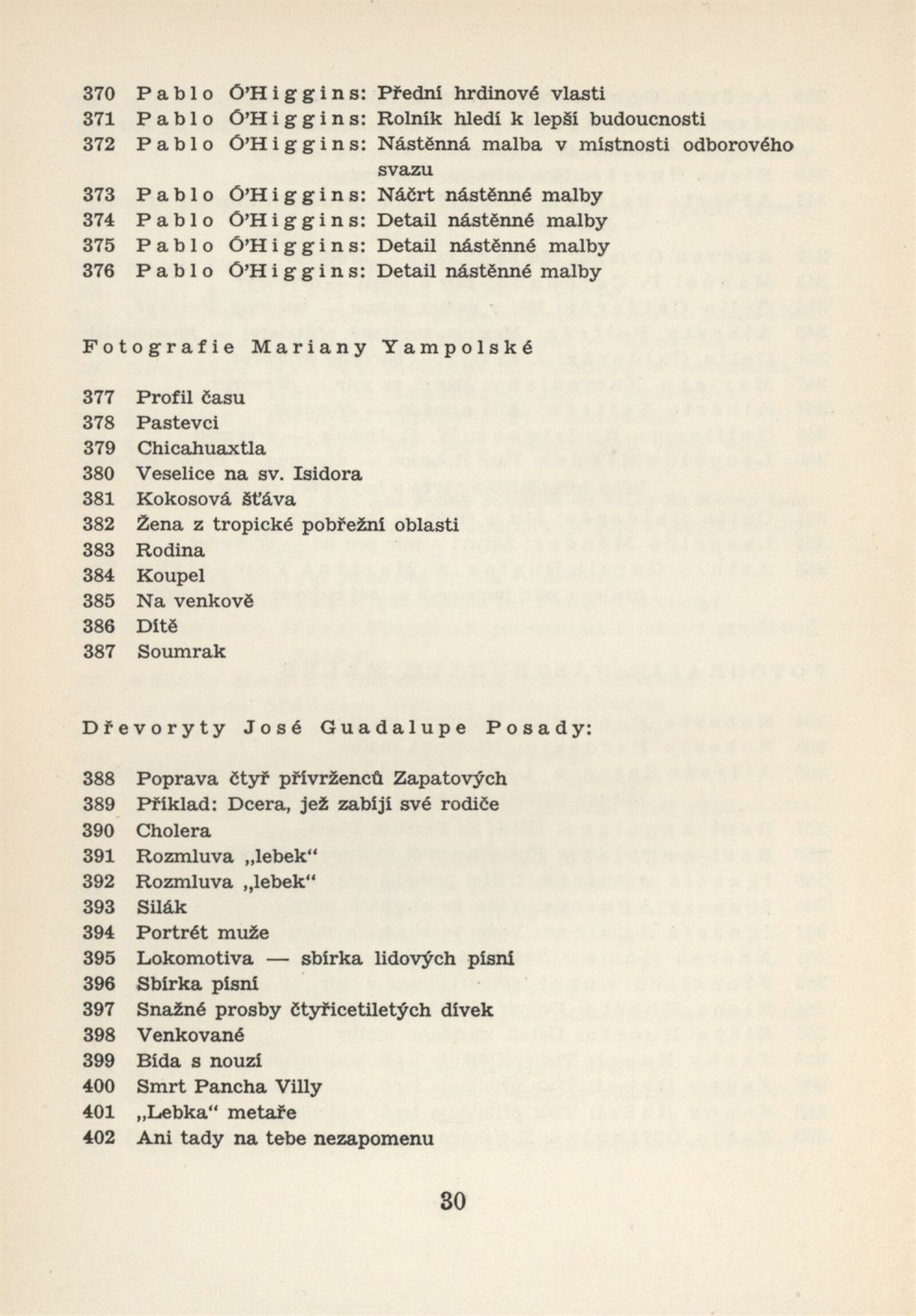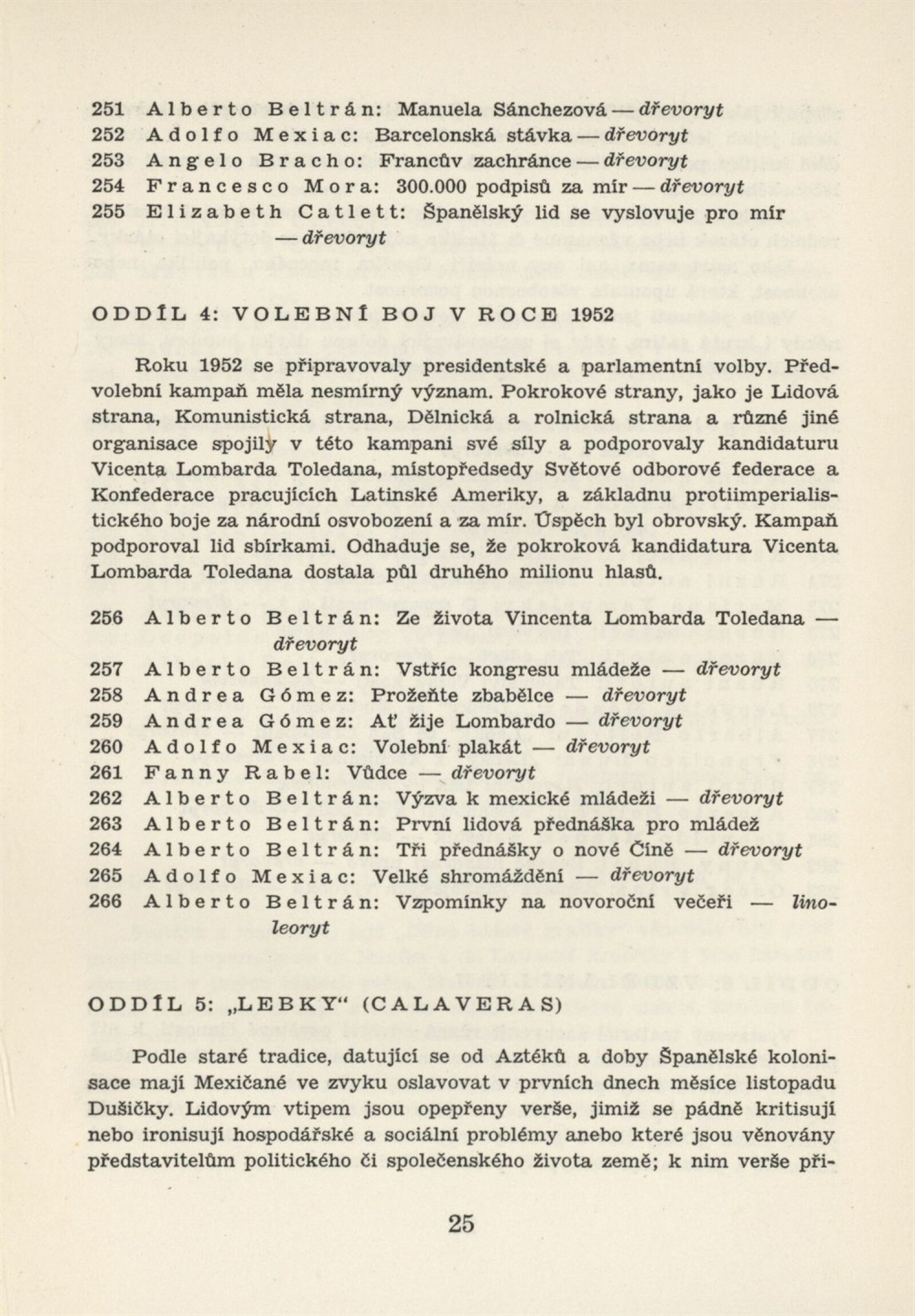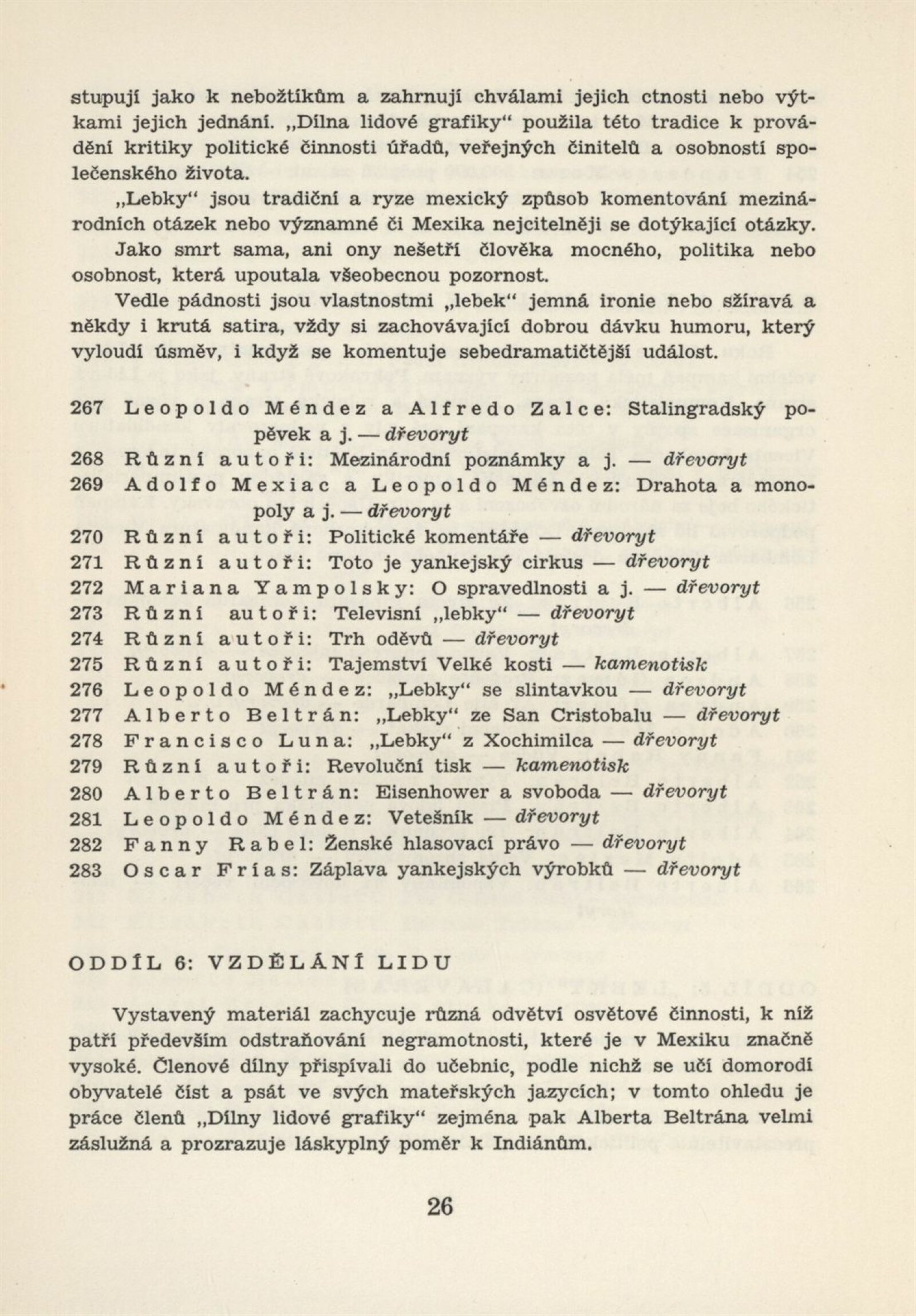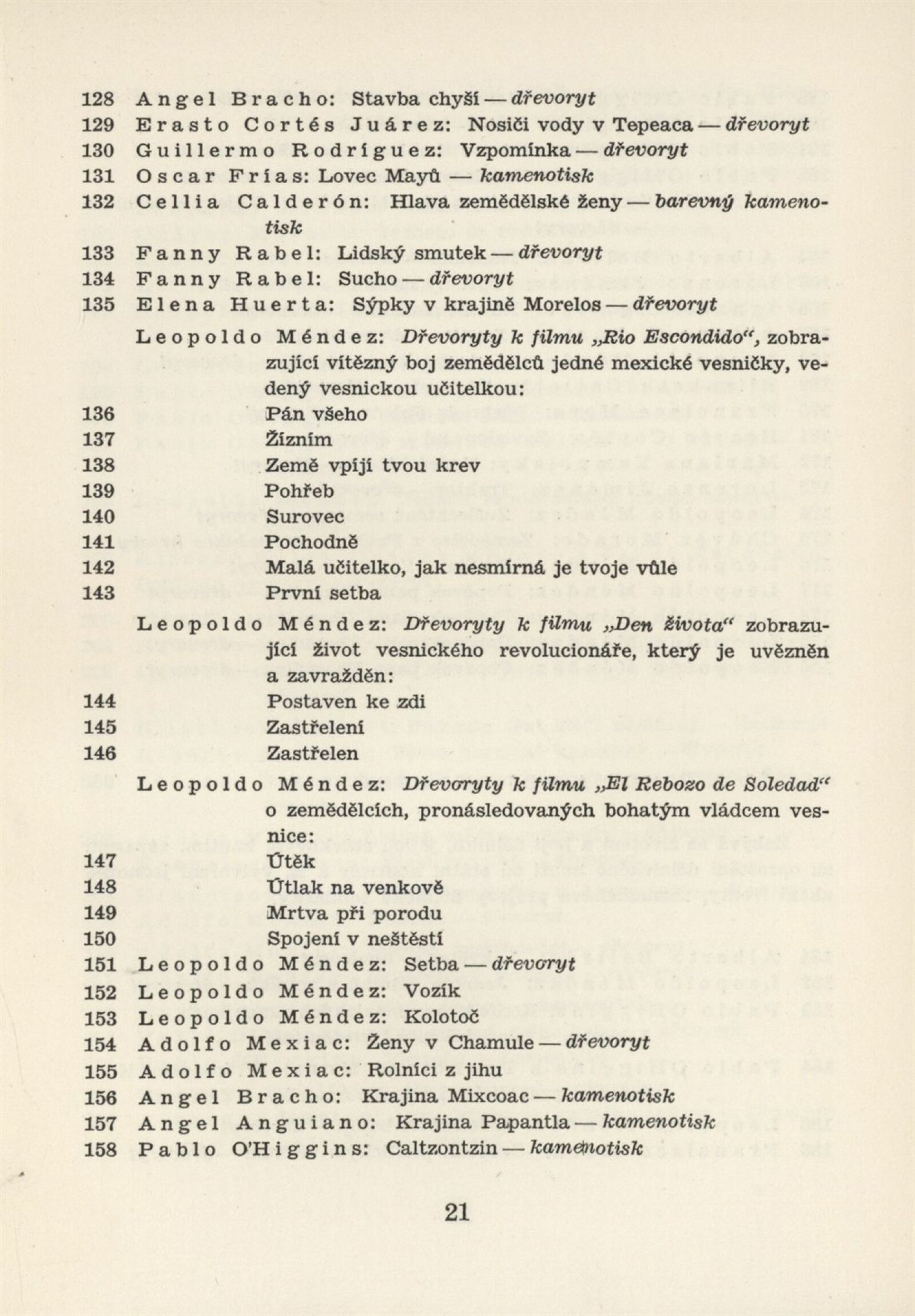 Mexická grafika. Taller de grafica popular: Dům umění, 5. 9. – 3. 10. 1954 / Převzatý katalog. Mexická grafika. Taller de grafica popular: Praha, červen–červenec 1954 / Text: anonymní. – Praha: ÚSČSVU, 1954. – 31 s., 8 s. obr. přil., báseň Pablo Nerudy přebásněná Ivo Fleischmannem, životopisy, DU 201. – MZK; MG