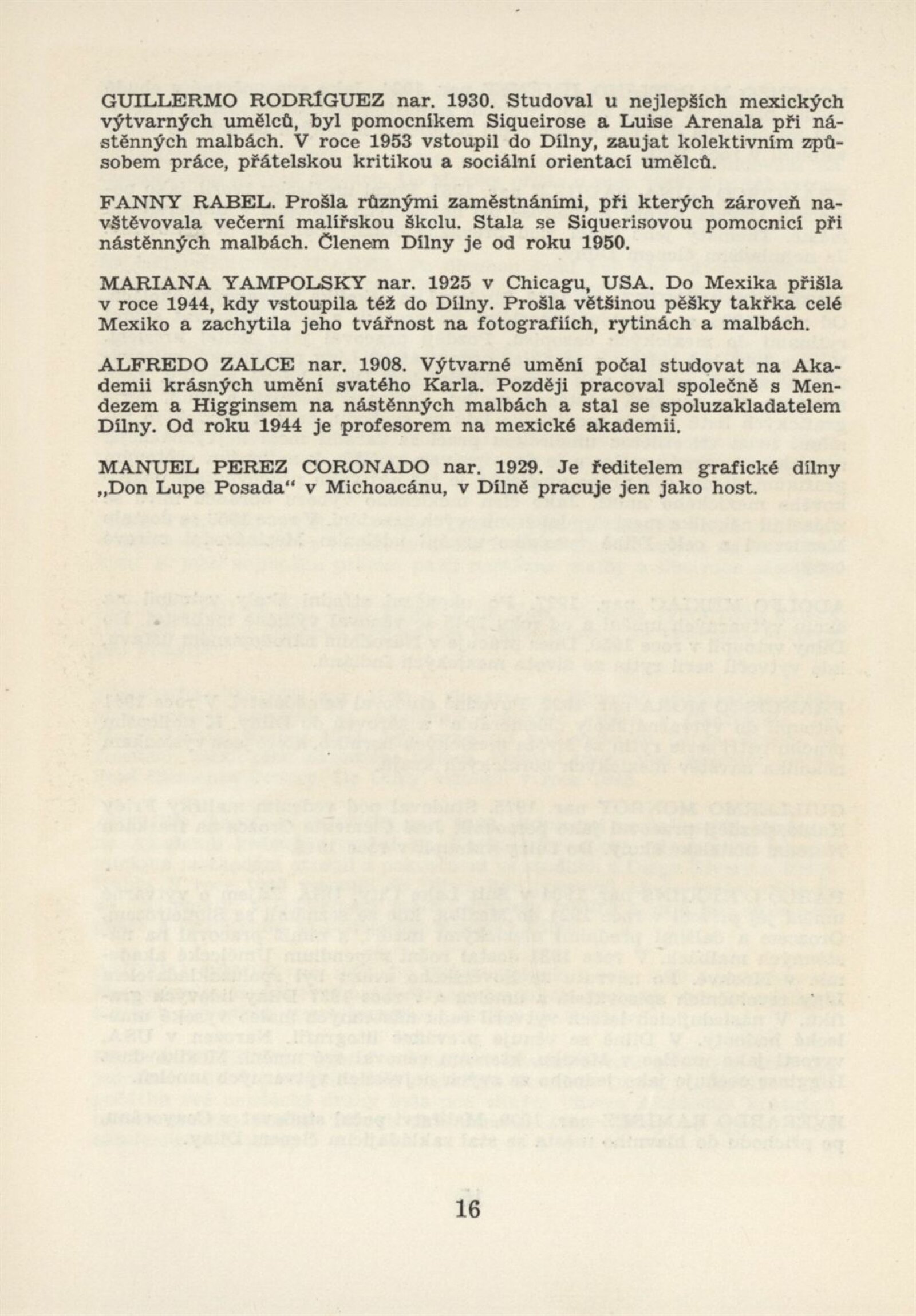Ignacio Aguirre, Angel Anguiano, Raul Anguiano, Luis Arenal, Alberto Beltrán, Roberto Berdecio, Angel Bracho, Arturo Garcia Bustos, Cellia Calderón, Gustavo Casillas, Elizabeth Catlett, Manuel Pérez Coronado, Erasto Cortés, Jesús Escobedo, Antonio Franco, Oscar Frías, Andrea Goméz, Elena Huerta, Lorenzo Jiménez, Erasto Cortés Juáres, Francisco Luna, Leopoldo Mendéz, Adolfo Mexiac, Guillermo Monroy, Francisco Mora, Chávez Morado, Isidoro Ocampo, Pablo O'Higgins, Fernando Castro Pacheco, José Guadalupe Posada, Fanny Rabel, Maria De Jesús Ríos, Guillermo Rodríguez, Mariana Yampolsky, Alfredo Zalce