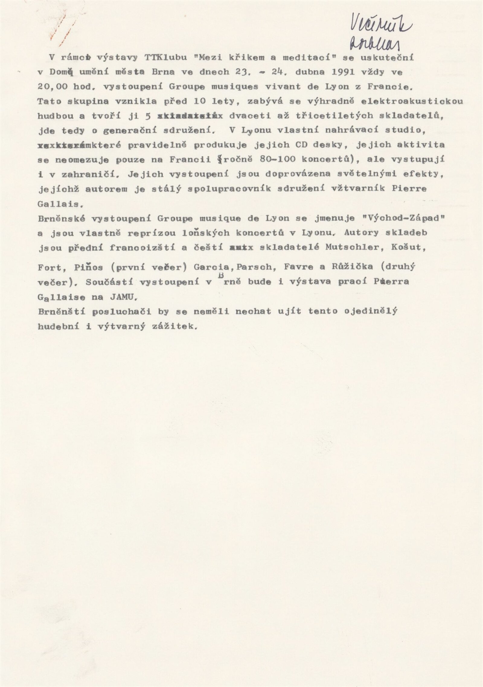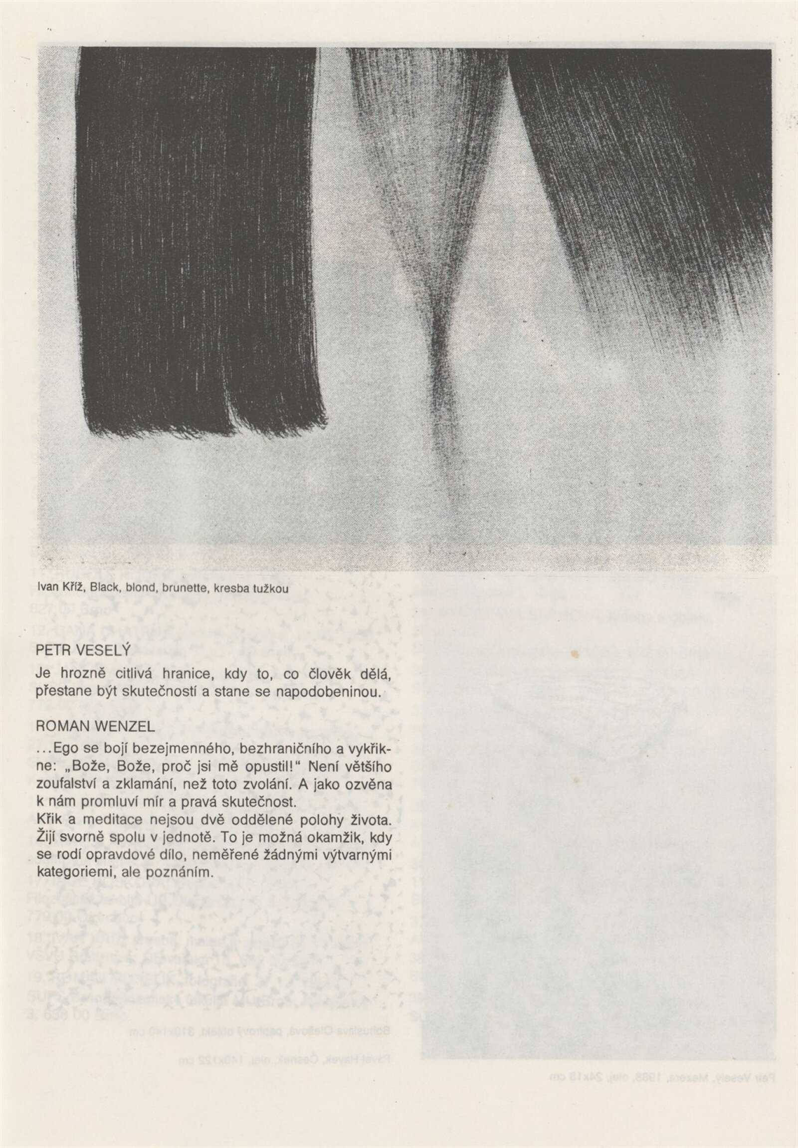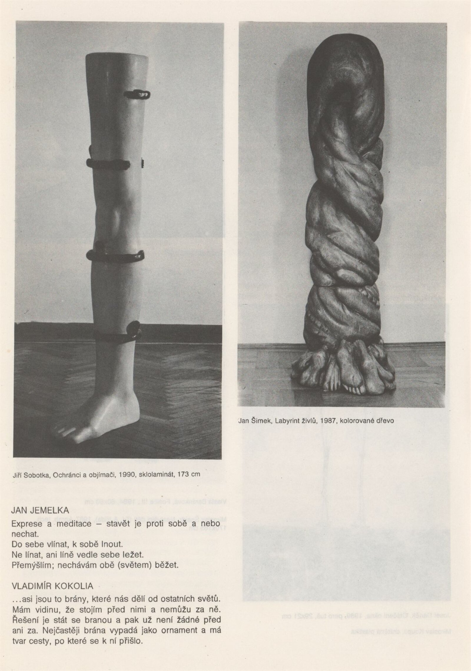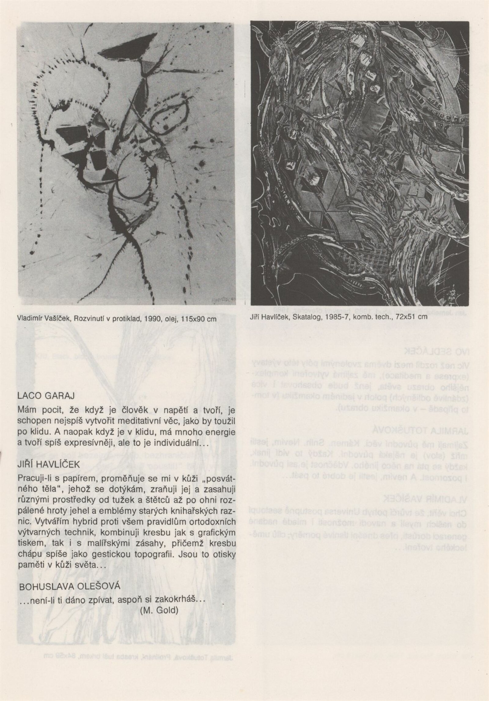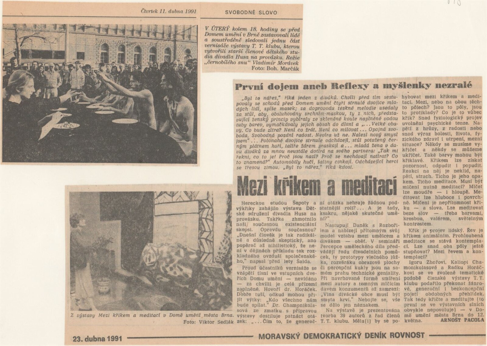 Mezi křikem a meditací: Dům umění města Brně, 9. 4. – 12. 5. 1991 / Výstava členů T. T. klubu. Text: Igor Zhoř, Radek Horáček, Kaliopi Chamonikola. – Brno: DUmB, 1991. – [15] s., obr., DU 898. – MZK; MG